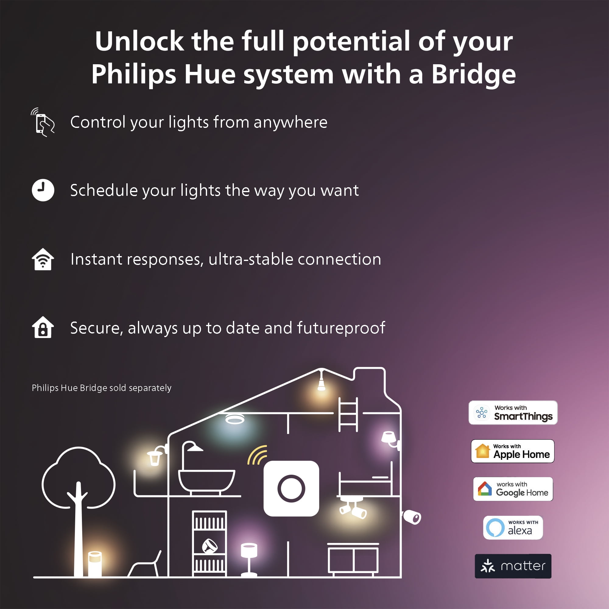 UNLOCK THE FULL POWER OF HUE WITH INCLUDED BRIDGE – Enjoy automations, control from anywhere in the world, and a secure, stable connection that won’t drain your Wi-Fi. Use Matter to connect your smart home devices to your Hue smart lighting system. MILLIONS OF COLORS – The White & Color Ambiance range offers both warm-to-cool white and millions of colors straight out of the box. Simply screw it in! Once in your fixture, our smart LED bulbs can dim, brighten, and set the mood instantly. ENJOY PRESET SCENES – Dims and brightens, turns lights on and off, cycles between four of your favorite scenes or provides the right light based on time of day VOICE CONTROL – Convenient smart control; Set up voice control in the Hue app and use simple voice commands to control your lights with Alexa or Google Assistant SET UP – Mount dimmer switch to the wall with included adhesive, mount to a metal surface with the magnetic backing, or remove the switch from the plate to use as a remote. Open Hue app and follow the prompts to connect dimmer switch to your Bridge. PERSONALIZE YOUR LIGHT – Customize with your favorite Hue scenes; energize, concentrate, read and relax. Press once to turn Hue lights on/off, press and hold to dim or brighten