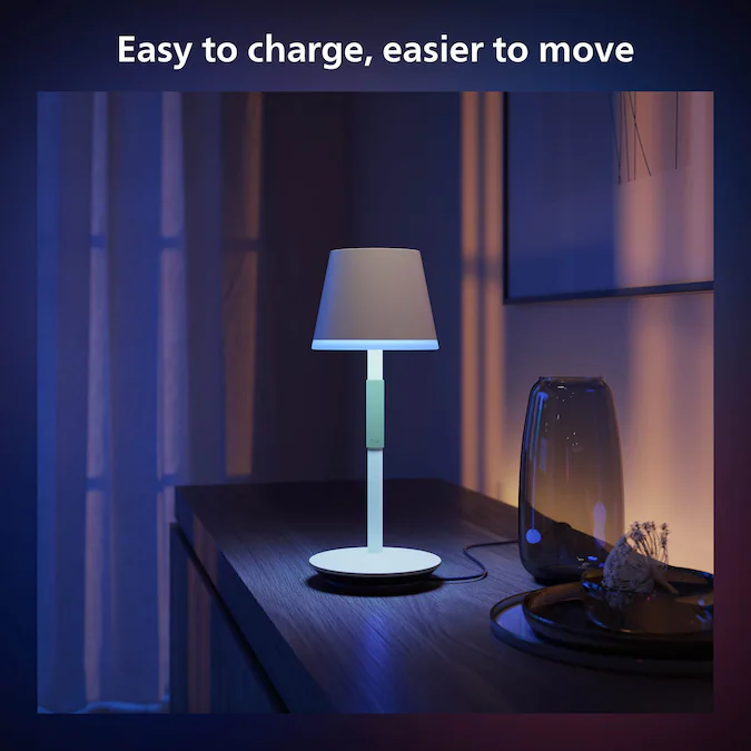 - Easy to charge, easier to move – It’s long battery life lets you take the Philips Hue Go portable lamp with you anywhere for up to 48 hours – Recharge it byplacing the lamp back onto it’s charging base