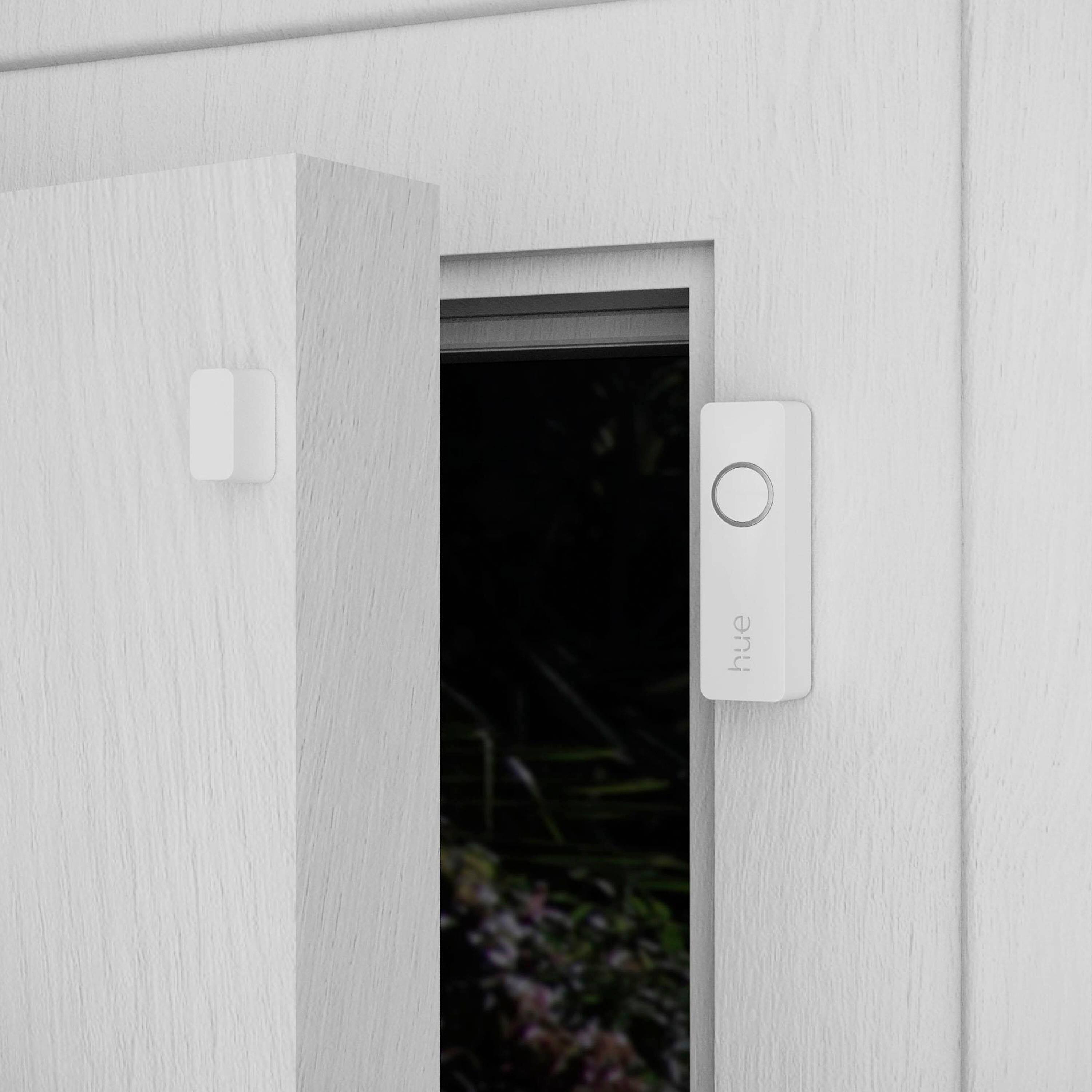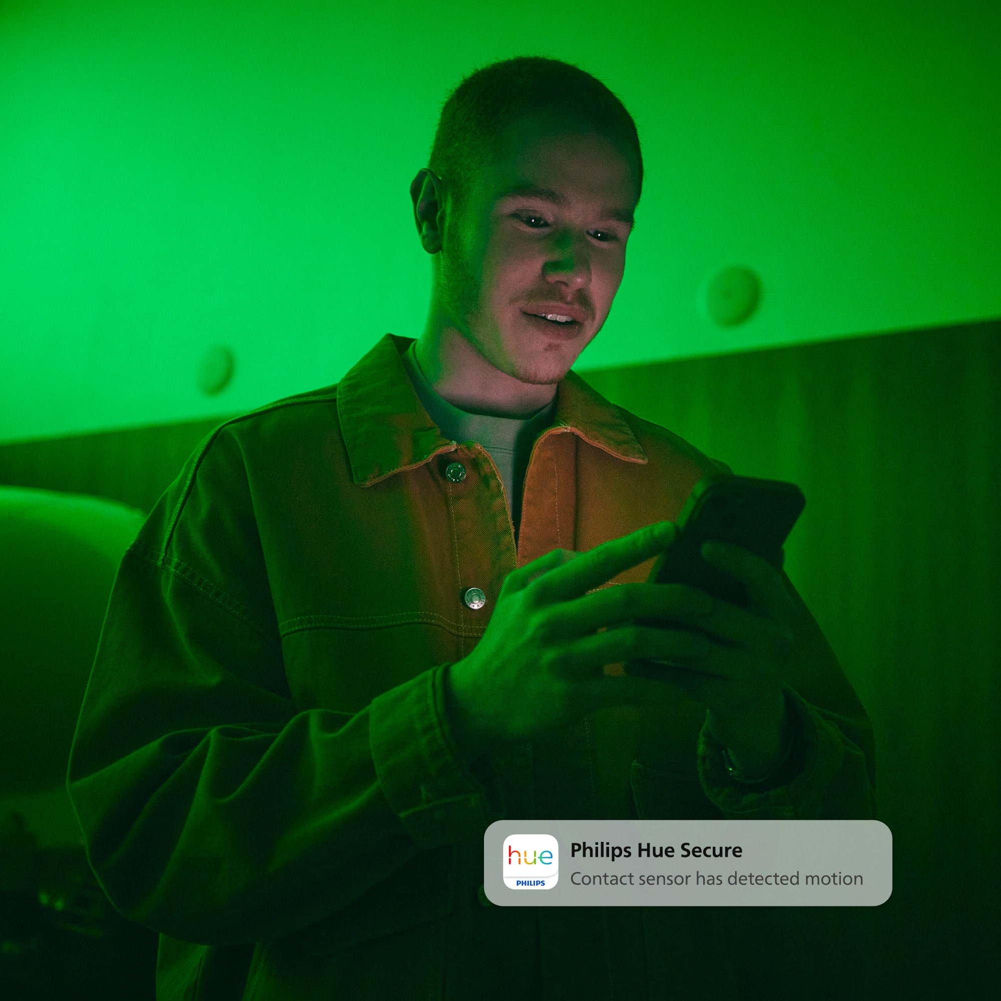 Start safeguarding your home by monitoring it in real-time with this Philips Hue Secure starter kit. The smart home security system comes with three Secure contact sensors in white, one indoor motion sensor, two White and color ambiance E26 bulbs, and a Bridge. Give yourself peace of mind both home and away by letting the Secure contact sensor provide your doors, windows, cabinets, safes, and more, with an extra layer of security. When the contact sensor is opened, or tampered with, it can let you know in real time by sending an alert to your mobile device.