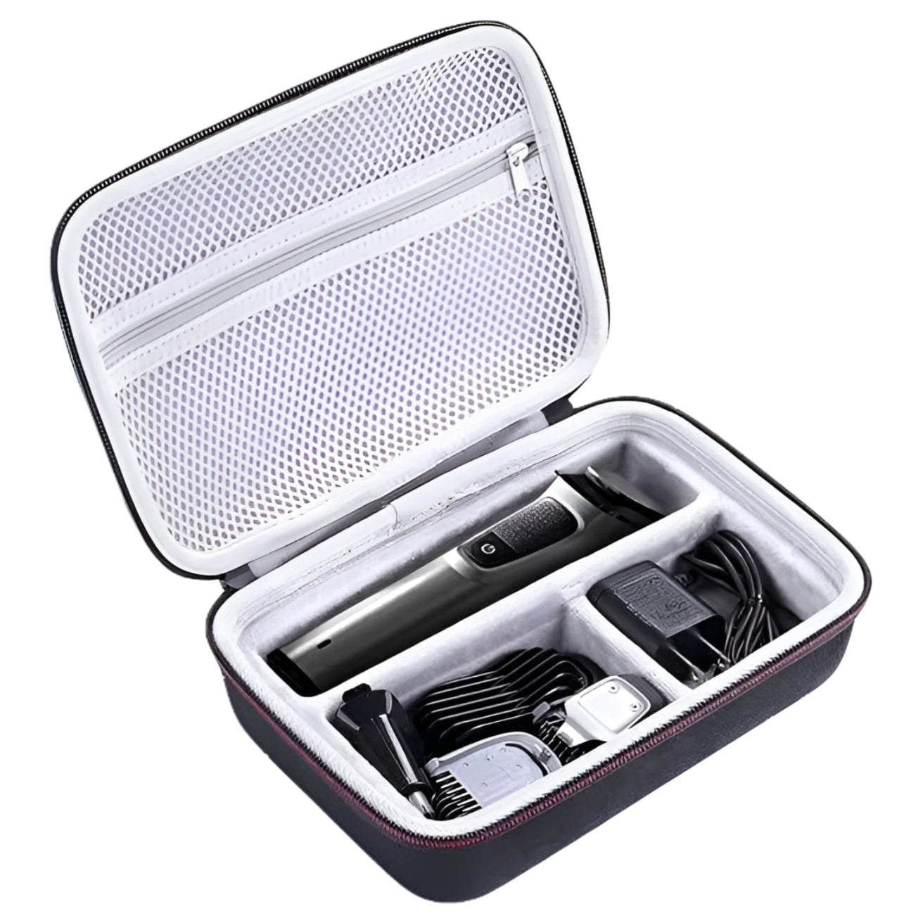 Trim and style your face, head and body with 23 pieces – 23 pieces for all your trimming needs: a metal trimmer, a foil shaver, a detail metal trimmer, a nose and ear trimmer, an extra-wide hair trimmer, 6 hair trimming guards, 3 beard trimming guards, 2 stubble trimming guards, 2 body trimming guards, an eyebrow trimming guard, a storage bag and a cleaning brush.