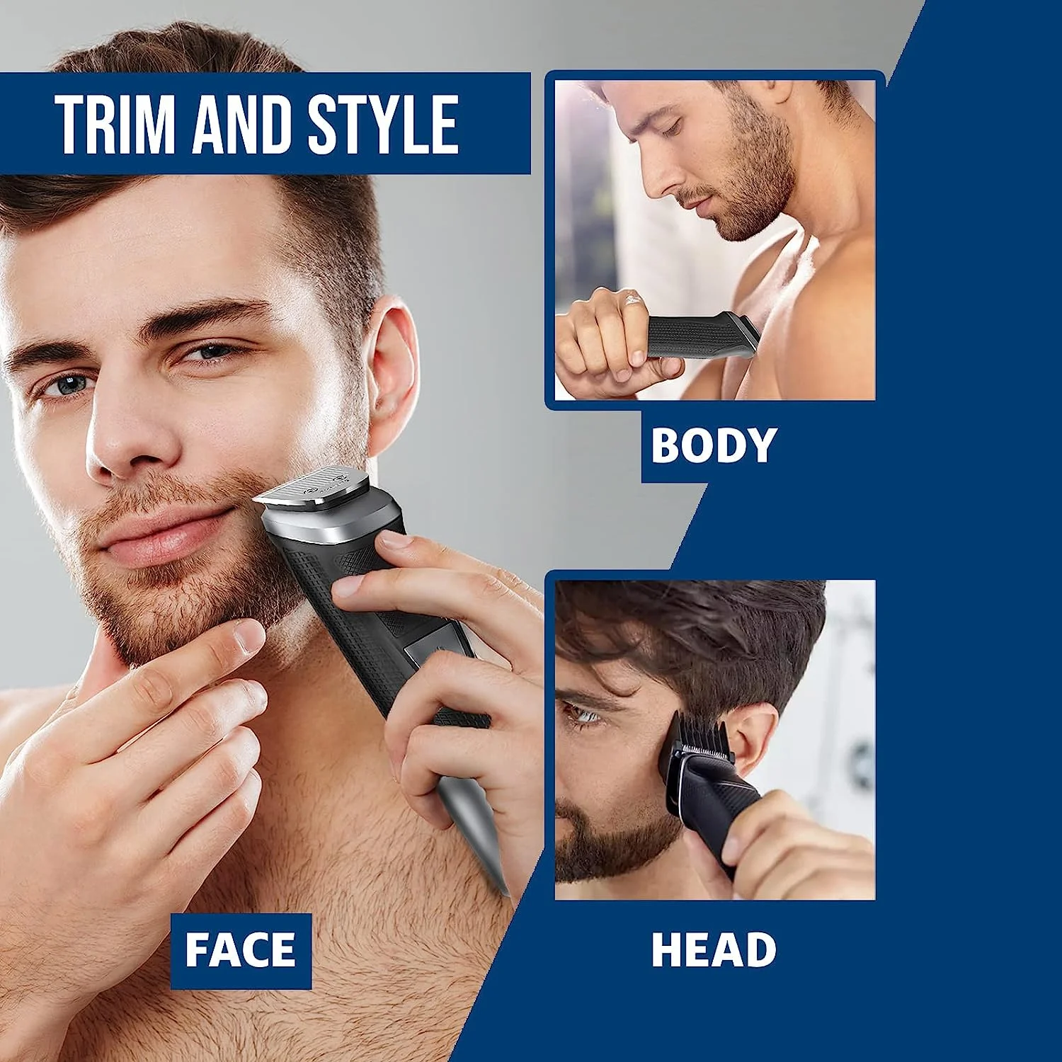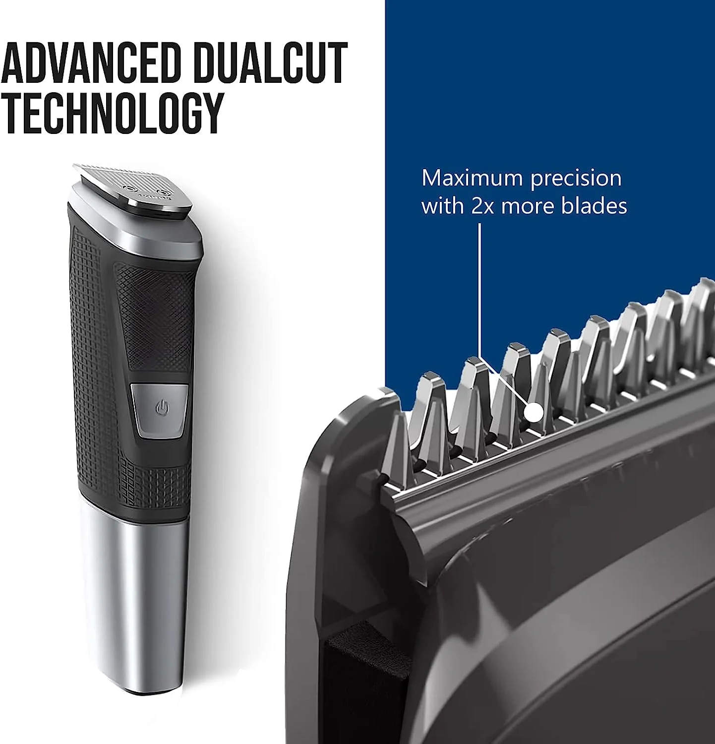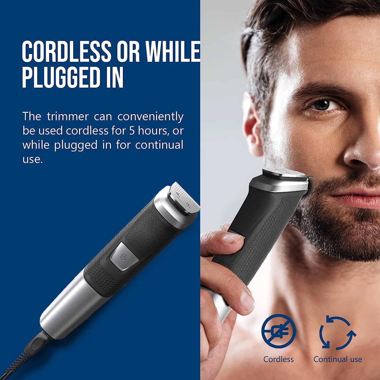 The Philips Multigroom 5000 offers exceptional value for your grooming needs. With tempered steel cutting blades that self-sharpen and won’t rust, this durable trimmer includes impact-resistant cutting guards, a steel reinforced motor, and a powerful lithium-ion rechargeable battery delivering up to 3 hours of run time. The blades and guards can be rinsed clean, and the device comes with a 45 day risk-free trial and a full 2-year warranty. Not for use in the shower. The trimmer includes 18 pieces to trim your face, head and body hair. Contents include steel trimmer, steel Detailer, nose and ear Trimmer, extra-wide hair trimmer, 3 Beard trimming guards, 2 stubble trimming guards, 6 hair trimming guards, 2 Body trimming guards, accessory travel storage bag, and cleaning brush.