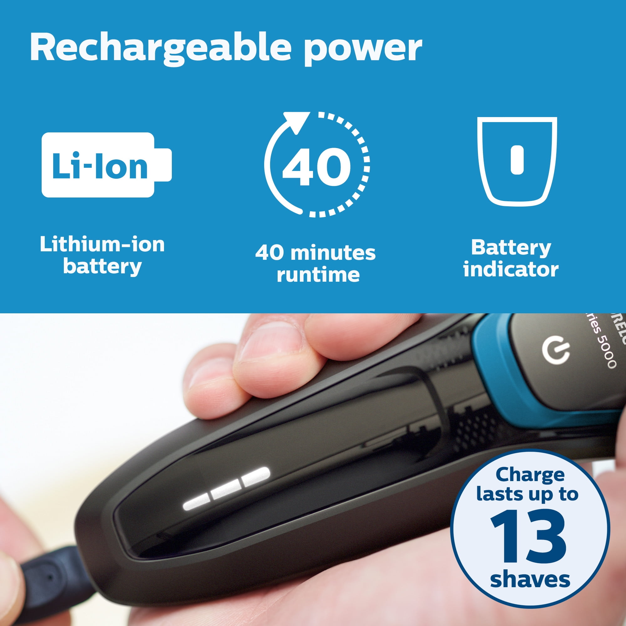 Philips Norelco Shaver 5300 adds more comfort to your morning routine. MultiFlex heads adjust to the angles of your face with 5 independent movements. The entire head pivots and the individual shave heads flex to maintain skin contact and catch hair in hard-to-reach areas. The MultiPrecision Blade system raises and cuts long hairs, flat-lying hairs and short stubble in just a few strokes. Get a convenient dry shave or a more refreshing wet shave with gel or foam, even in the shower. Finish your look with the click-on precision trimmer, which is ideal for maintaining your mustache and trimming your sideburns.A powerful Li-ion battery delivers 40 minutes of cordless shaving and fully charges in 1 hour. A 5-minute quick charge provides enough power for one shave. One-touch open allows for easy cleaning; simply pop-open the heads and rinse with warm water. The intuitive display shows relevant information, enabling you to get the best performance out of your shaver: 1-level Battery Indicator, cleaning indicator, battery low indicator, and replacement head indicator. Electric shaver, click-on precision trimmer, power cord and protective cap