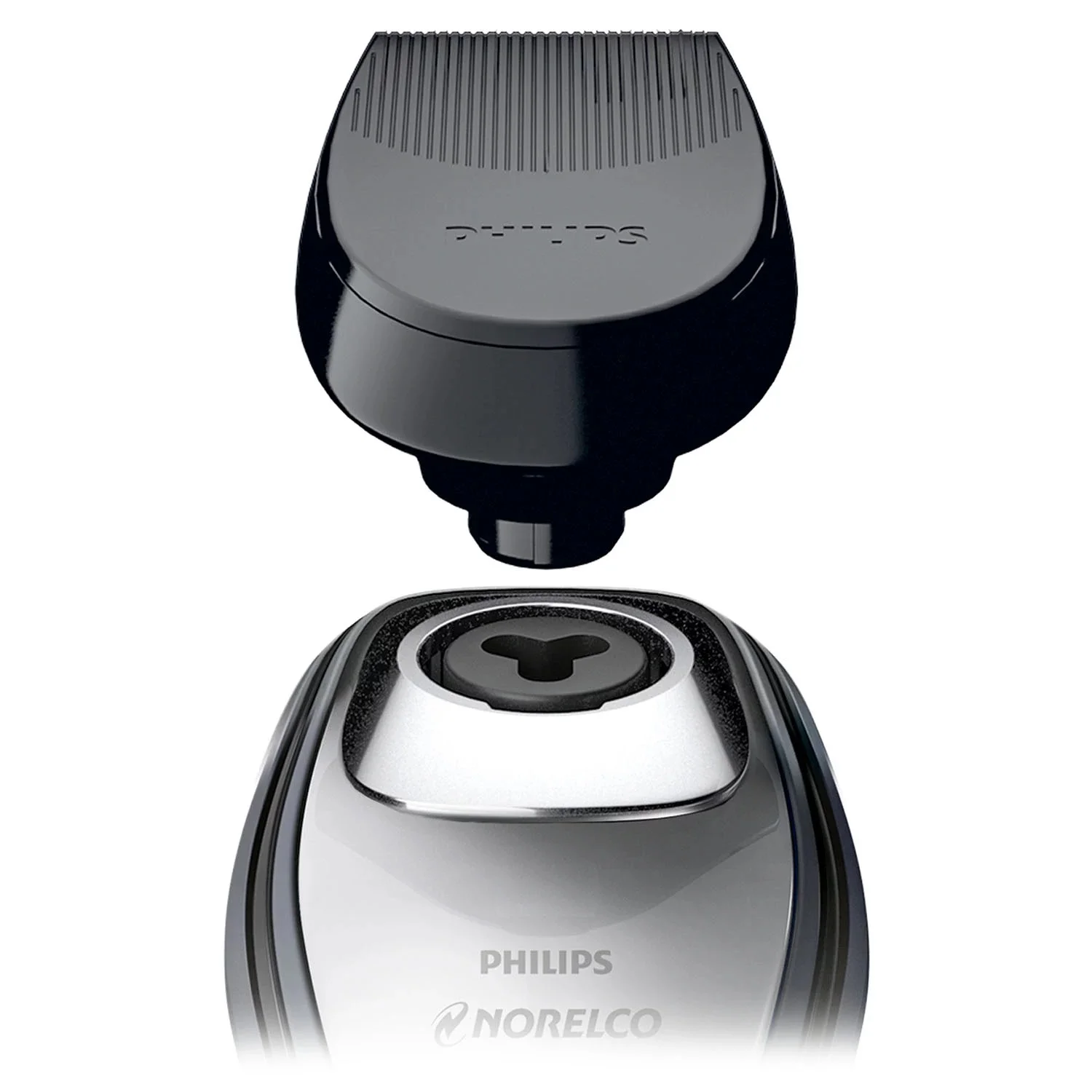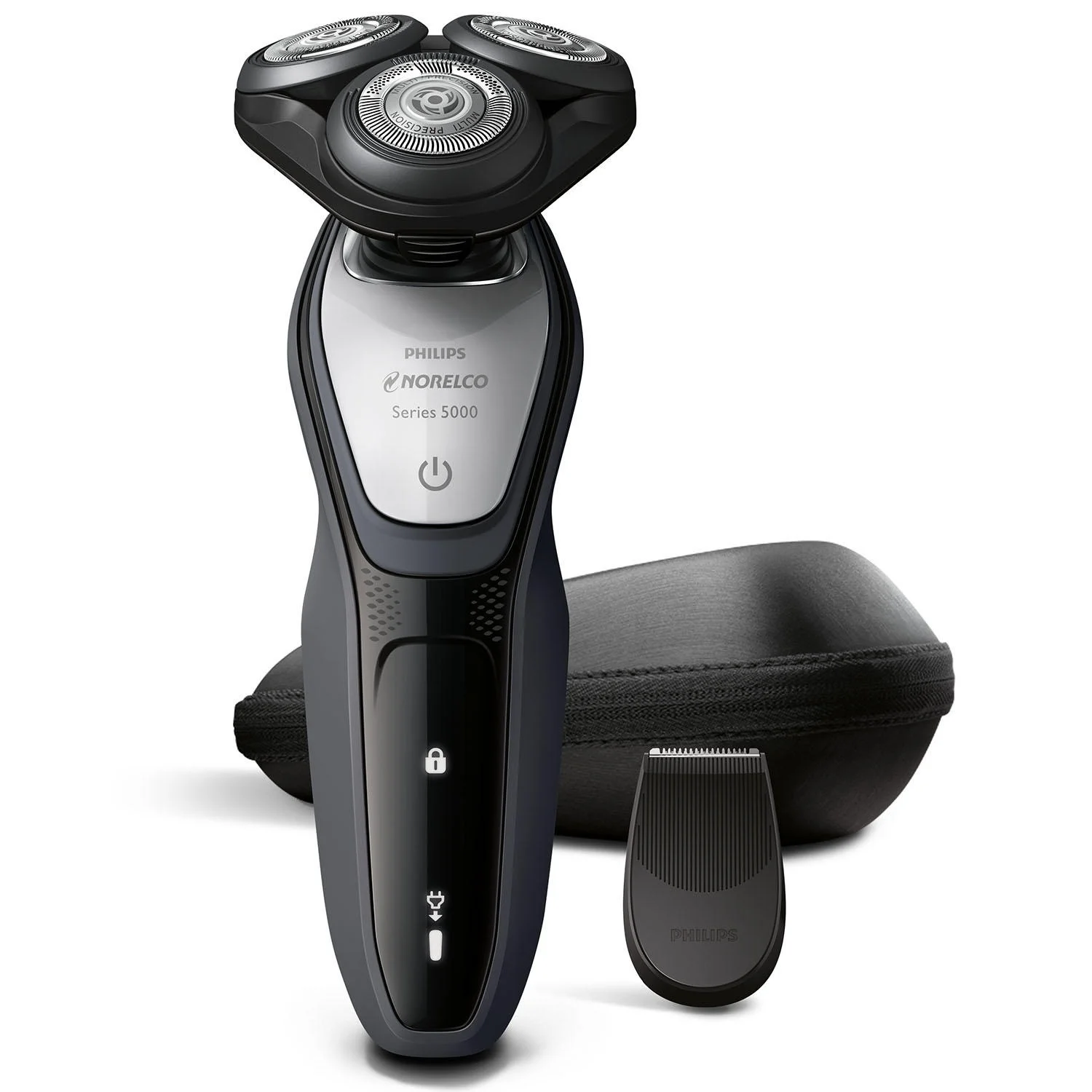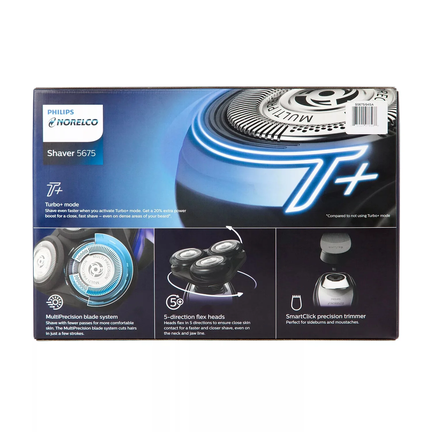Philips Norelco 5675 Shaver With Replacement Shaving Heads and Premium Hard Travel Case Included: -Shaver -SmartClick Precision Trimmer -Power Cord -Travel Case -Replacement Shaving Heads Features: -Turbo+ Mode Shave even faster when you activate turbo+ Mode Get an extra 20% extra power boost for a close, fast shave -MultiPrecision Blade System Shave with fewer passes for more comfortable skin The MultiPrecision blade system cuts hairs in just a few strokes -Five(5) Direction Flex Heads Heads flex in 5 directions to ensure close skin contact for a faster and closer shave, even on the neck and jaw line -SmartClick Precision Trimmer Perfect for sideburns and moustaches -3 Level Indicator LED display indicates battery status and when its time to charge -Wet Or Dry Shave in the shower or use wet with foam or gel for a refreshing comfortable shave -Lithium-Ion Power 60 Shaving minutes after a 1 hour charge