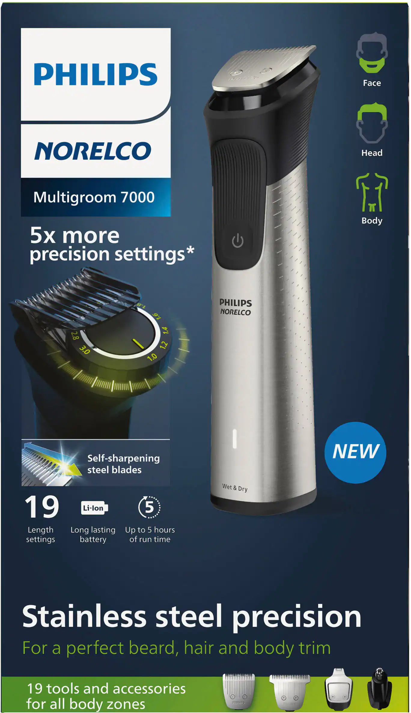 The Philips Norelco Multigroom 7000 provides stainless steel precision with 19 tools and accessories for a perfect beard, hair and body trim. The precision trimming guard provides 5x more precision settings vs the predecessor. Plus, the 3-7mm adjustable comb provides even more grooming options for a personalized look. The Multigroom 7000 also has Smart BeardSense technology to boost power exactly when you need it to tackle dense, bushy or long beards. The self-sharpening stainless steel blades remain sharp as day one for long lasting performance, no oil required. The steel frame and rubber grips deliver superior control and the Lithium-ion battery yields 5 hours of runtime. USB-A charging cable included (wall power adapter not included).