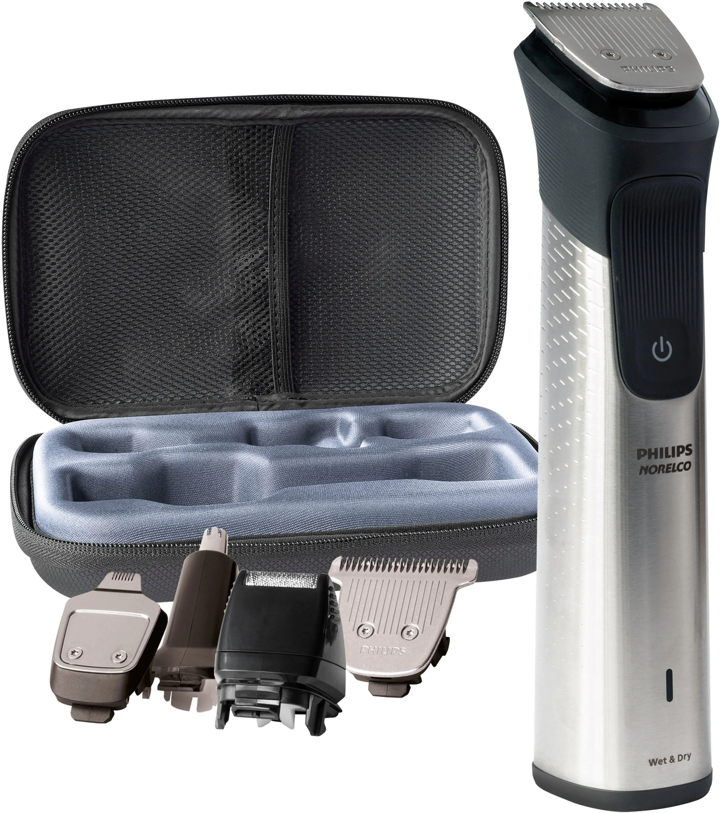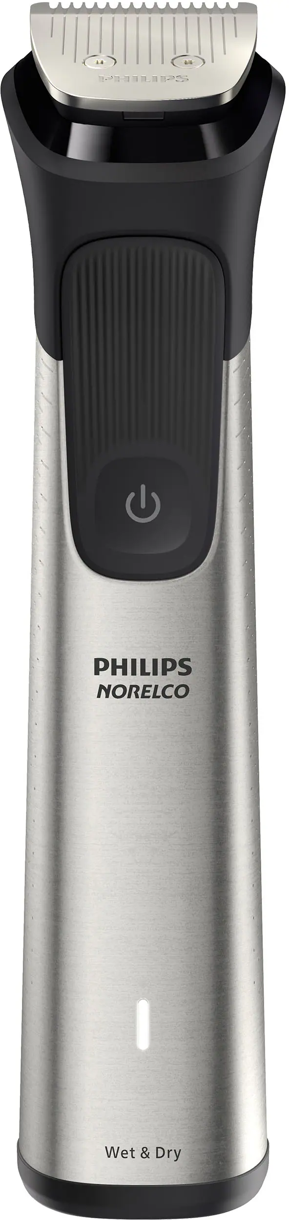 Stainless steel precision for a perfect beard, hair and body trim. The Philips Norelco Multigroom 9000 will help you perfect your personal style with our most precise and versatile trimmer. Craft your personal look with this premium stainless steel trimmer, which includes 21 quality tools and accessories for styling your face, head and body. The precision trimming guard delivers a precise trim at the exact length you want, with 5x more precision settings vs the predecessor. The Philips Norelco Multigroom 9000 comes equipped with a body shaver attachment to efficiently shave body hair while protecting skin. The Multigroom 9000 also has Smart BeardSense technology to boost power exactly when you need it to tackle dense, bushy or long beards. The self-sharpening stainless steel blades remain sharp as day one for long lasting performance, no oil required. Plus, the steel frame and rubber grips deliver superior control and the Lithium-ion battery yields 6 hours of runtime. A premium storage case helps you stay organized and is convenient for travel. USB-A charging cable included (wall power adapter not included)