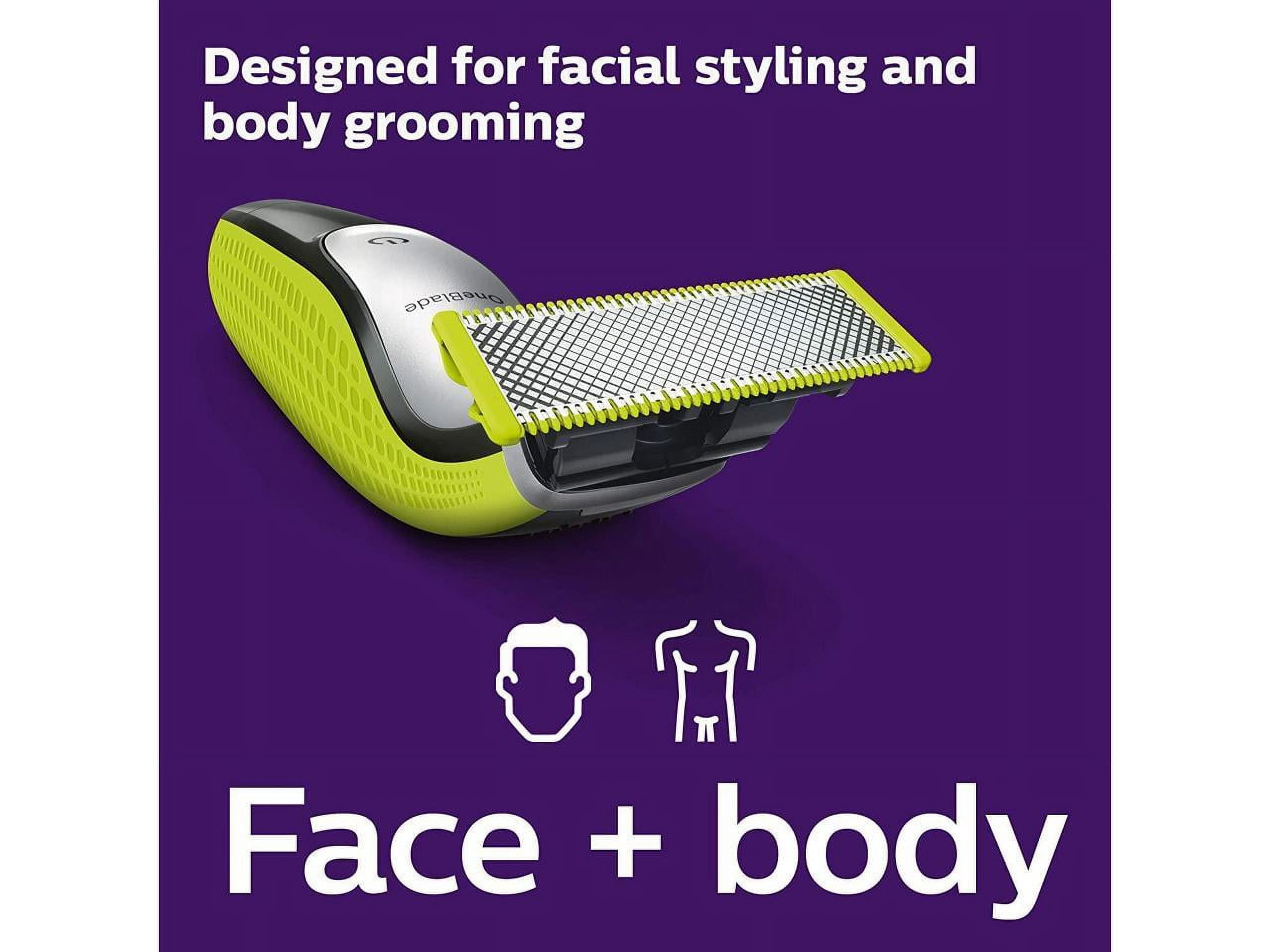 Trim, edge and shave any length of hair Designed to cut hair, not skin Philips OneBlade Face + Body trims, edges and shaves any length of hair. You get a blade for your face, and one with a skin guard for your body. Forget about using multiple tools. OneBlade does it all. Comfortable shave Unique OneBlade technology Shave it off Guards against nicks on sensitive areas Sharp edges Edge it up Create precise edges and sharp lines Even trim Trim it down Stubble combs for more choices Easily trim in any direction Easy to use Each blade lasts 4 months Use wet or dry Charge up and go