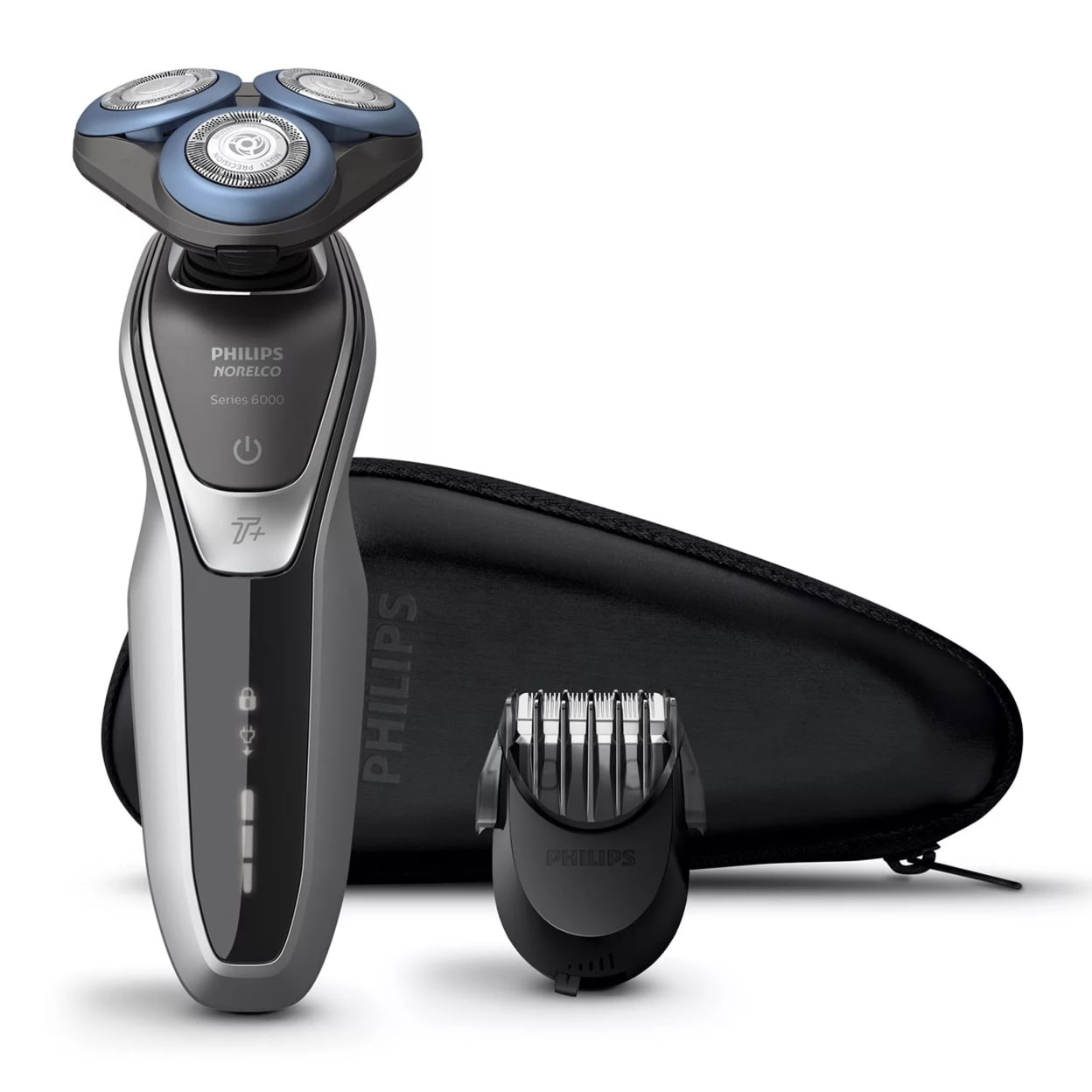 Philips Norelco Shaver 6500 Wet & Dry Electric Shaver Philips Norelco Shaver 6500 shaving heads are surrounded with ComfortGlide rings, which have special protective coating witk skin gliding properties to shield your face from irritation. MultiFlex shaver heads adjust to the angles of your face with 5 independent movements. The entire head pivots and the individual shave heads also flex to maintain skin contact and catch hair in hard to reach areas. MultiPrecision blades raise and cut long hairs, flat-lying hairs and short stubble in just a few strokes for a more comfortable shave. Delivers a convenient dry shave or a more refreshing wet shave with gel or foam, even in the shower. Lithium-ion battery provides up to 60 minutes of cordless shaving. Fully charges in 1 hour or 5 minute quick charge for one shave. Get a 20% power boost for a close, fast shave with Turbo+. Cleaning is easy as you just pop the head open and rinse thoroughly. Philips Norelco Shaver 6500 includes electric shaver, click-on beard styler, travel case, SH50 replacement heads, and power cord. The click-on beard styler can help you change your look with 5 length settings. Within a year, your shaver heads cut 4.5 million hairs on your face. Replace the shaver heads and get back to peak performance. The convenient and durable hard travel case is designed to store and protect your shaver whether you are at home or on-the-go.
