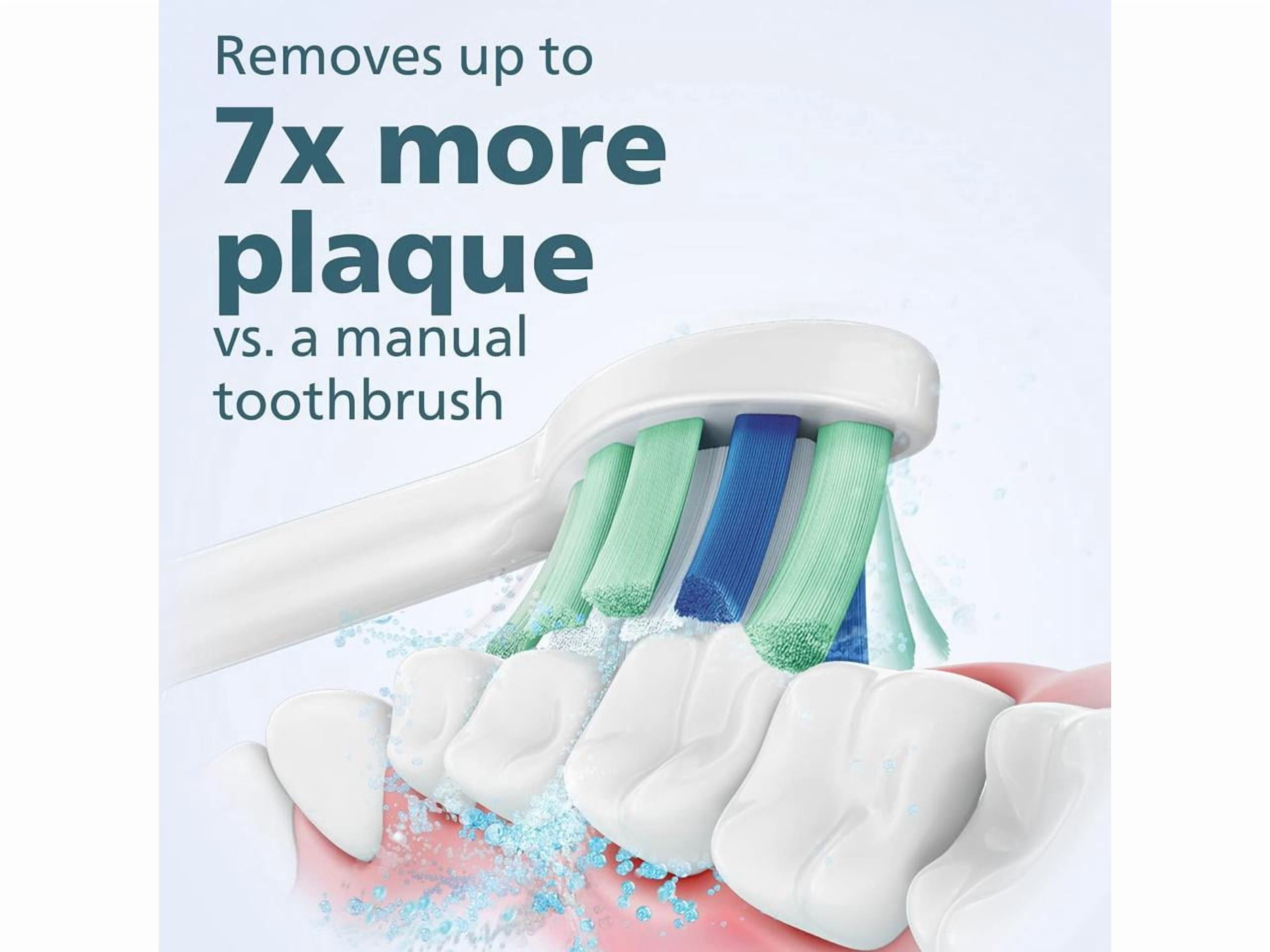 Removes up to 7x more plaque vs. a manual toothbrush Pressure sensor and two intensity settings protect sensitive gums from overbrushing 2 minute SmarTimer with QuadPacer ensure Dentist-recommended brushing time Brush head replacement reminder ensures your brush head is always effective Long battery life with battery light indicator: One charge last for 2 weeks Includes: 1 Philips Sonicare 4100 handle, 1 Optimal Plaque Control (C2) brush head, and 1 USB charger (wall adaptor not included) Subscribe & Save on genuine Philips Sonicare brush head replacements and save up to 15%. SRG, Test Report, CIPS918151 (2021)