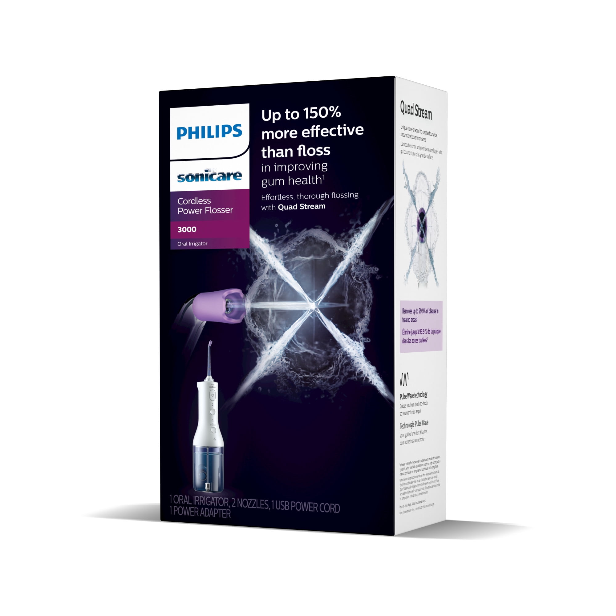 Up to 150% more effective than floss in improving gum health* Disclaimer: Between teeth, after two weeks, in patients with moderate to severe gingivitis, when used with Quad Stream nozzle on high setting with a manual toothbrush vs. using manual toothbrush with string floss Removes up to 99% of plaque from below the gumline* Disclaimer: In a lab study (actual results may vary), in the deepest 2mm of a 6mm periodontal pocket model.Cordless with 14-day battery life for ultimate convenience, can be used in the shower 2x as effective as floss in removing interdental plaque*Disclaimer: In hard to reach areas, after two weeks, in patients with moderate to severe gingivitis, when used with Quad Stream nozzle on high setting with a manual toothbrush vs. using manual toothbrush with string floss Quad Stream delivers four wide streams of water that penetrate deep between teeth and along the gumline, covering 9x the surface area of single stream flossers*Disclaimer: In a lab study, actual results may vary 2 flossing modes and 3 intensity settings 14-day battery life for ultimate convenience and shower use, plus a whisper quiet design for a discreet clean Cordless design is slim, portable, and requires effortless technique. 360-degree nozzle rotation ensures you can reach every corner of your mouth