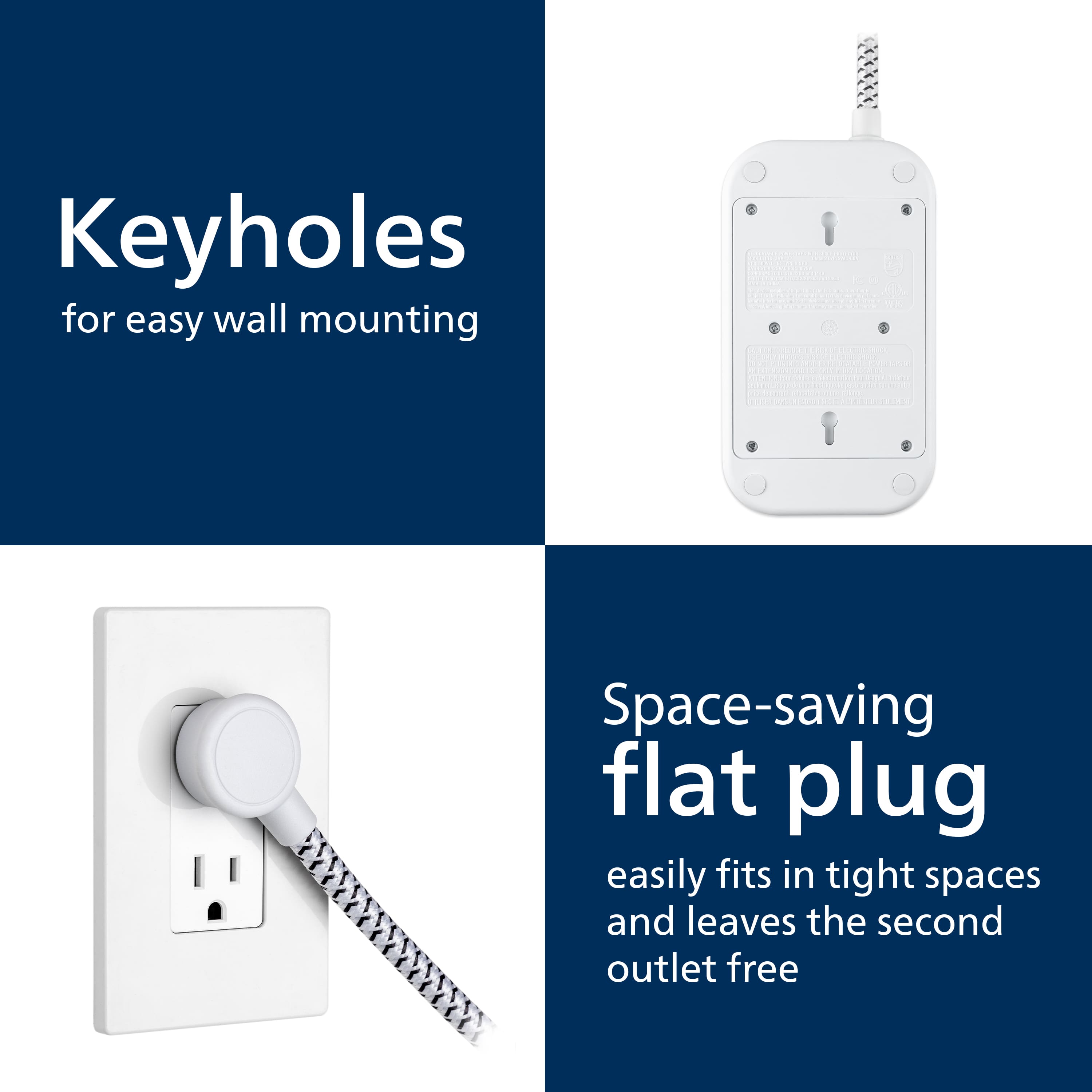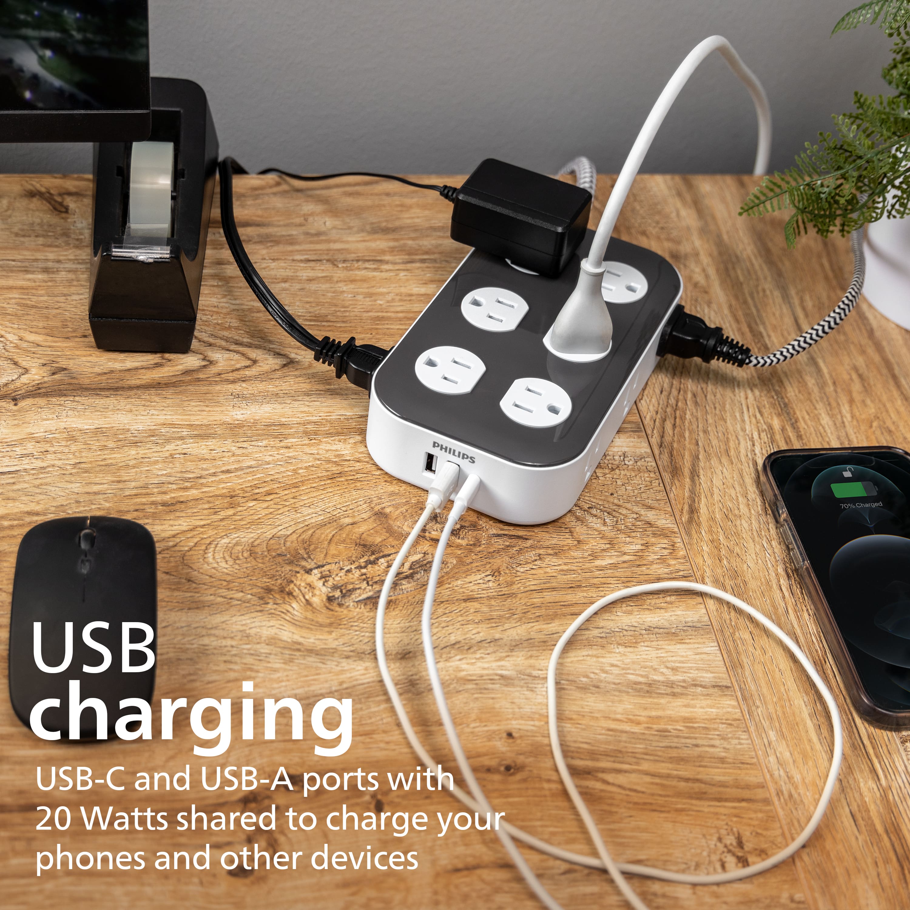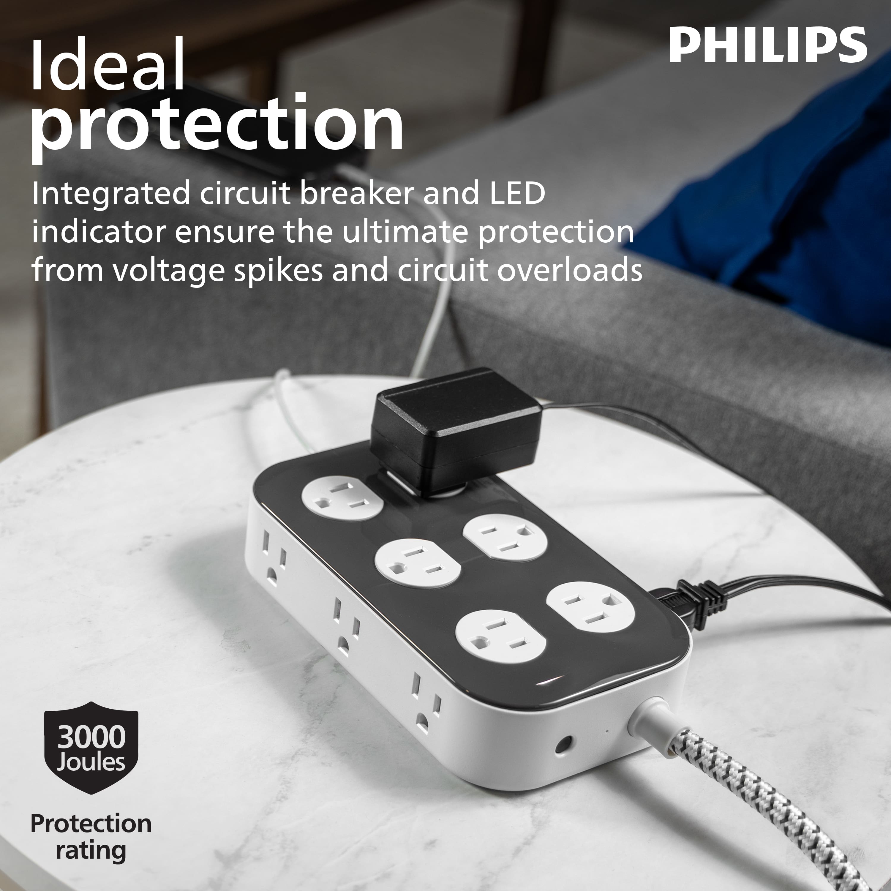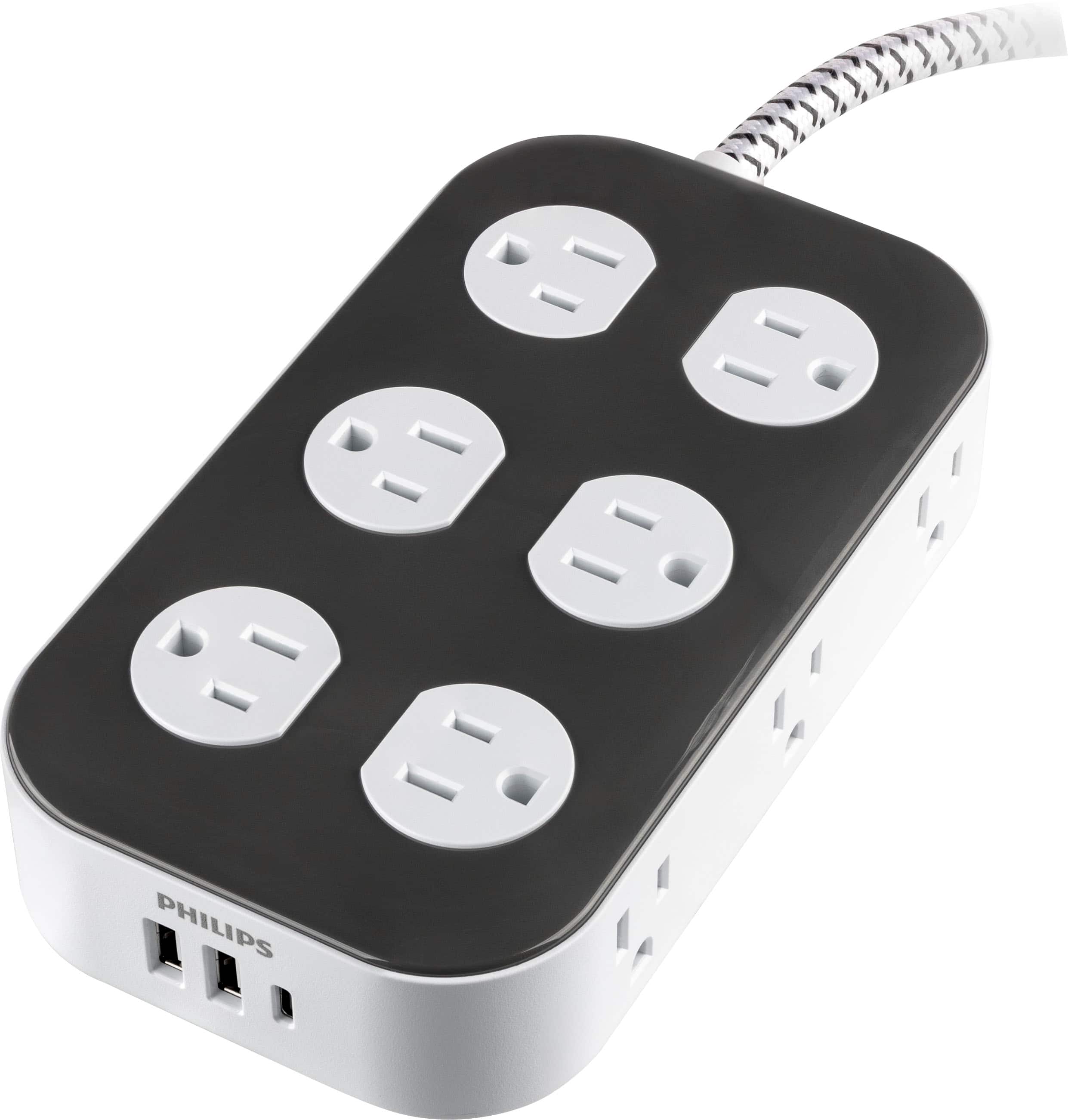 Maximize power with the Philips Adapt 12-Outlet Surge Protector with USB Charging. This essential surge protector converts one three-prong outlet into 12 grounded outlets perfectly spaced to accommodate bulky plugs and adapters. This power hub features two USB-A ports and one USB-C port to keep smartphones and tablets charged and ready to go. Power and protect electronics, small household appliances, mobile devices and more. With 3,000 Joules of surge protection and an integrated circuit breaker with reset button and LED indicator light, your connected electronics are protected from harmful power surges and voltage spikes. Sleek and stylish, this two-tone dark gray and white surge protector complements your décor with its rounded edges, durable gray and white fabric cord and dark gray flat plug. The 6ft. braided cord is perfect for versatile setups and prevents bends and tangles, extending its longevity. The space-saving round flat plug fits in tight spaces and is perfect when outlets are located behind furniture. This high-quality surge protector is ETL listed and backed by a limited-lifetime, no-hassle replacement plan as well as a $300,000 CEW policy for added peace of mind. Confidently protect your essential devices with the Philips Adapt 12-Outlet Surge Protector with USB Charging.