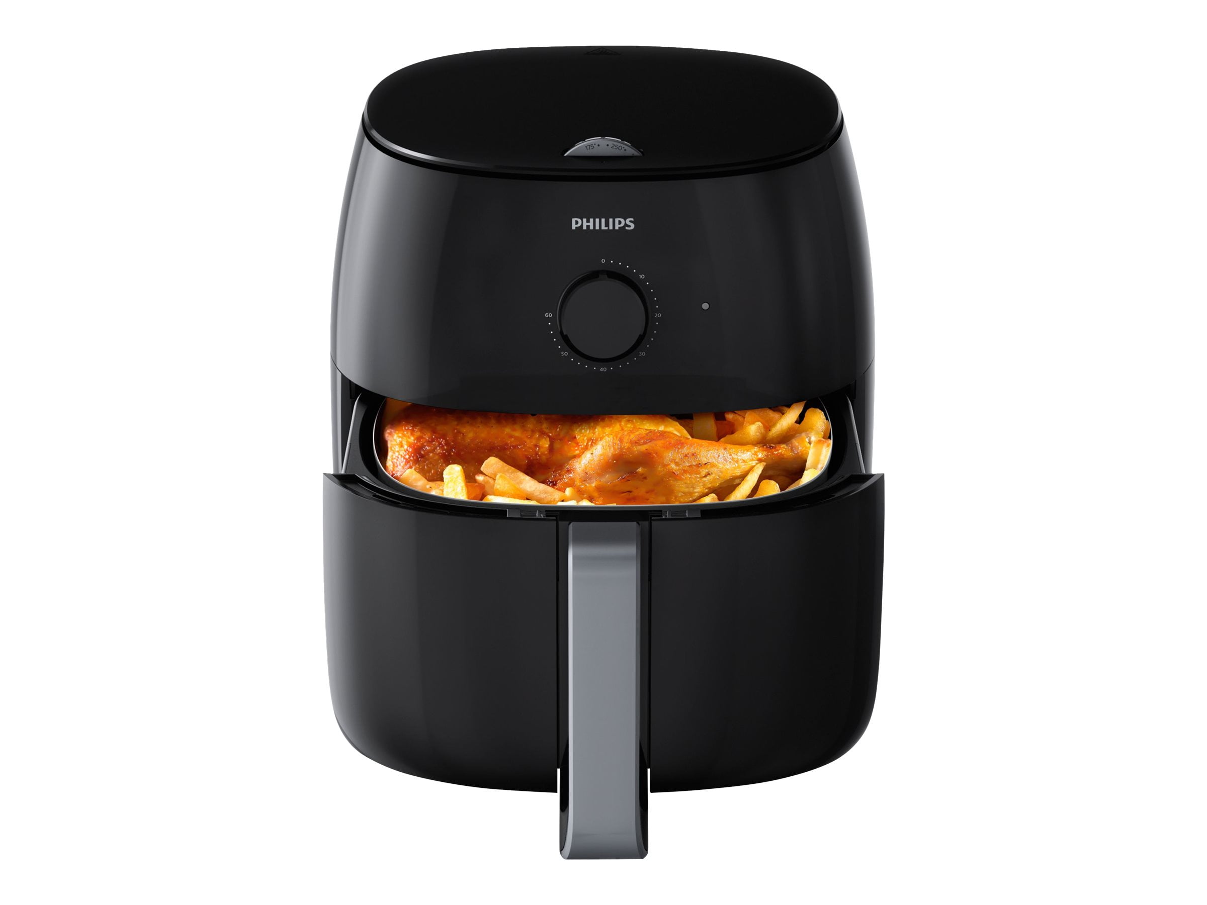 Uses hot air to cook foods with little to no added oil; up to 1.5x faster than an oven; no preheating required 3-lb./4-qt. capacity; XXL family size fits a whole chicken or 3 lbs. (1.4 kg) of fries Ability to fry, bake, grill, roast, and reheat Fat Removal technology separates and captures excess fat Rapid Air technology creates 7x faster airflow for delicious, crispy results Hundreds of recipes in app and free recipe book included QuickClean basket with removable nonstick mesh inserts, removable drawer with nonstick coating, and any other removable parts are dishwasher-safe Includes user manual