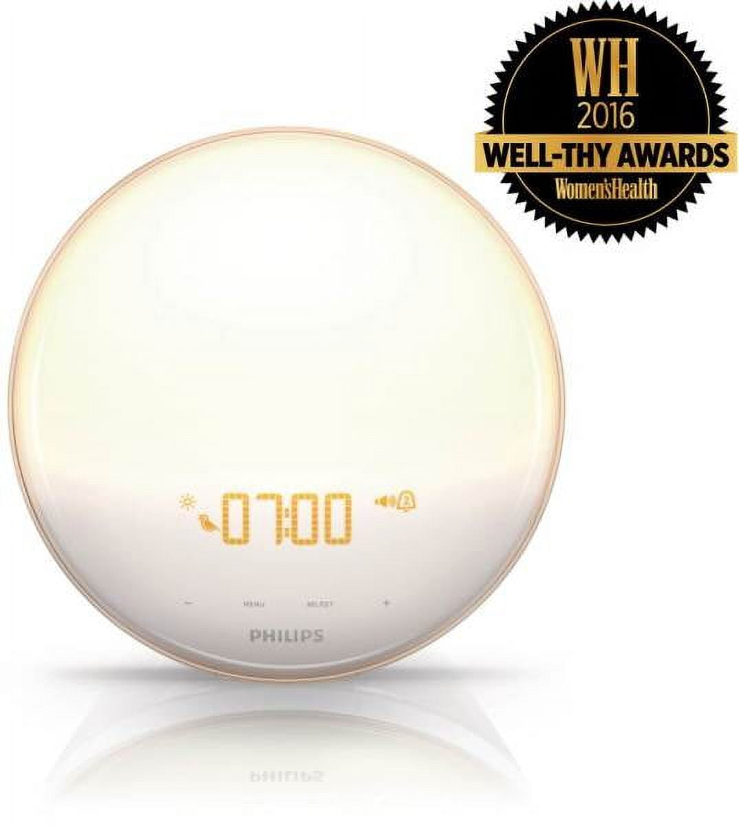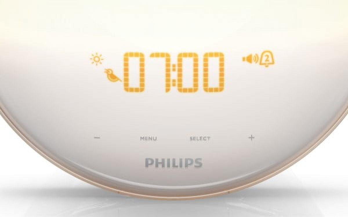 Clinically proven by scientists; Features coloured sunrise simulation; 5 wake up sounds & FM radio; Coloured Sunrise Simulation wakes you naturally; Dimming light & sound gently send you off to sleep; 20 brightness settings to fit your personal preference; Choice of 5 different natural wake up sounds; FM radio let’s you wake up with your favorite radio show; Display automatically dims itself when the bedroom gets dark; Just tap the product to snooze; The only Wake-up Light clinically proven to work by scientists; Independent research* shows that 92% of Philips users find it is easier to get out of bed