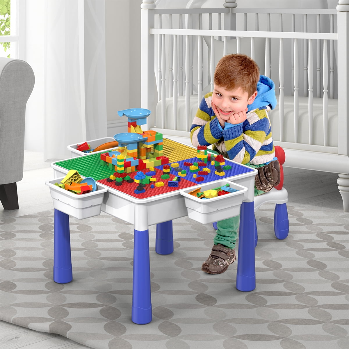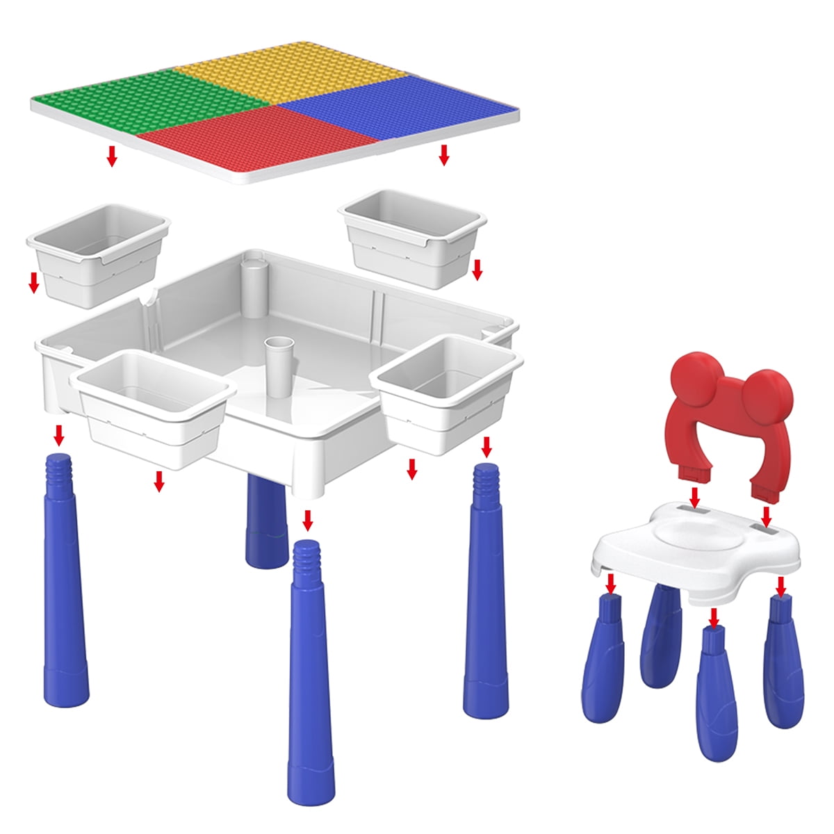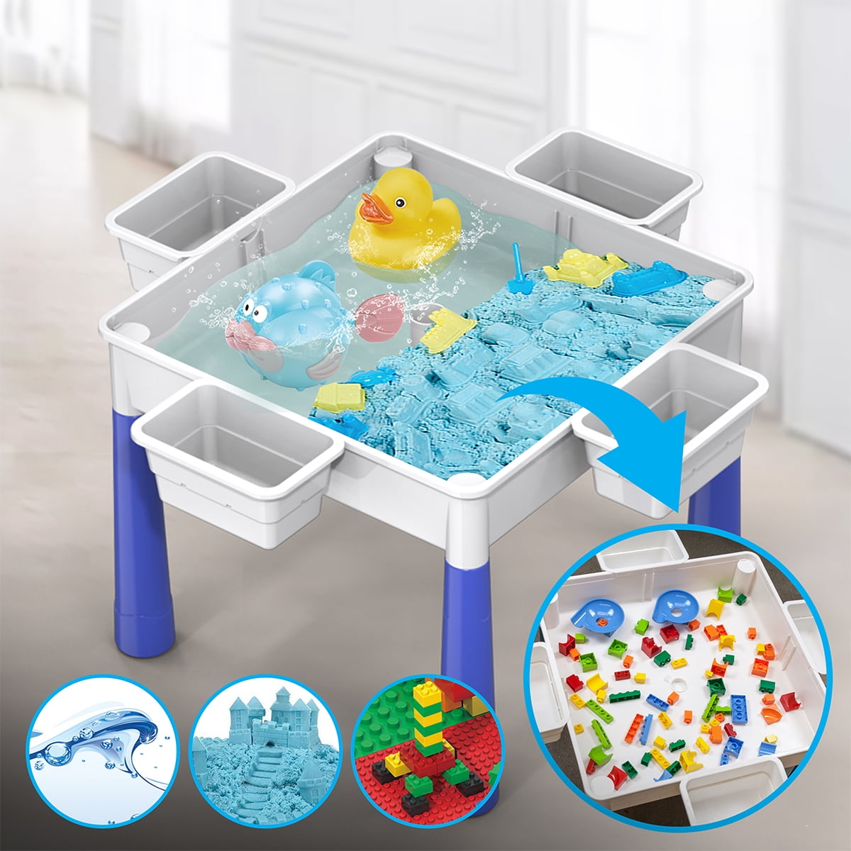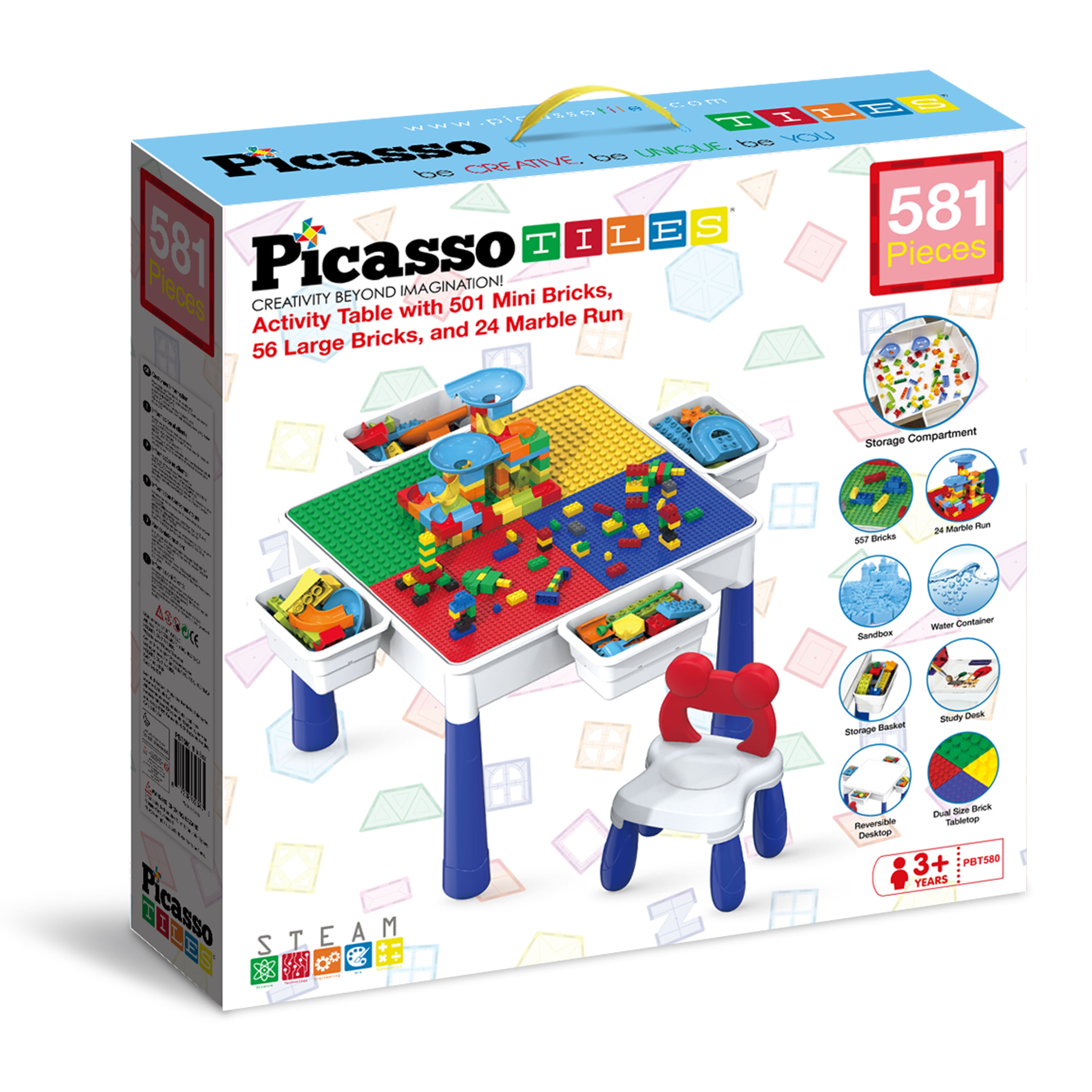 PICASSO-TILES PBT580 activity table transforms between a sandbox, study desk, water-tight container, marble run, and brick block playset. It features a reversible table top with dual side panels for building or flat surface activities and includes a large compartment for storage or water play. Lightweight and adjustable, it includes a kid-sized chair and supports both indoor and outdoor play, fostering creativity and STEM learning for children. The kit promotes logic training, critical thinking, problem-solving, and hand-eye coordination skills. All-in-one enables the kids to learn by intuitive play and bring out the best of all to be artistically creative. This is a very suitable educational toy for children in 3 4 5 6 7 8 and over years old.