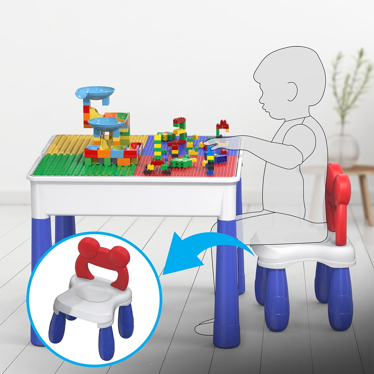 PicassoTiles Kids Multi Activity Table with Chair & Storage, 581PCS Building Blocks & Marble Run, STEM Construction Toy for Kids Age 3+