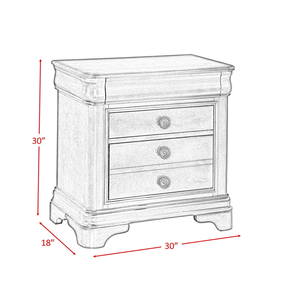 Traditional Cherry Finish Spacious 3-drawer nightstand including the felt lined hidden top drawer Drawers feature full extension metal side glides with built in stops. Dust proofing on bottom drawers for added protection Antique brass decorative knobs