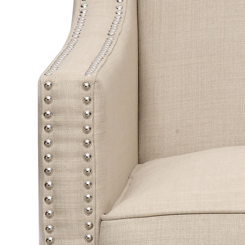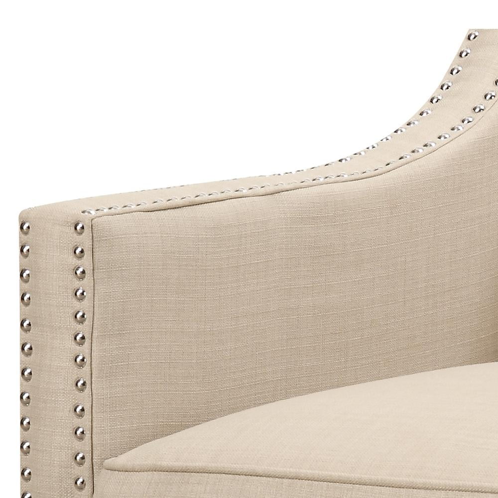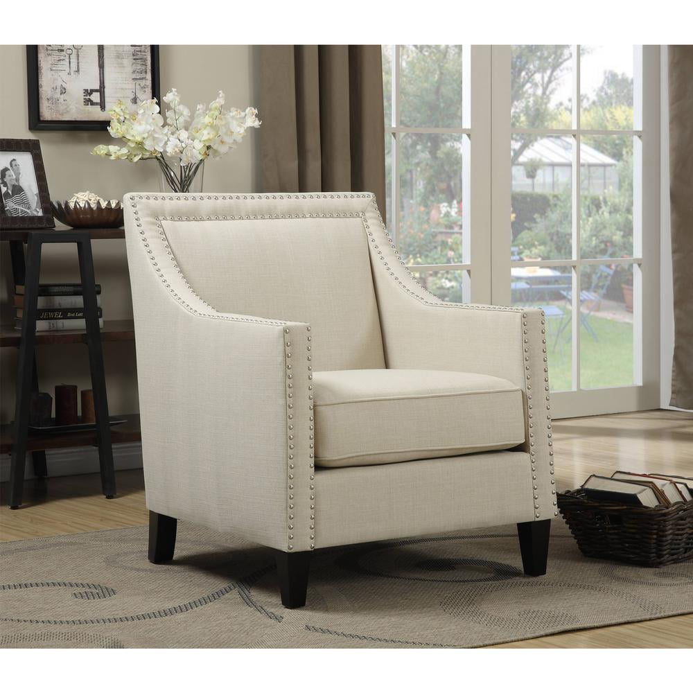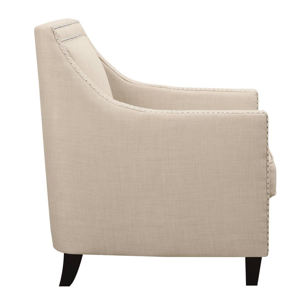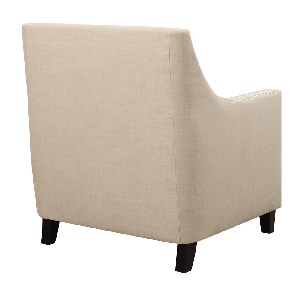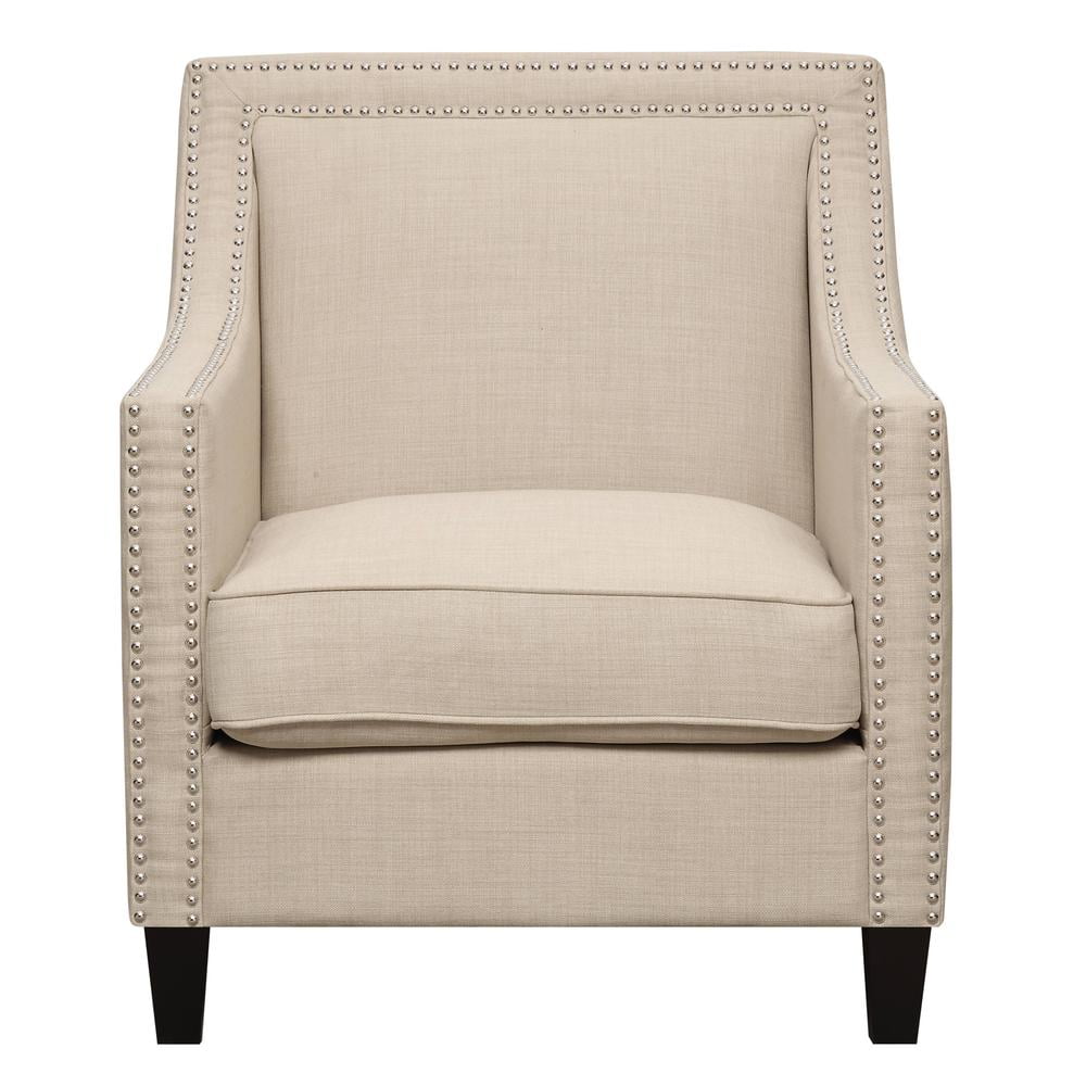 Emery Natural Chair The Picket House Furnishings Emery Chair boasts a refreshing combination of contemporary design with a touch of vintage flare. Its clean lines, low back, and straight edge arms are accented by nail head trim and dressed in a fashionable natural fabric upholstery. Trendy metal stud trim Stylish low back Contemporary straight edge arms Espresso wooden feet – Number of Pieces: 1 – Style: Transitional – Collection: Emery – Item Depth: 31 – Item Height: 36 – Item Width: 29 – Item Weight: 39 – Fabric Content: 100% Polyester – Cover/Veneer: Heirloom – Drawer Construction: Webbed Back Cushion – Outdoor (Y/N): No – Item Material: Solid wood; plywood; foam; S metal springs; wood feet; 100% polyester – Vendor Color: Natural