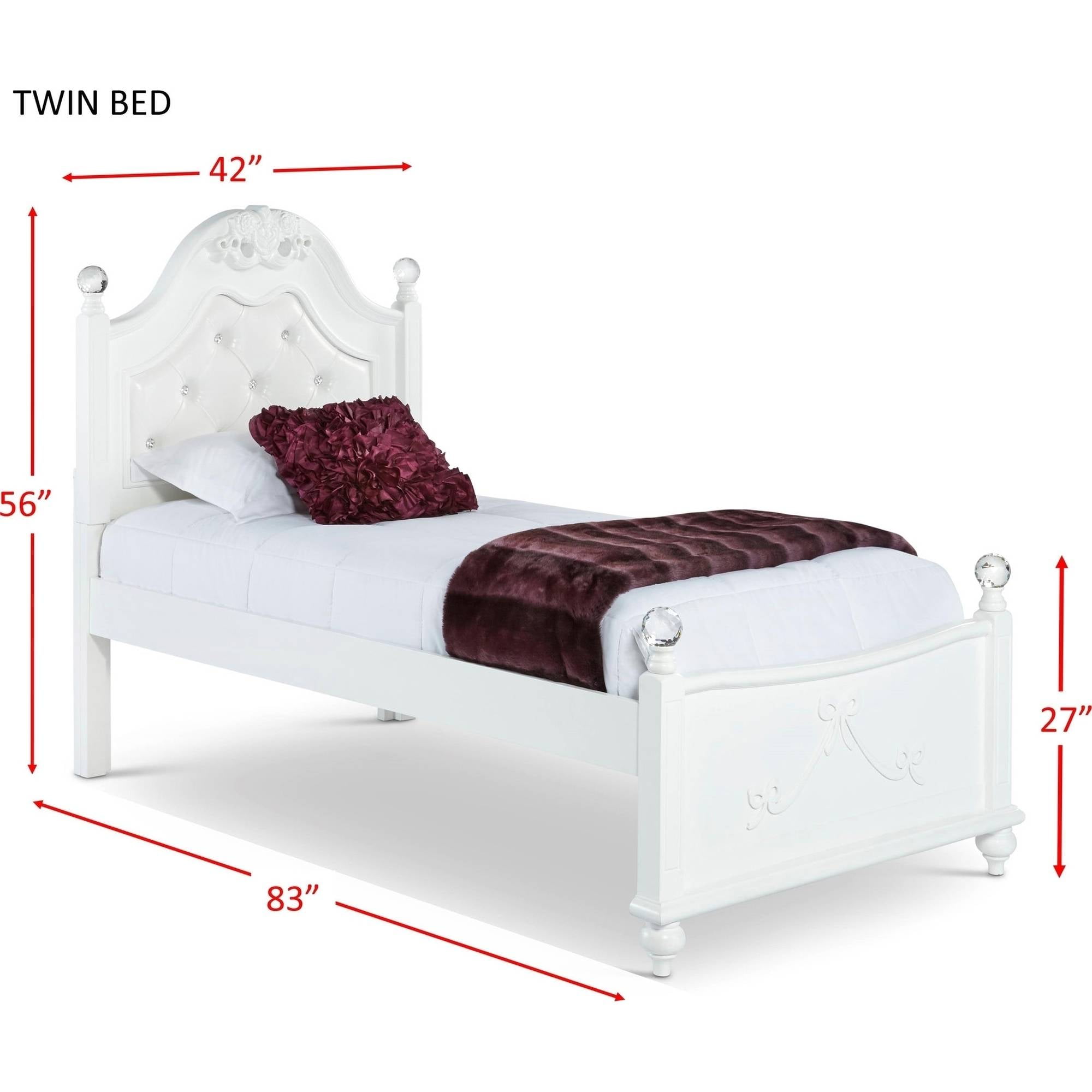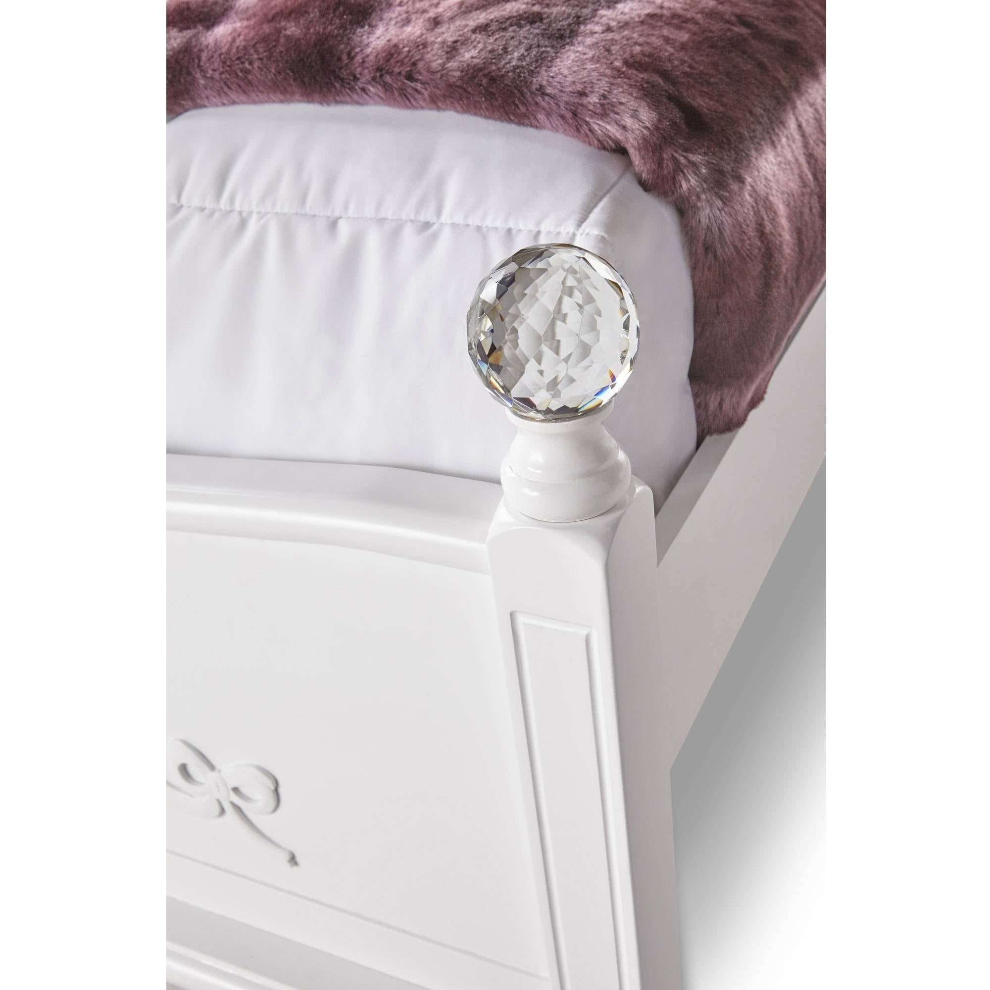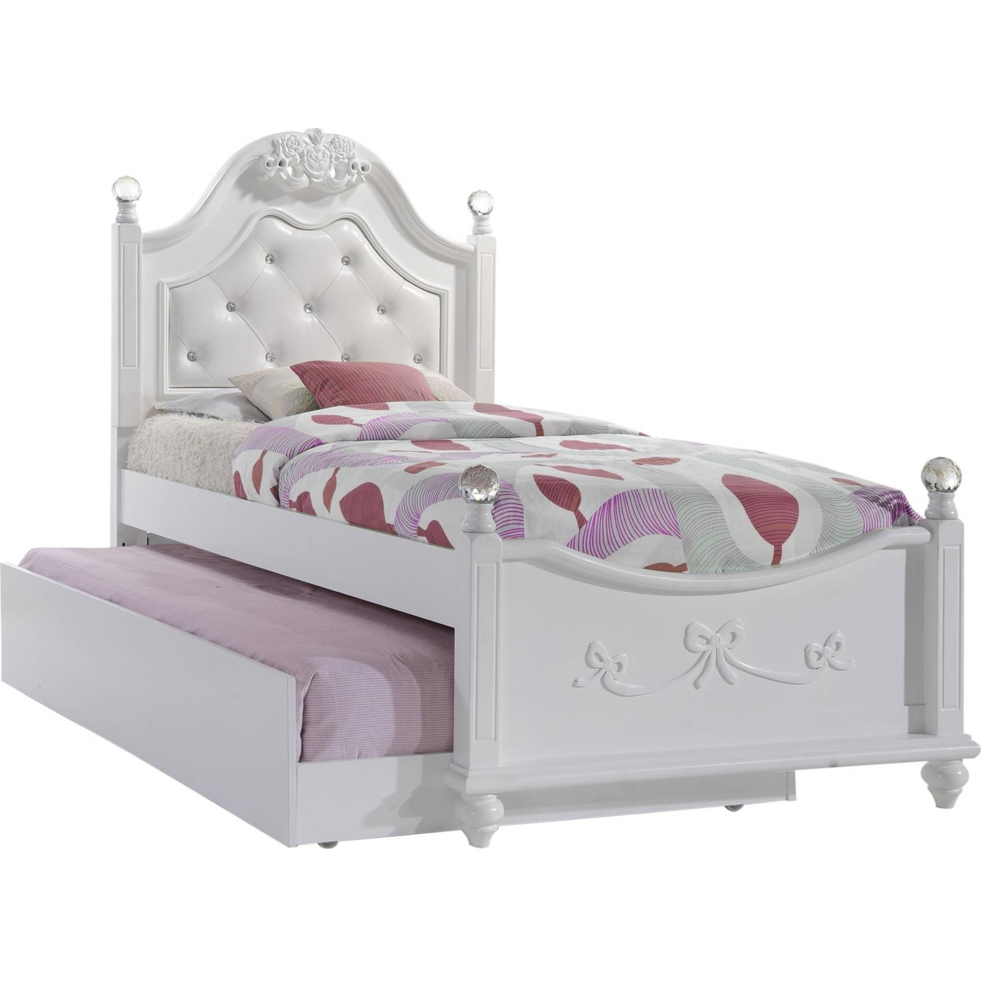 The Picket House Furnishings Annie Twin Platform Bed with Storage Trundle is what little girl dreams are made of. The twin bed offers a sense of wonder, featuring delicate bow moldings throughout, a button-tufted, white faux leather headboard, and sparkling crystal-ball posts. This well-crafted, beautiful design offers a convenient trundle, keeping your little one organized.