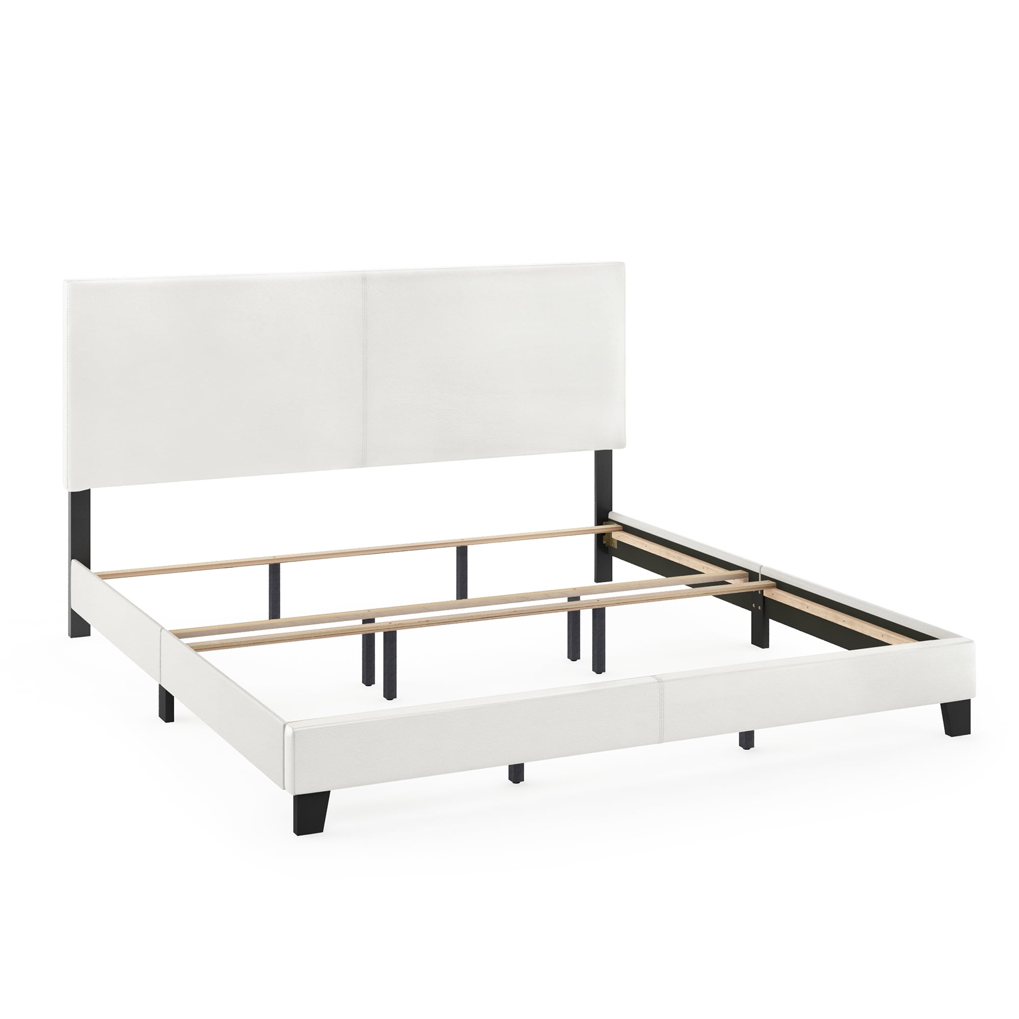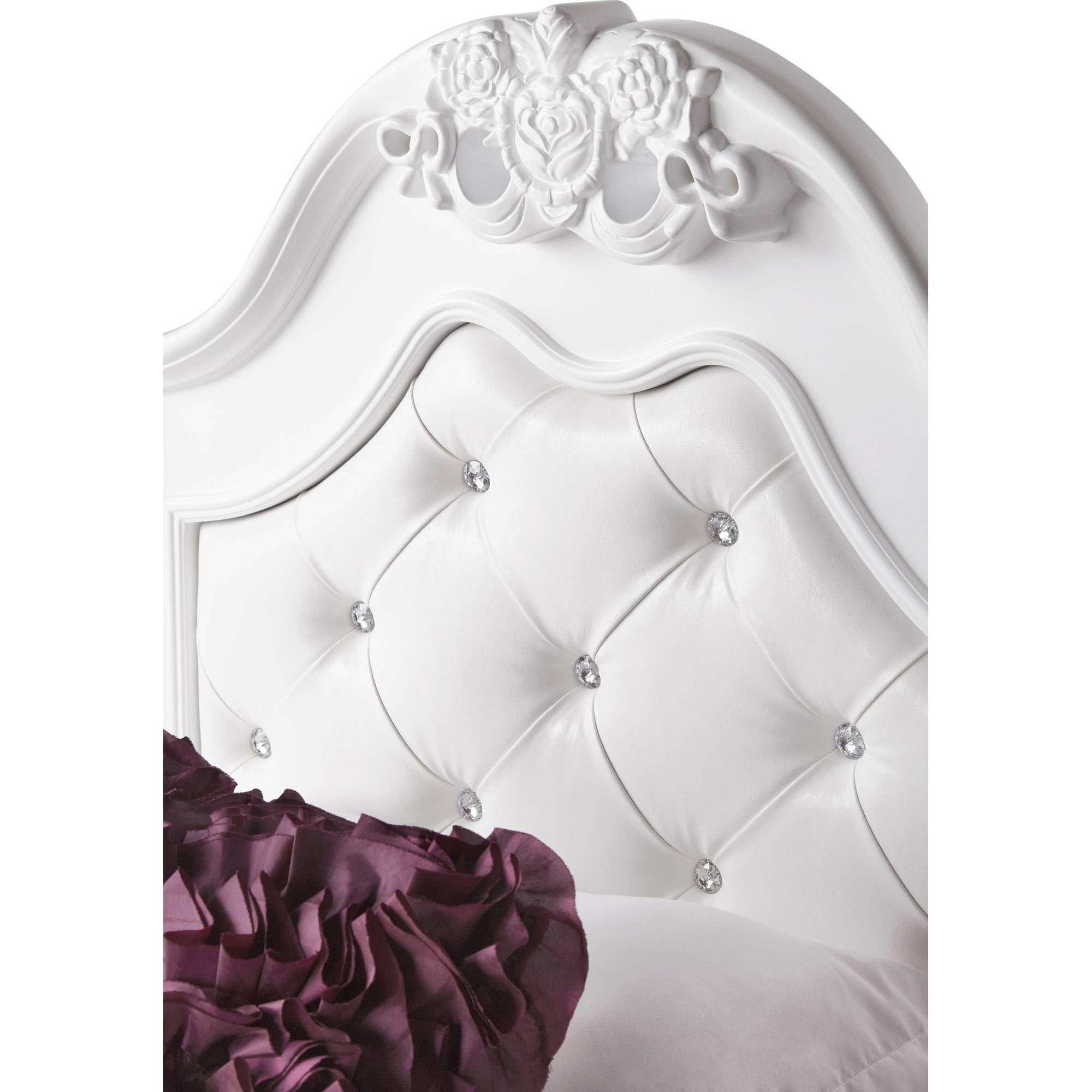 White Faux Leather Headboard Button Tufting Crystal Bed Posts Intricate Moldings Trundle Storage