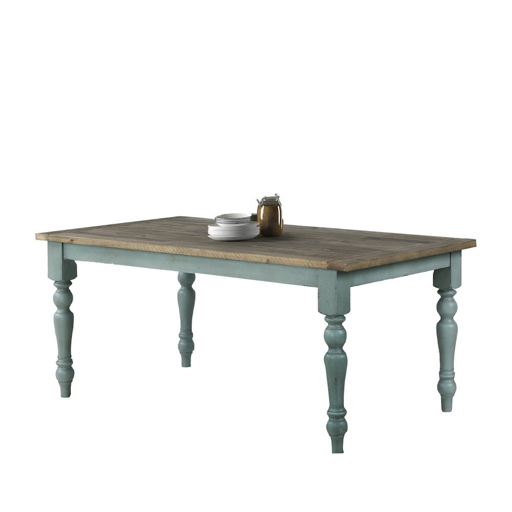 Includes: One (1) Dining Table Finish: Natural and White Material: Crafted from acacia, pine acacia wood and veneers, and MDF Pedestal Base Round Shape Intricate top design Natural finish on top Cottage White finish on base Farmhouse Style Comfortably seats up to 6 guests