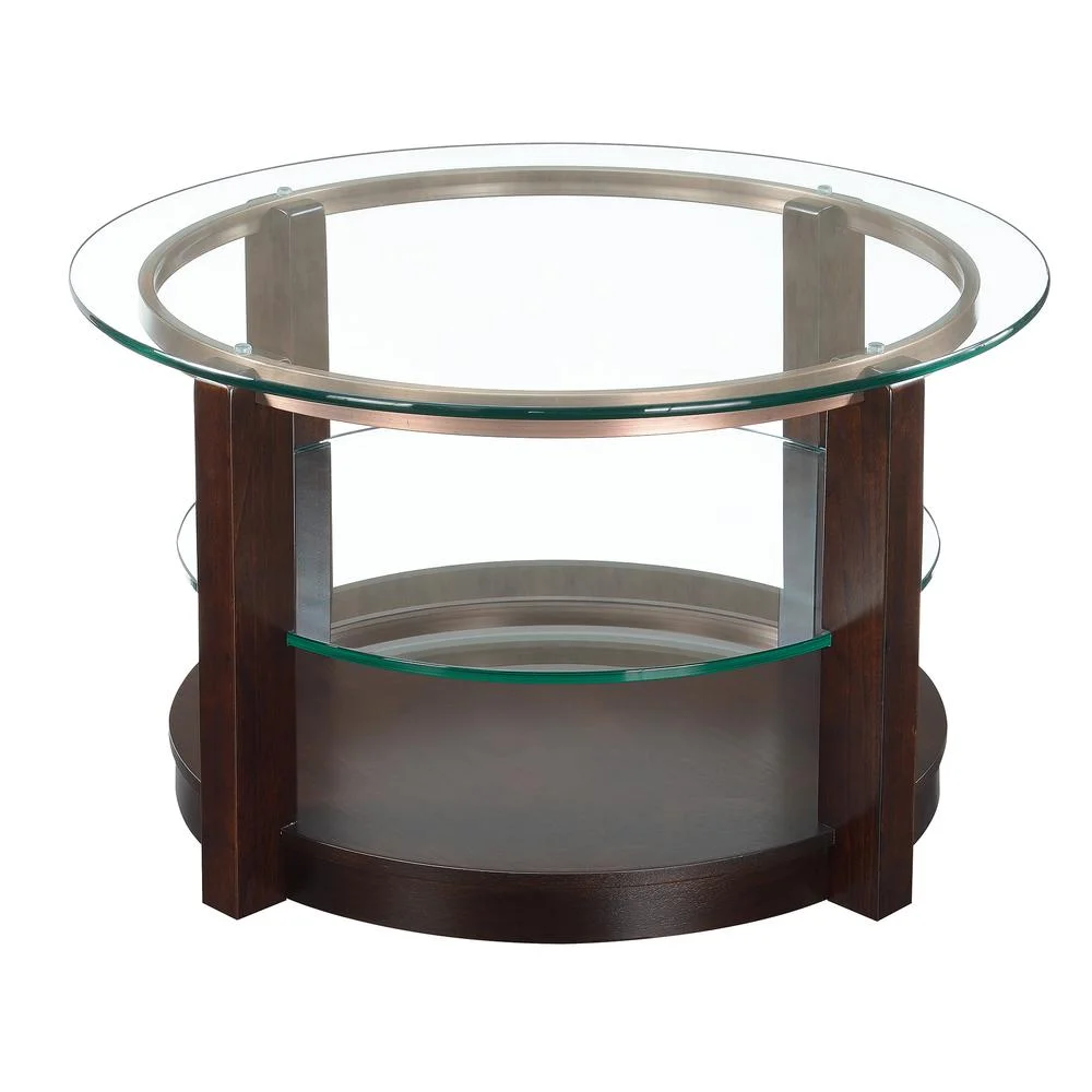 Round Coffee Table Removable Casters Glass Table Top Glass Shelf in Middle of Table Straight Legs Traditional Design Espresso Finish