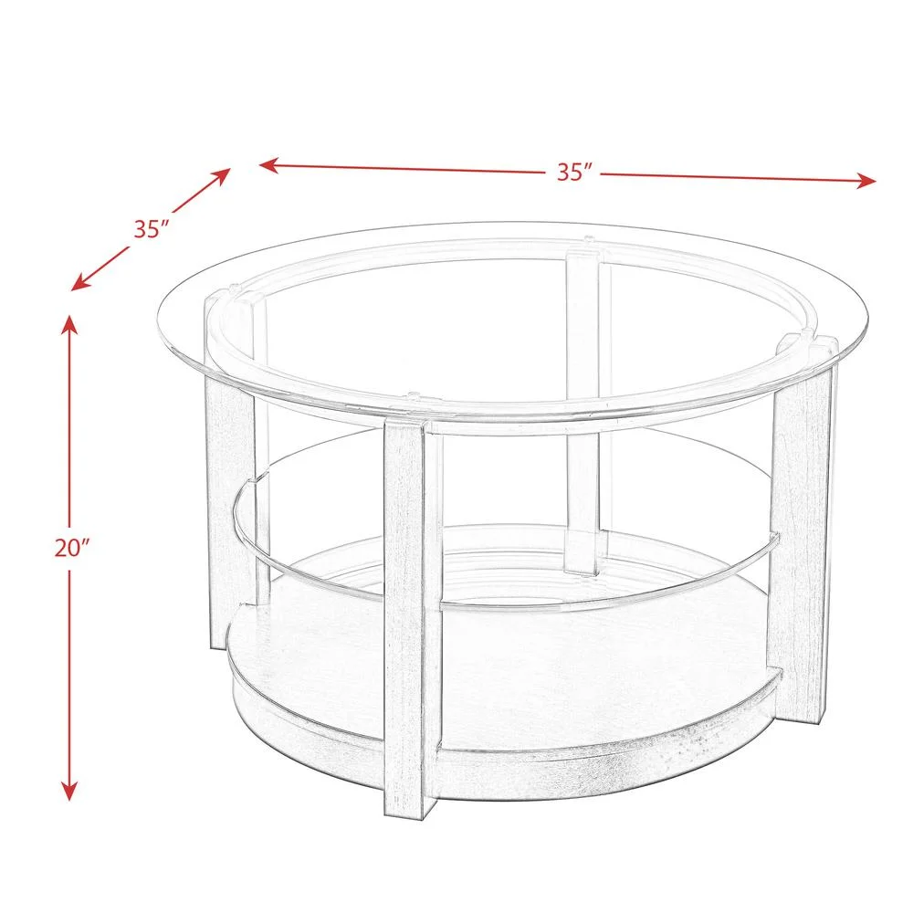 The Picket House Furnishings Benton Round Coffee Table is the perfect addition to your living room! This coffee table is great for small space living thanks to its removable casters, allowing you to move the table with ease any time you have company over or you just want to rearrange the place. This coffee table has a timeless style, with its glass table top. The accent table also comes with an interior shelf that allows for any extra storage or the perfect spot for decor. The rich espresso color is classic and easy to match with any existing decor and furnishings. Features: Round Coffee Table Removable Casters Glass Table Top Glass Shelf in Middle of Table Straight Legs Traditional Design Espresso Finish Specifications: Coffee Table Dimensions: 35″ D x 35″ W x 20″ H Assembly Required: Yes