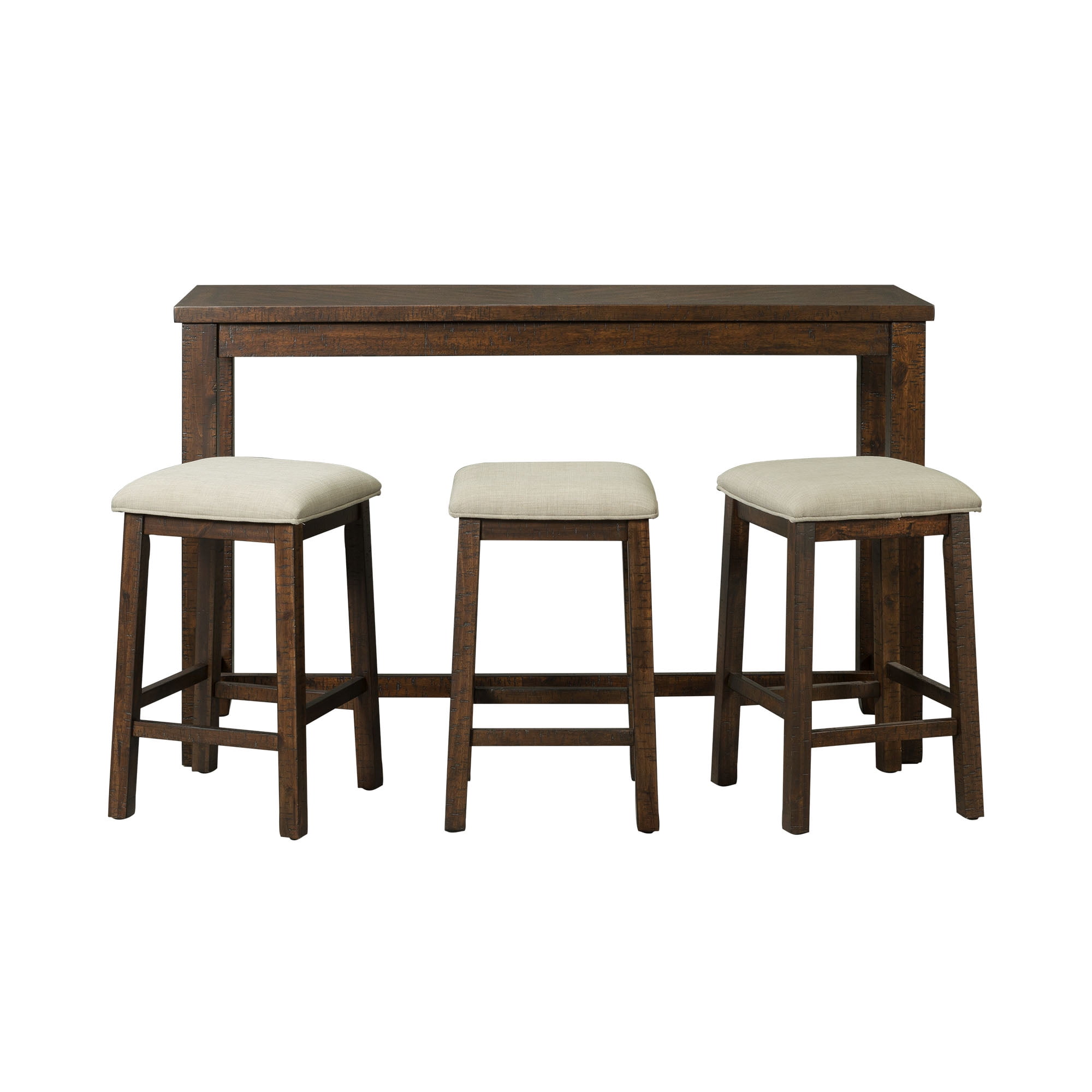 Multipurpose Bar Table Set Includes: Table and Three Bar Stools USB Ports Power Strip Ships in One Box Upholstered Seats Dark Taupe Fabric Straight Legs Stretchers along Barstools Piping along Seat Cushions Dark Walnut Finish with Distressed Marks