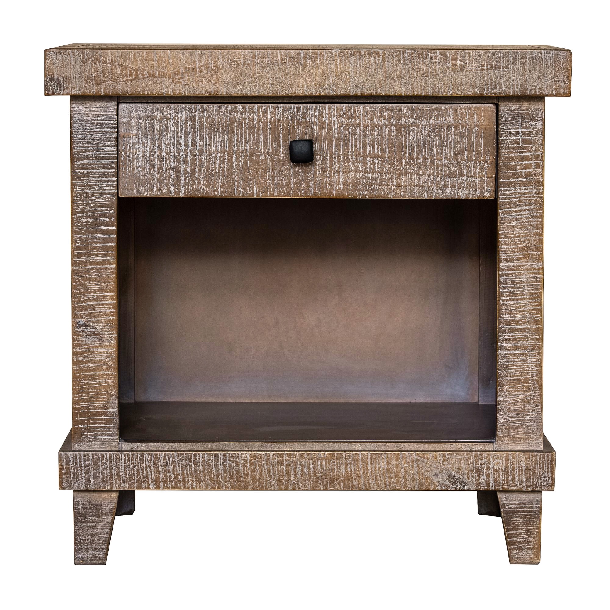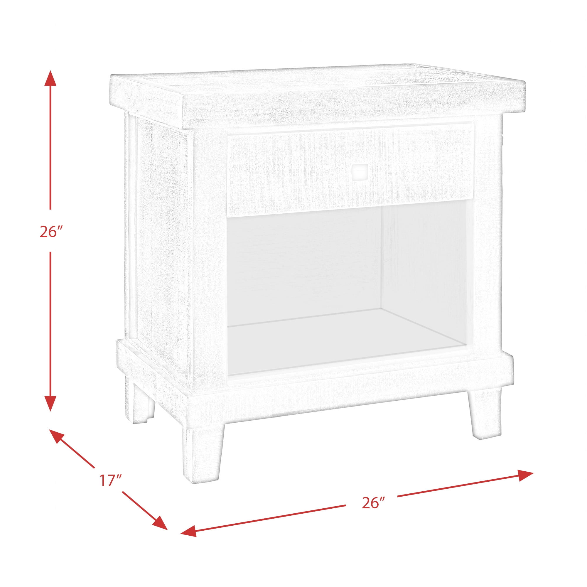 Dimensions: 26W x 17D x 26H in. Engineered and pine wood construction Choose from the available finish options 1 drawer and 1 cubby Black aluminum square handle Assembly required