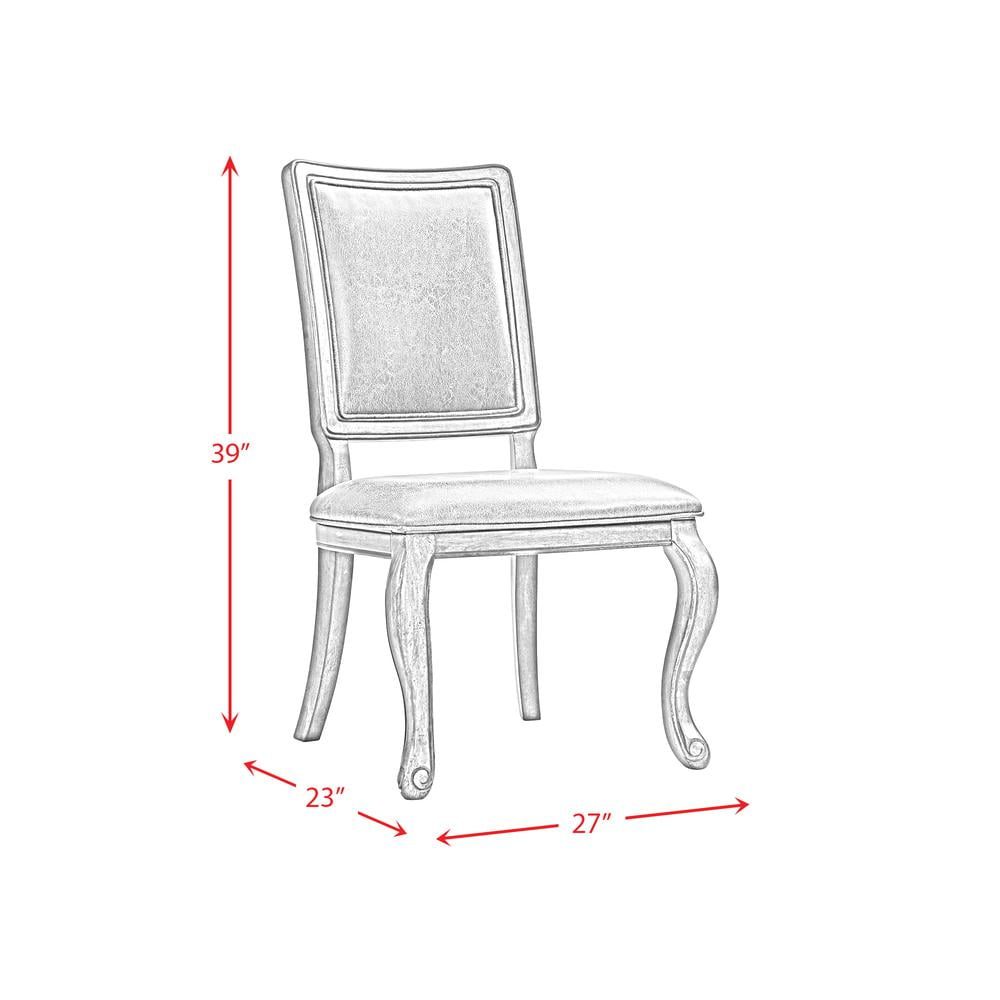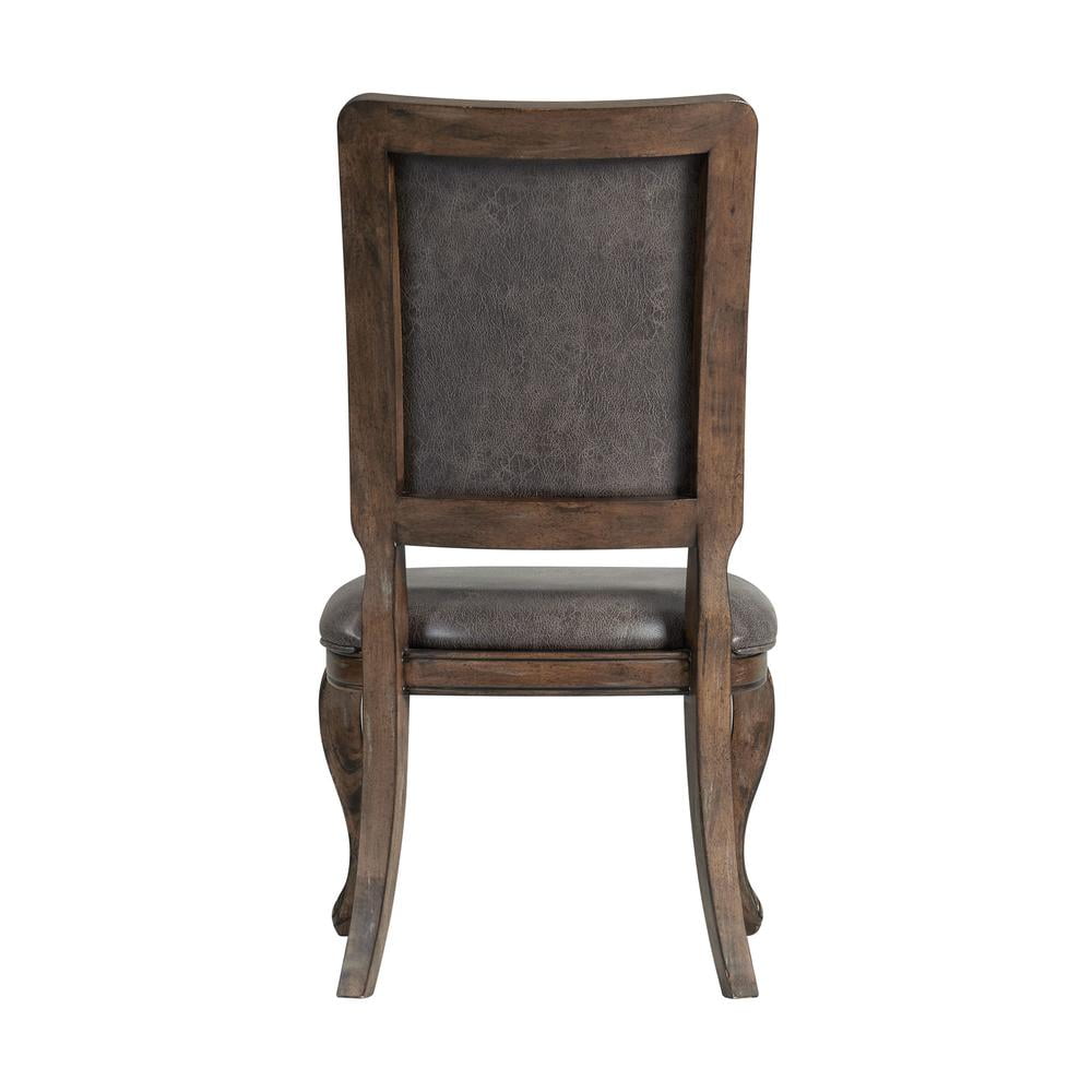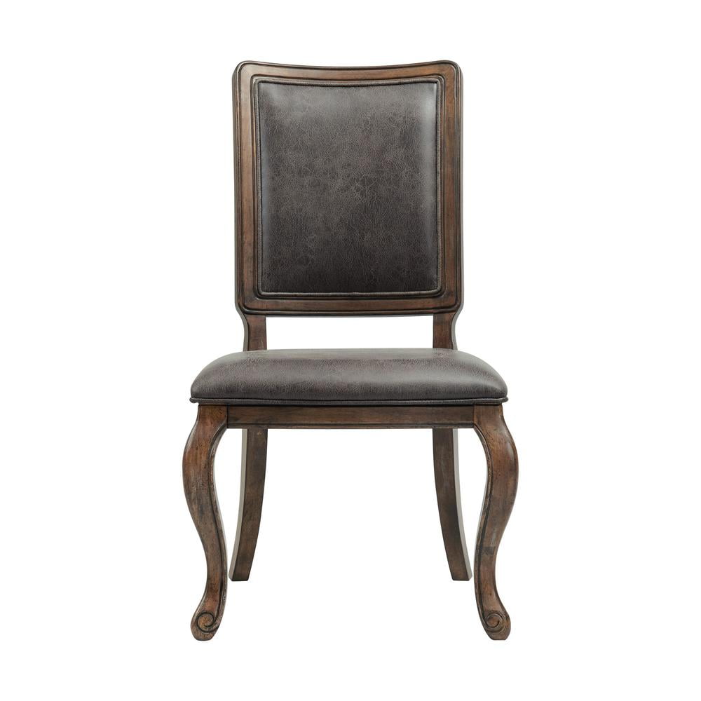 Includes: Two Side Chairs Chocolate, Faux Leather Upholstered Seat and Back Distressed Faux Leather Curved Front Legs Wood Framing around Fabric Foam Cushion Seat and Back Detailed Piping along Cushions Natural Wood Grains Warm, Walnut Finish