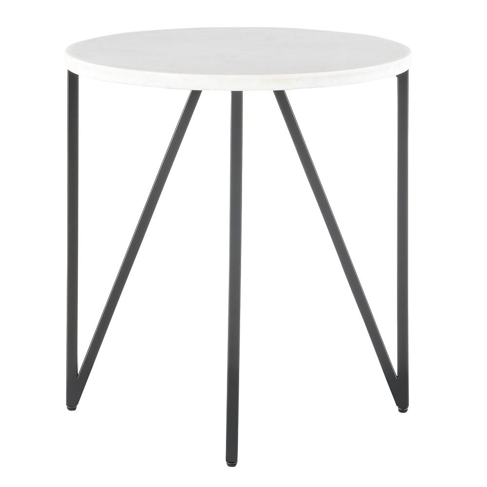 The Picket House Furnishings Kinsler Round End Table is chicness goals! This end table has a white, marble table top and sleek, black metal legs. The contemporary design, will easily go with any existing décor or can be a great excuse to redo your entire living room! The legs feature a cool design and instantly update the look of the traditional end table. Add this accent table to your home today for the perfect, chic look! Features: Round End Table Marble Table Top Black Metal Legs Contemporary Design Intricate Table Base Clean, Sleek Lines Specifications: Assembly Required: Yes