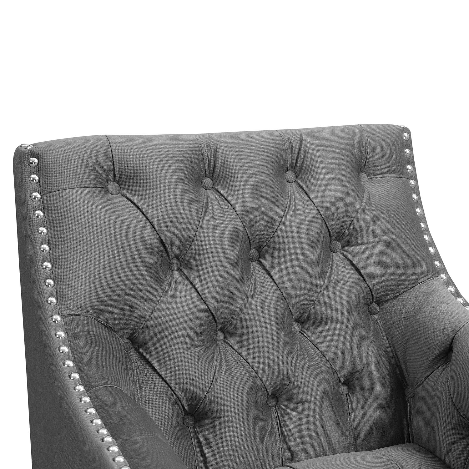 Finish: Charcoal All Over Button Tufting Seat/Back/Inner Arms Nail Head Trim Smooth Fabric Dark Espresso Wooden Feet Straight Edge Arms Foam Cushion Seat Diamond Stitching S-Spring Seat Construction Webbing Back Construction