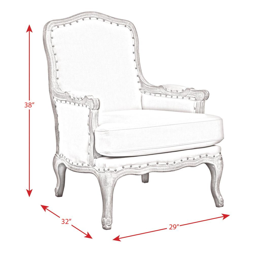 The Picket House Furnishings Regal Accent Chair is classic French style and will look gorgeous in your home for years and years! This classic French style chair is going to look amazing in your home, no matter where you decide to display it. The Regal is mostly upholstered, with the exception of the outline of the chair which is a distressed wooden base. Nail head trim outlines all of the upholstered areas of the chair, even the padded arm rests. Cabriole feet, which are synonymous with classic French style, complete the look of this chair. Foam cushion seat and back will provide comfort while you relax in ultimate chic style.