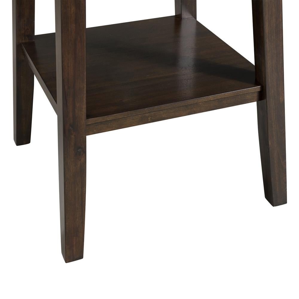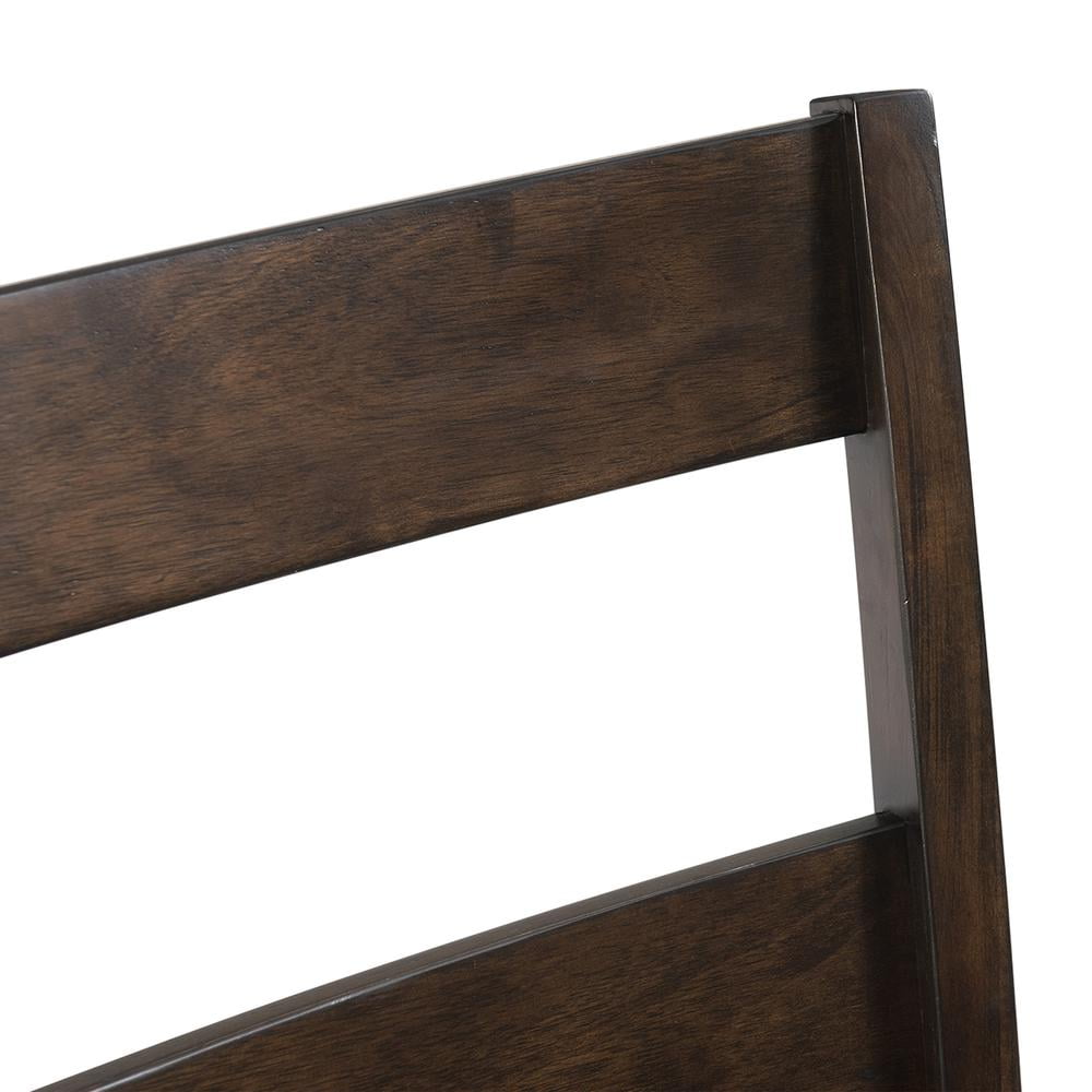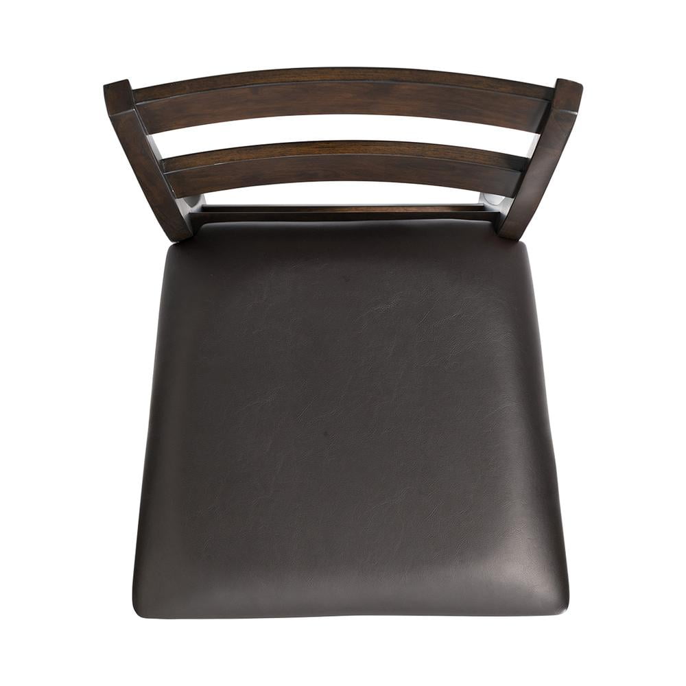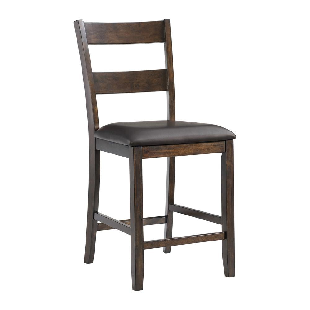 Includes: Table & Four Chairs Counter Height Square Table Design Shelf in Middle of Table Faux Leather, Chocolate Upholstered Seats Ladder Back Chair Design Foam Cushion Seat Dark Walnut Finish