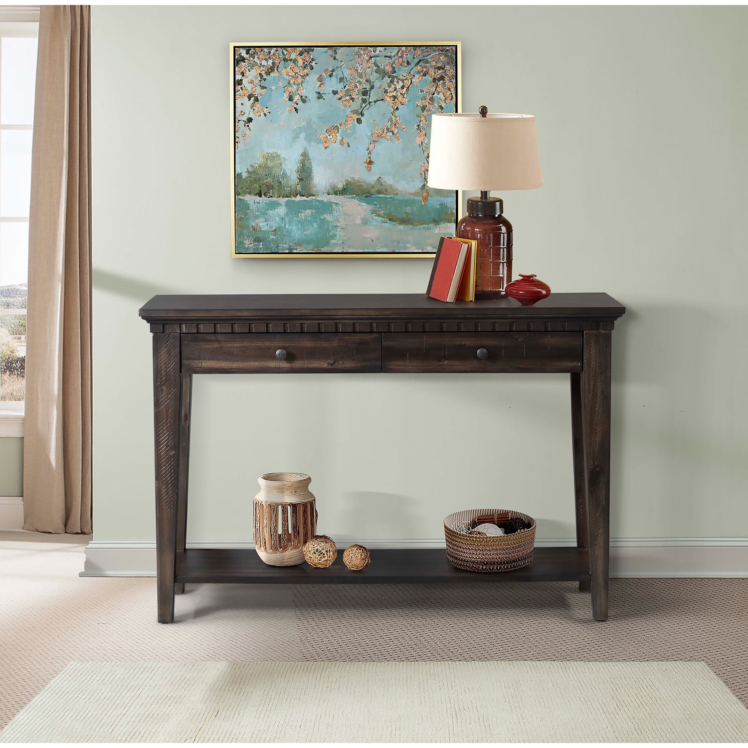 Picket House Furnishings Steele Console Table, Gray Oak: Bradshaw King bed Storage bed Espresso bed Bedroom set 4pc bedroom set Bedroom furniture Dental molding Two drawers Shelf at bottom Tapered legs Mattresses sold separately. See our assortment of mattresses