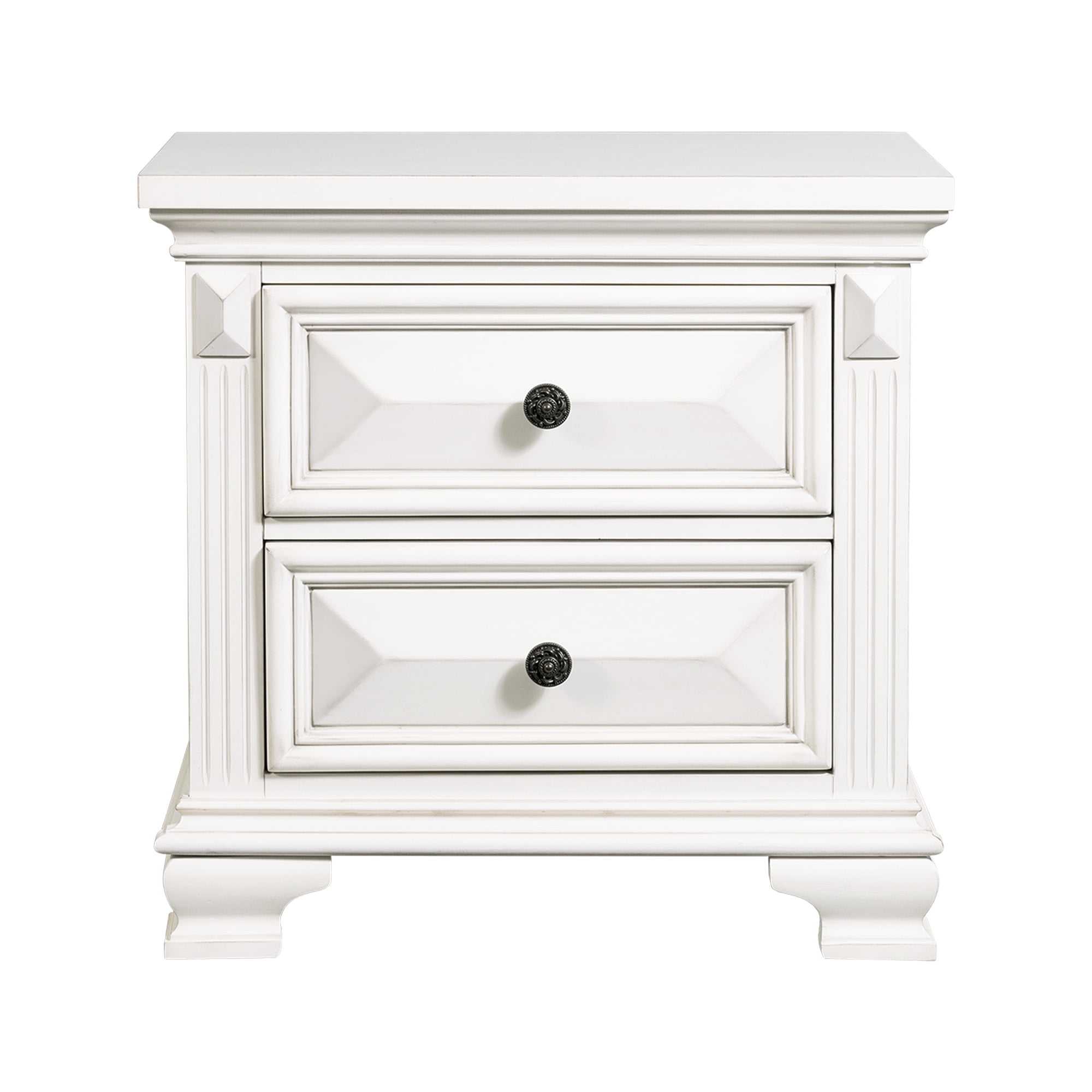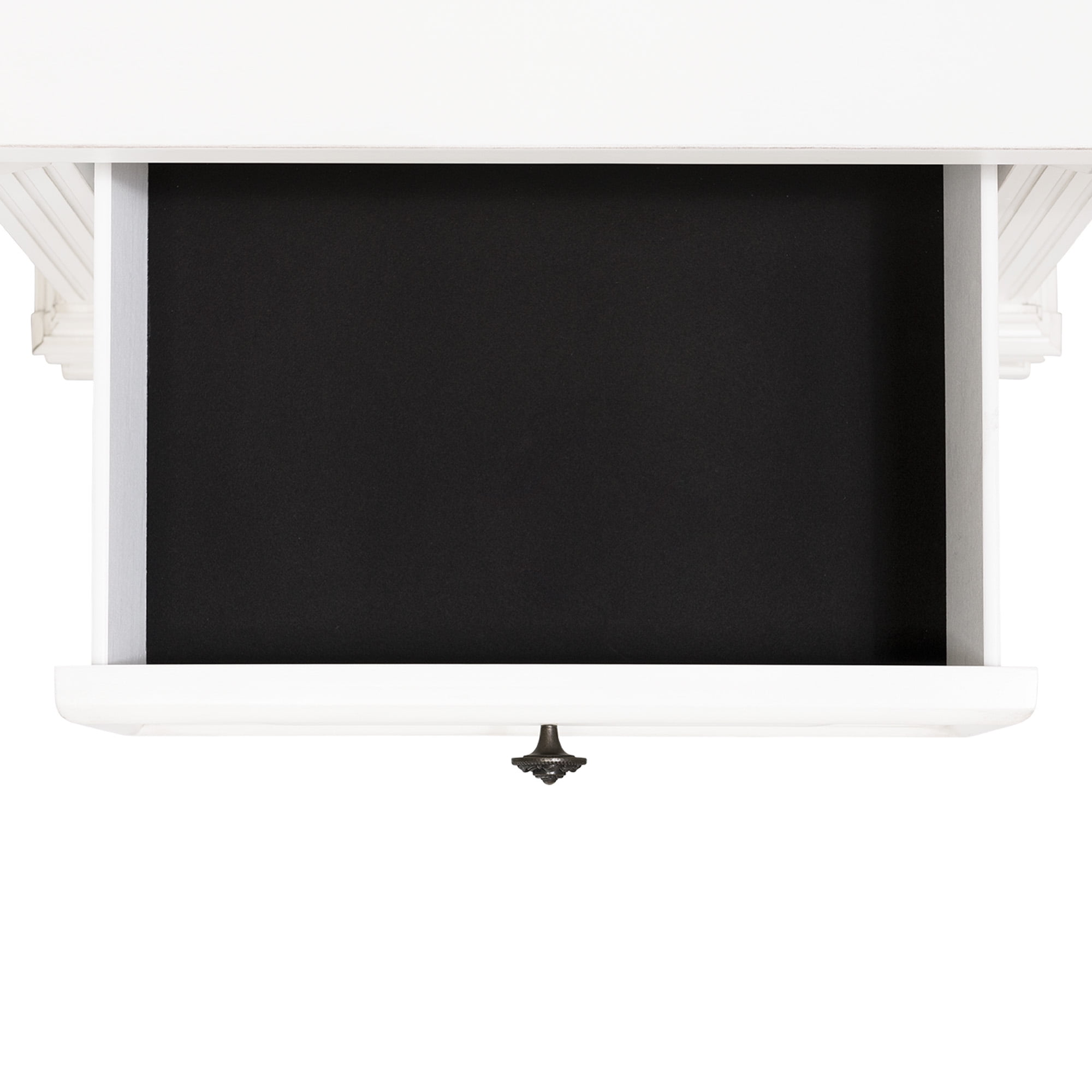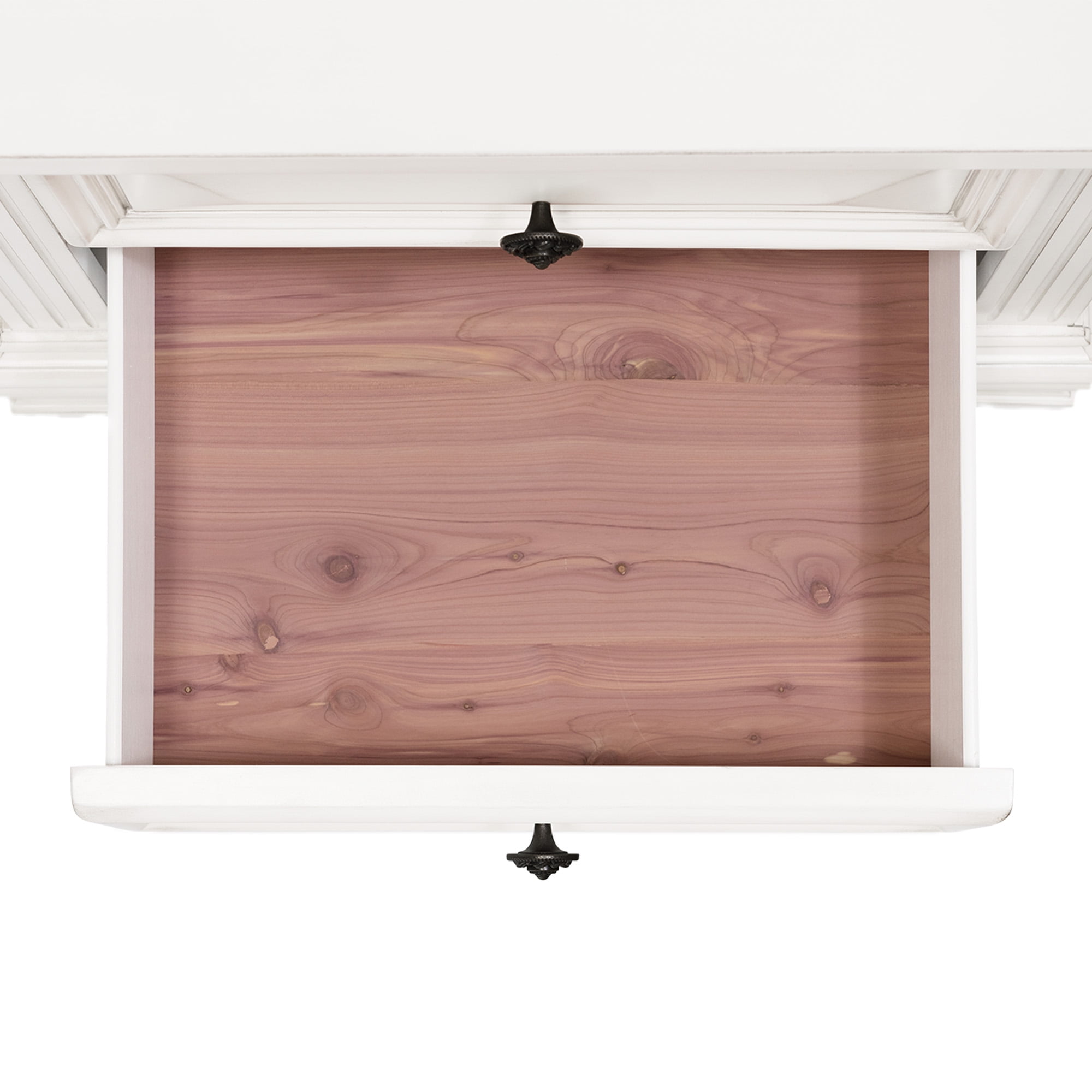 Two Spacious Drawers Black Felt-Lined Top Drawer Cedar Lined Bottom Drawer Dust Proofing Layer on Bottom Drawer Dark Metal Finish Hardware Bevel Edges White Finish Raised Drawer Fronts Bracket Style Feet