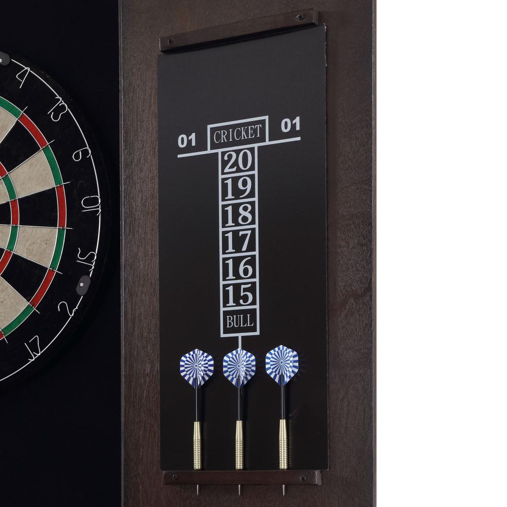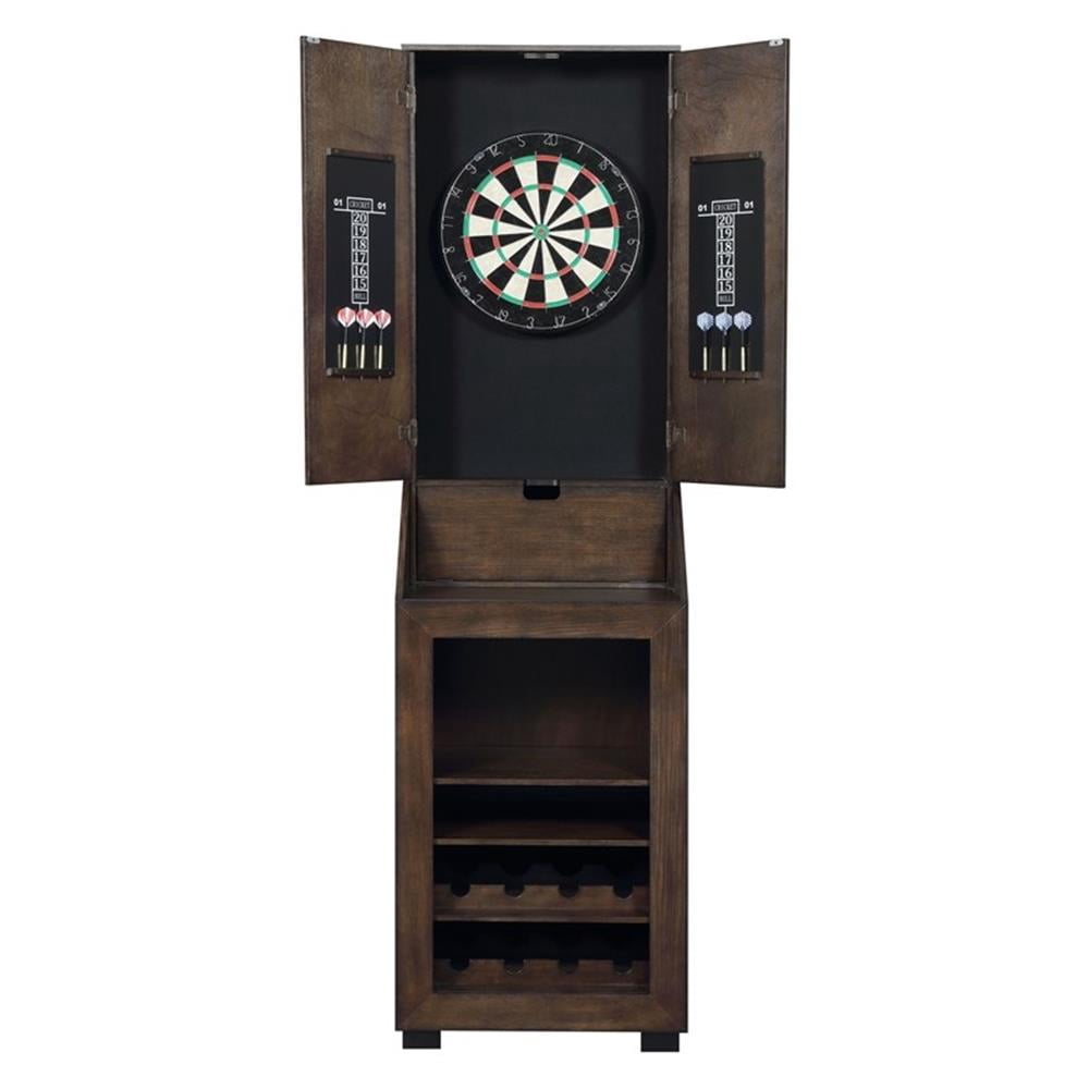 The Picket House Furnishings Tyson Dartboard Cabinet is a multi-functional gaming piece for your game room. This beautiful gaming cabinet has so much to offer. Open up the cabinet doors and you will find a dartboard, two score boards, three red darts, three blue darts and 1 dry Erase Marker for score keeping. Perfect for home entertainment and beverage service, this piece has an eight-bottle wine rack on the bottom and 2 shelves for additional storage for glassware. The rich walnut finish of this piece gives it a traditional style appearance perfect for a game room. So, call your friends and family over for a game night party!