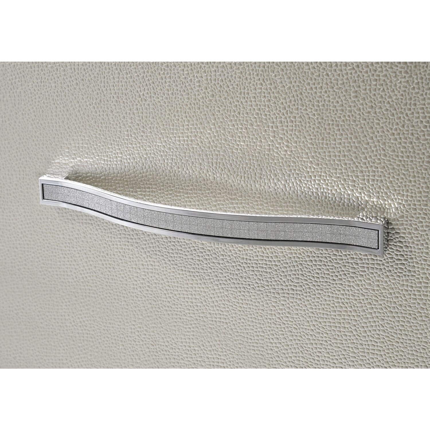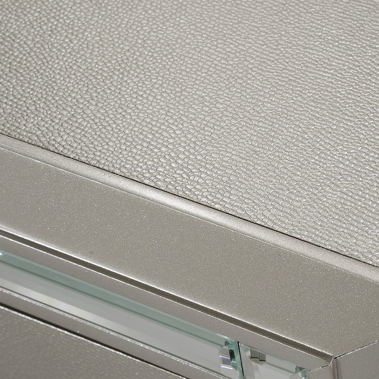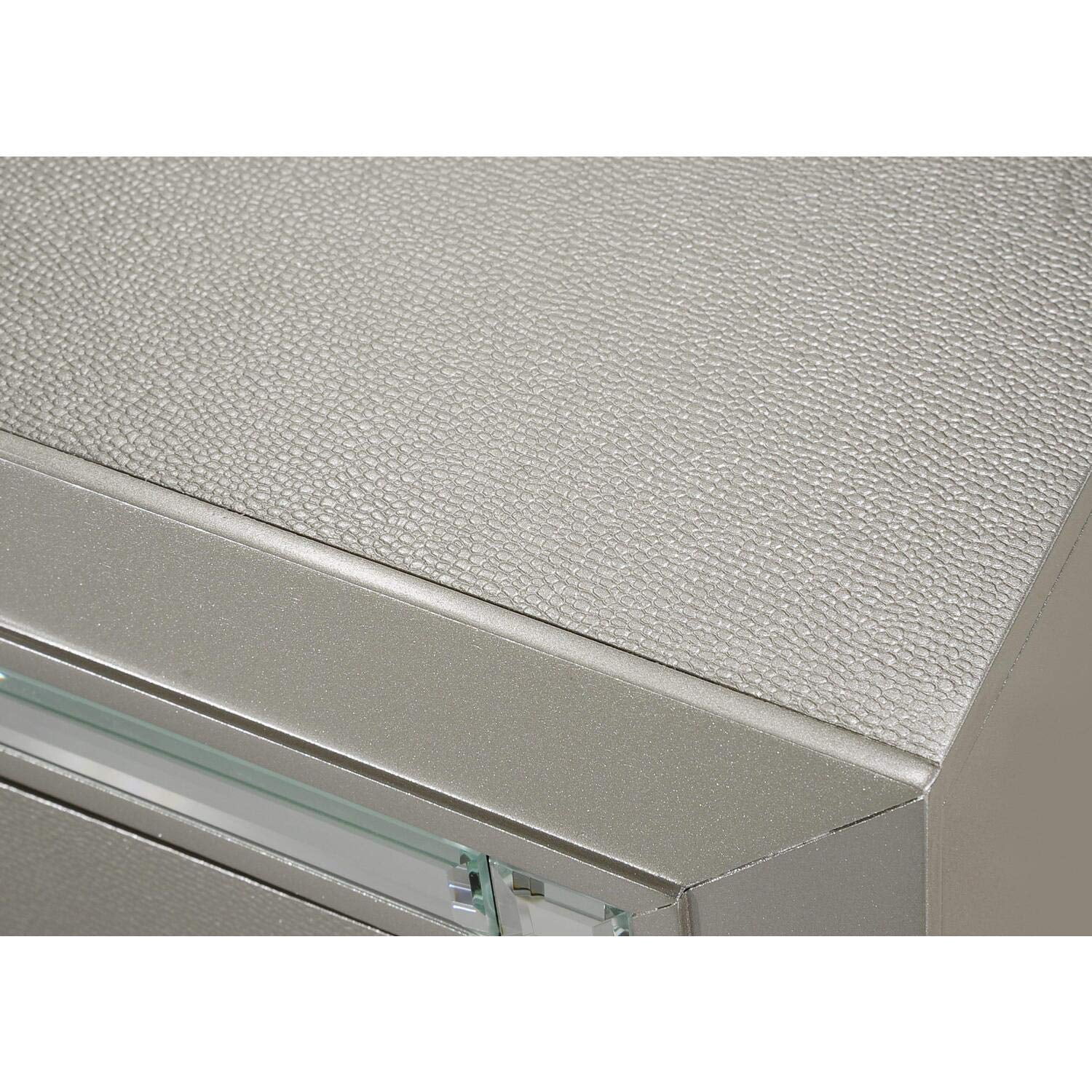 Glamour Nightstand: Picket House nightstand with wooden frame Raised feet 2 drawers Decorative mirror trim with large crystal and chrome handles Contemporary style Finish: Champagne Picket House nightstand dimensions: 27″H x 27″W x 18″D