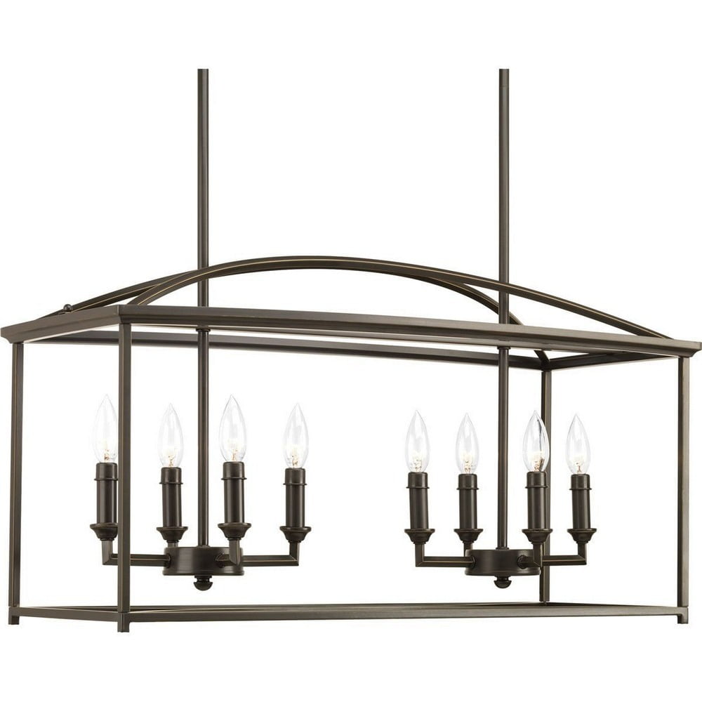 The eight-light linear island light chandelier from the Piedmont Collection is ideal for any kitchen, pool tables, dining rooms, sunrooms and breakfast areas With its classic styling, the fixture is perfect for modern farmhouse, transitional, and coastal style settings The linear form and open cage design are complemented by soaring arches and candle chaser accents in an antique bronze finish