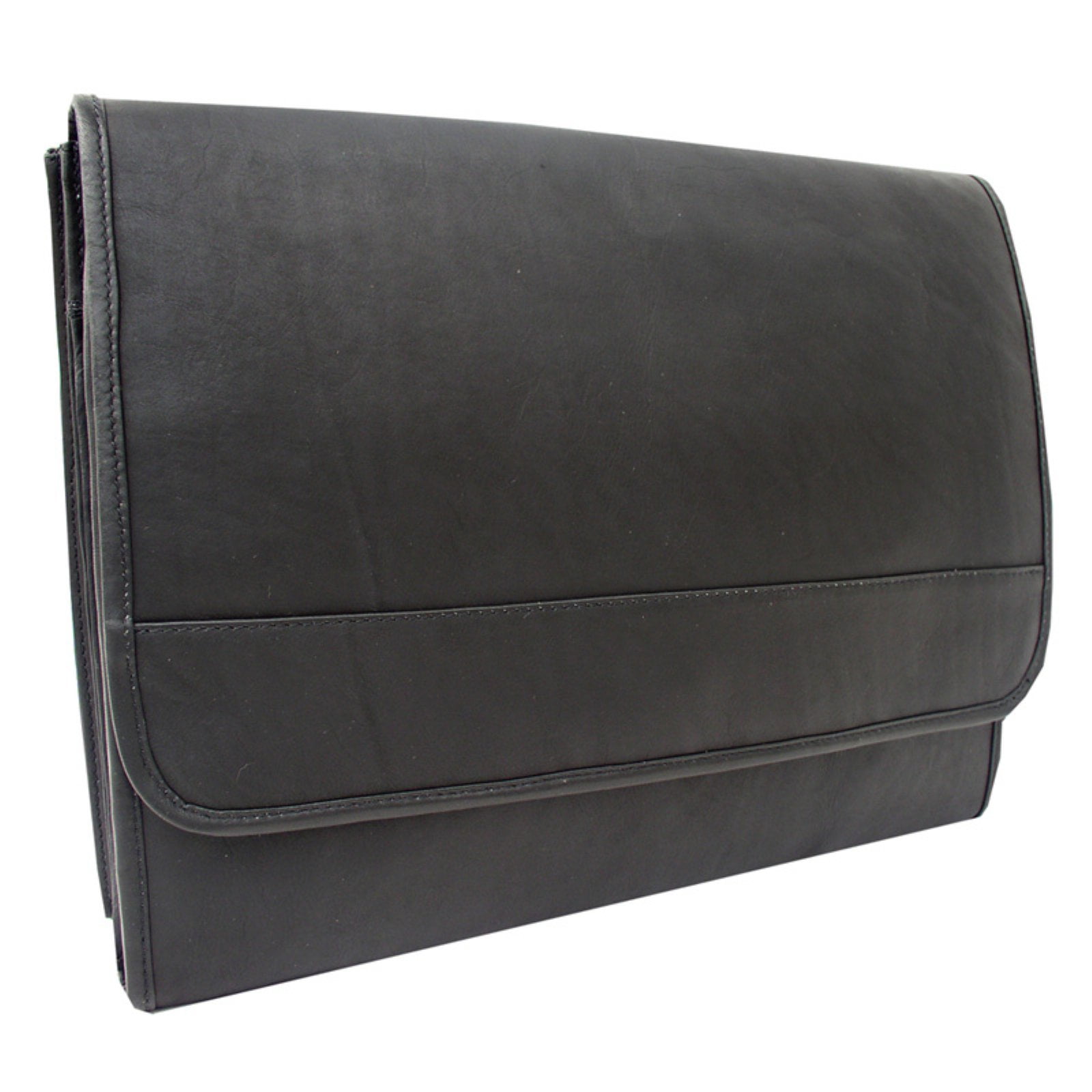 Magnetic opening revealing main compartment with divider and a large gusseted open pocket with full organizer. Large front and back zip-pockets.