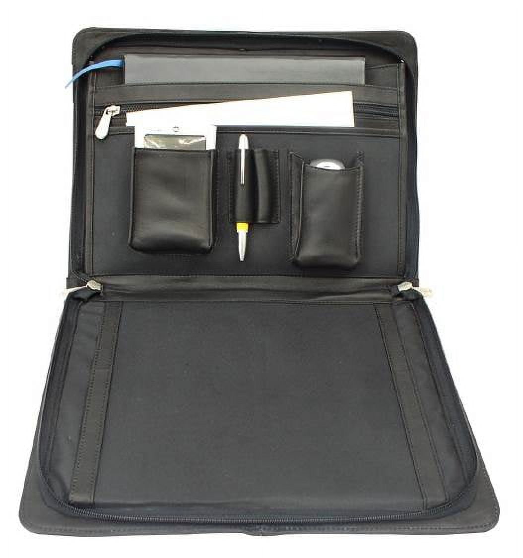Zip-around with large exterior zip-pocket opens to reveal full organizer, three large open pockets for files, etc, interior zip-pocket, and letter-size notepad slot. Letter-size notepad included.