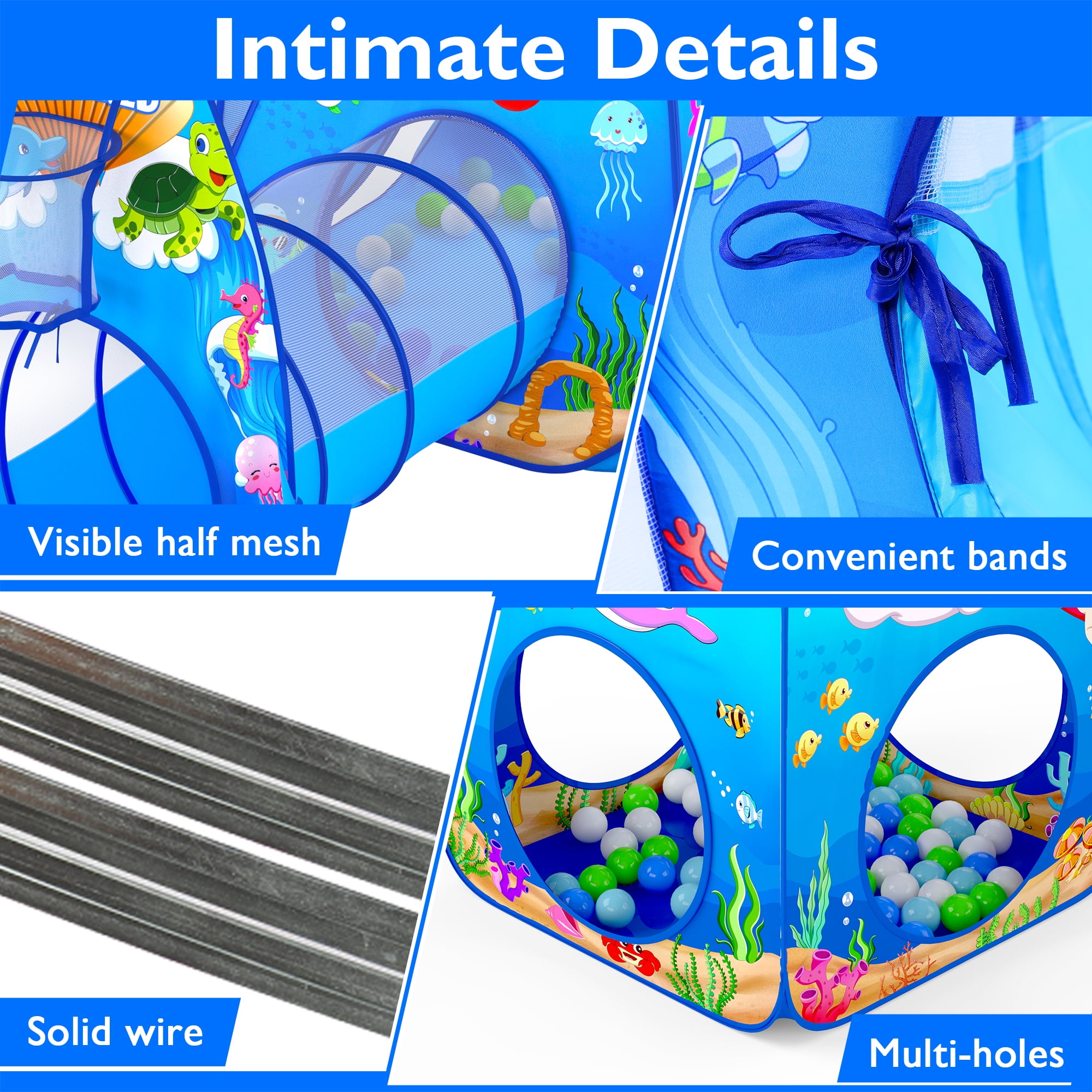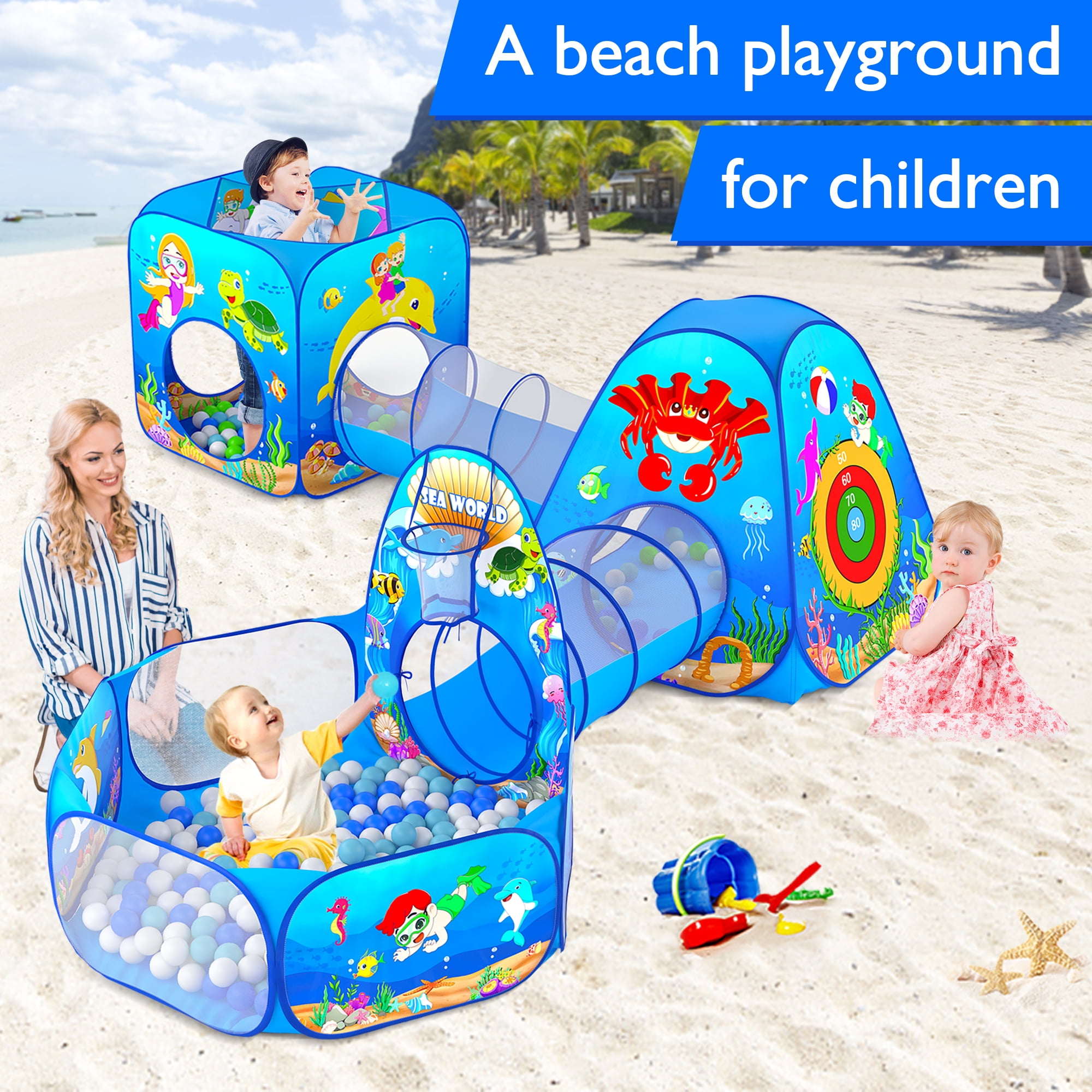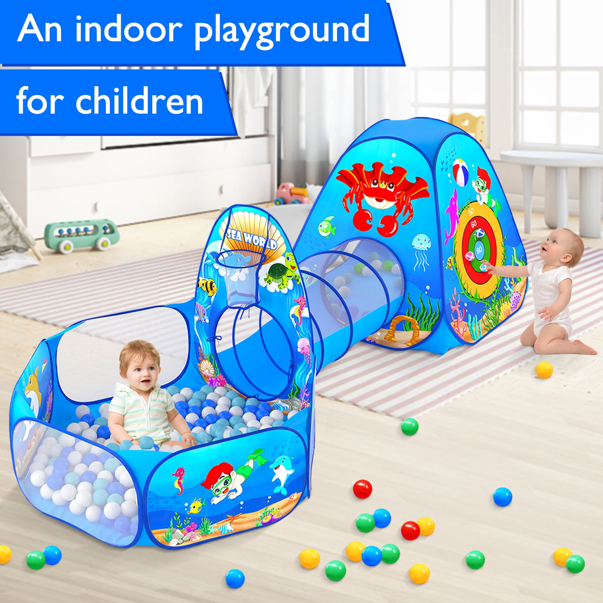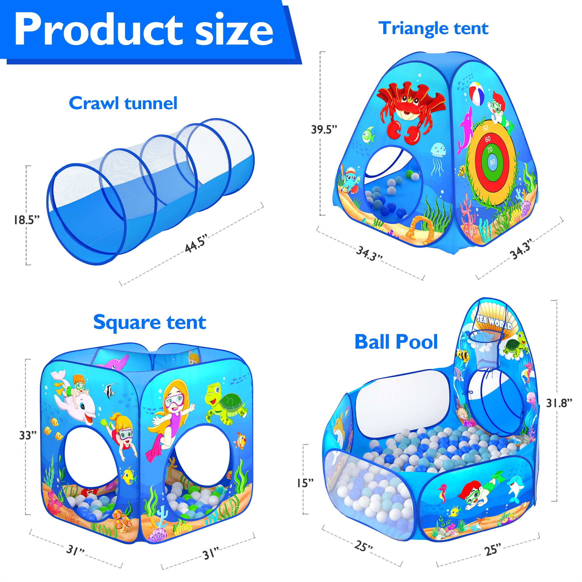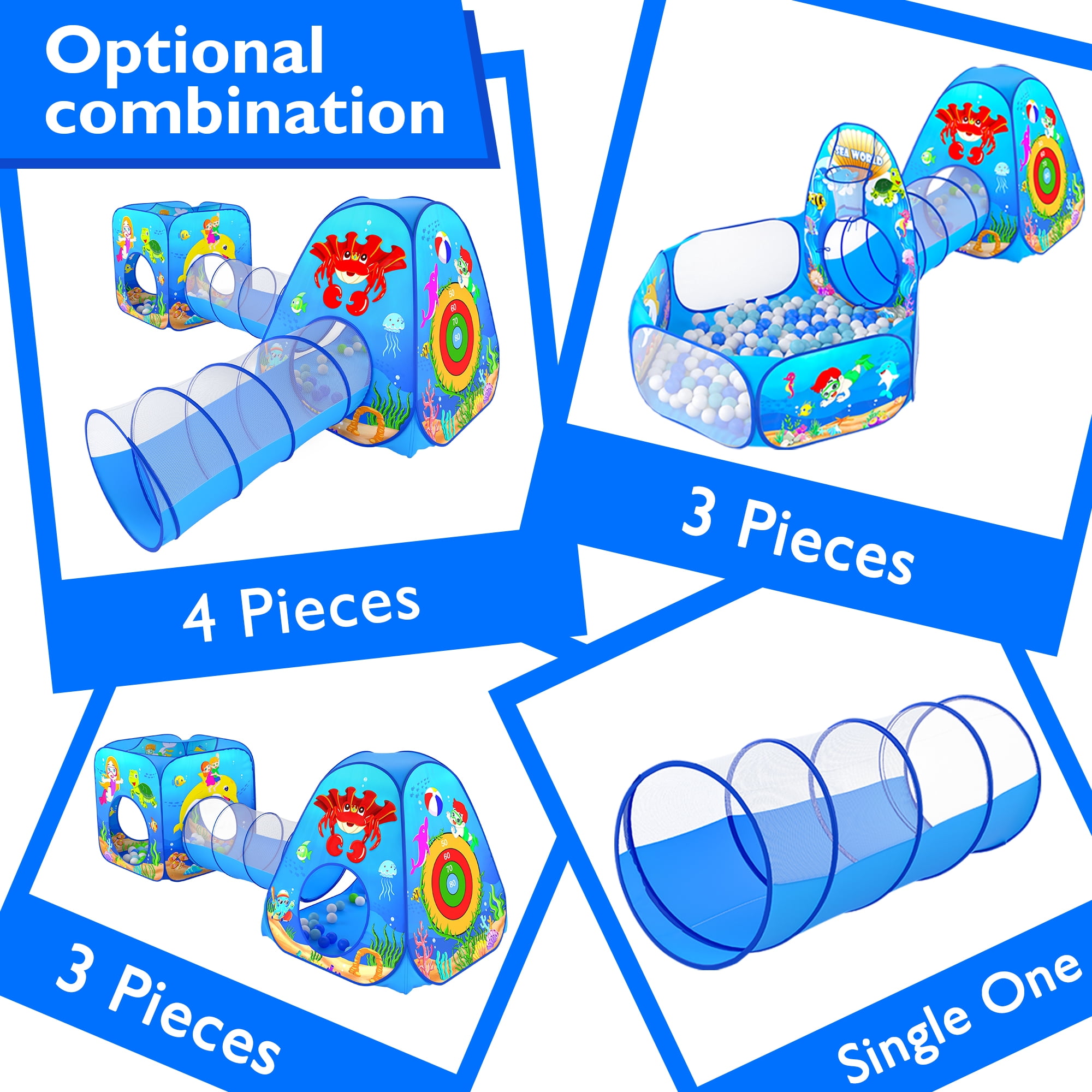 Let Your Kids Roam: This ball pits for toddlers comes with 3 pop up kids play tent and 2 length tunnels for kids to crawl through, there’s enough space to meet toddler’s demand Premium Materials: This foldable child playhouse tent is made of breathable 190T soft polyester fabric which could give kids the safest enjoyable experience Easy to Carry: Ball pit play tent pops open in seconds and it can be easily folded into storage bags for easy transportation Enhances Hand-eyes Coordinations: Pop up tent for toddlers could hone their accuracy, hand-eye co-ordination and hit the highest score, great for next-level, super active playtimes Multi-scene Usage: The 5 in 1 kids play tunnel tent can be put in indoor & outdoor. It can be put in yard, garden, apartment, bedroom, living room, school, party, picnic, etc Great for Both Boys and Girls: This funny kids tent will make a great gift idea to all kids on Birthday, Christmas Day, Thanksgiving Day, Halloween as a surprise gift