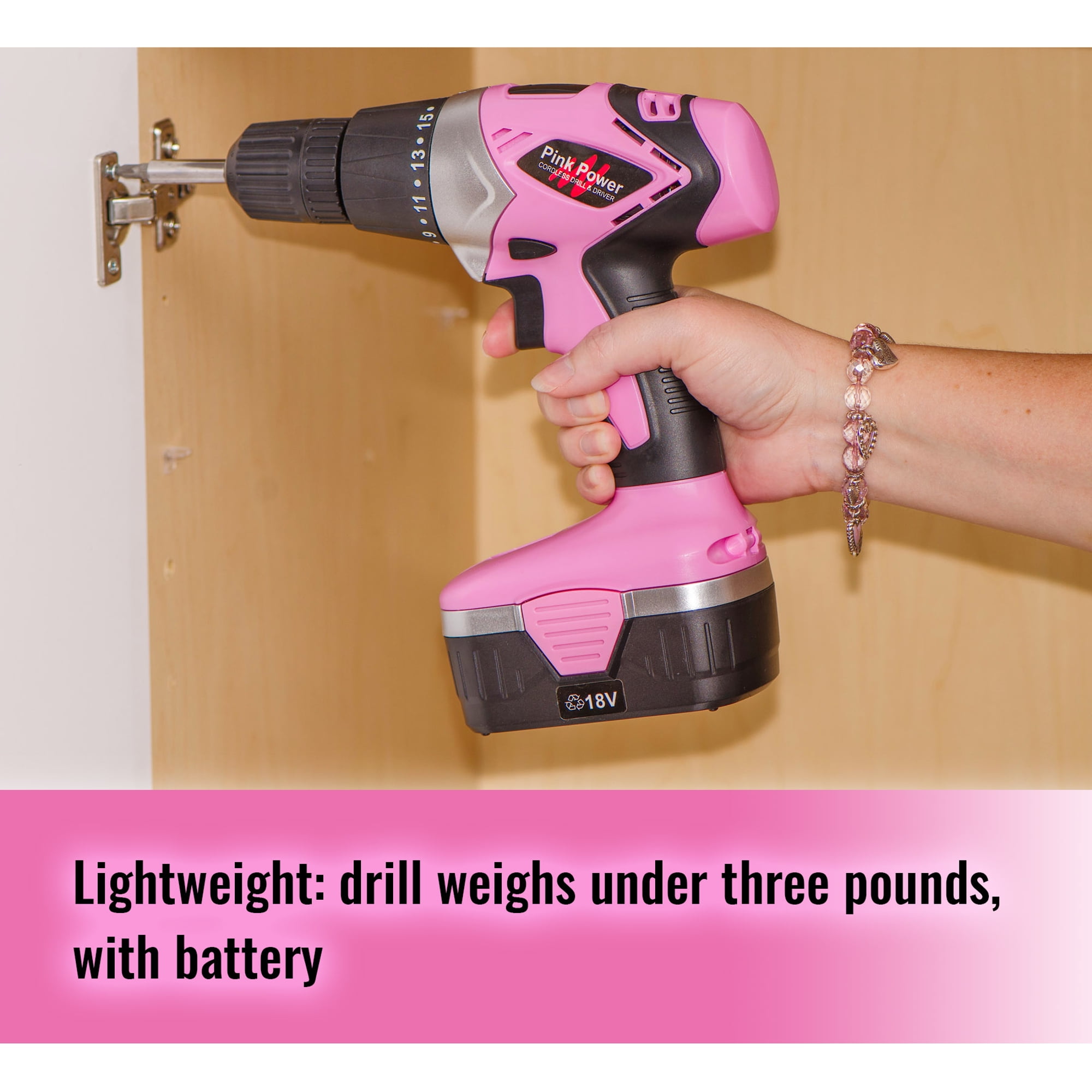 All inclusive power tool set: Each pink tool kit includes (1) PP182 18V NiCad power drill, (2) NiCad 18V batteries, (1) PP481 3.6V electric screwdriver, (1) tool case, a battery charger specific to each tool, a drill bit set, and a full three-year warranty. Trigger activated led light for dark workspaces: The 18V compact, cordless drill driver features a built-in LED light that activates when triggering the drill. The two speed settings help improve accuracy while the magnetic base is perfect for holding loose screws or bits. Lightweight with soft grip handle: The PP182 electric drill weighs just under 3.5lbs, with the battery, so it is easy for anyone to use. The perfect addition to any hand tool or power tool set. Battery gauge shows remaining power level: Each 3.6V cordless electric screwdriver weighs less than 12 ounces and comes with a 12 piece bit set. The trigger activated LED work light and 200 RPM motor will help you start any home improvement project, while the built-in battery gauge shows remaining power level so you’re never surprised by a low charge. Pivoting handle for tight workspaces: The PP481 power screwdriver features a patented pivoting head which enables it to fit into tighter workspaces. Use as a right-angle screwdriver (pistol grip), or press a button on the handle to rotate the unit straight.
