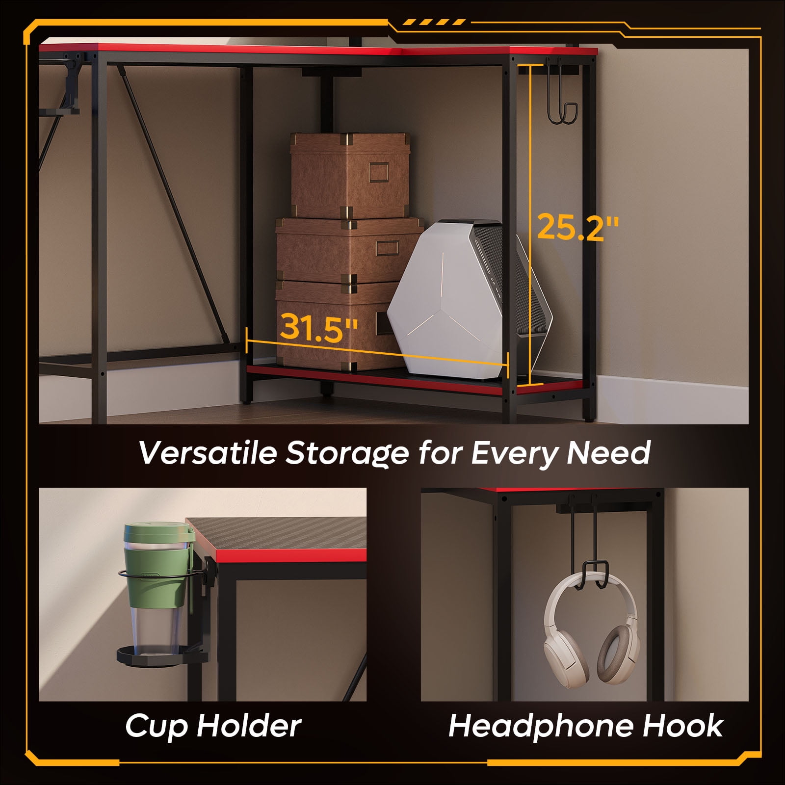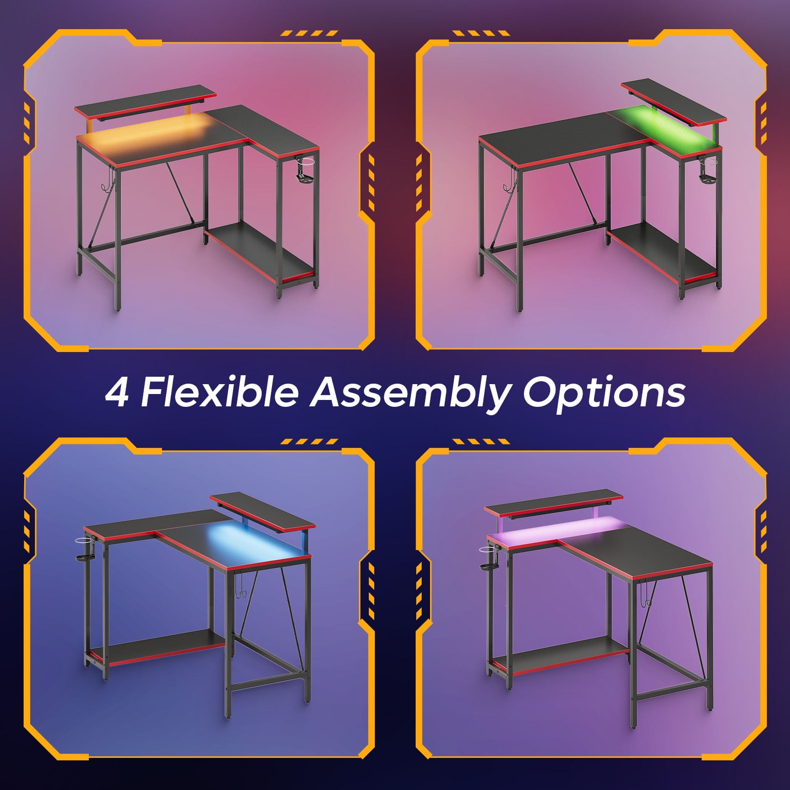 Pinmoco 42″ Reversible L-Shaped Gaming Desk with Monitor Stand, LED Lights& Headset Hooks, Home Office, Carbon Fiber Black Ergonomic Monitor Stand: Adjustable monitor stand, elevating your screen to eyes level for better posture, make your neck and spine more health. RGB Lighting: Offering 7 primary colors and up to 20 dynamic modes, let the vibrant lights relax your life, boost your happiness. Reversible and Flexible: Our L-shaped desk designed with a reversible layout, can be freely combined according to your different needs to maximize space efficiency. Multi-Function Storage Space: The spacious 42″ desktop offers ample room for essential items. A practical under-desk storage shelf that accommodates files, books, even your PC tower, maintaining a clutter-free workspace. On the side, you’ll find a hook for headphones and a foldable cup holder, ensuring easy access to beverages and accessories at your fingertips. Sturdy and Durable: Crafted from premium P2 particleboard, our corner desk blends durability with water and scratch resistance, ensuring lasting quality in any setting. Reinforced Legs and Adjustable Leveling Pads: This practical design can make the desk stay stable in any situation, enhance overall stability and reliability for your workspace. Easy Assembly: Designed for quick and hassle-free assembly, it’s easy to put together in 30 minutes.