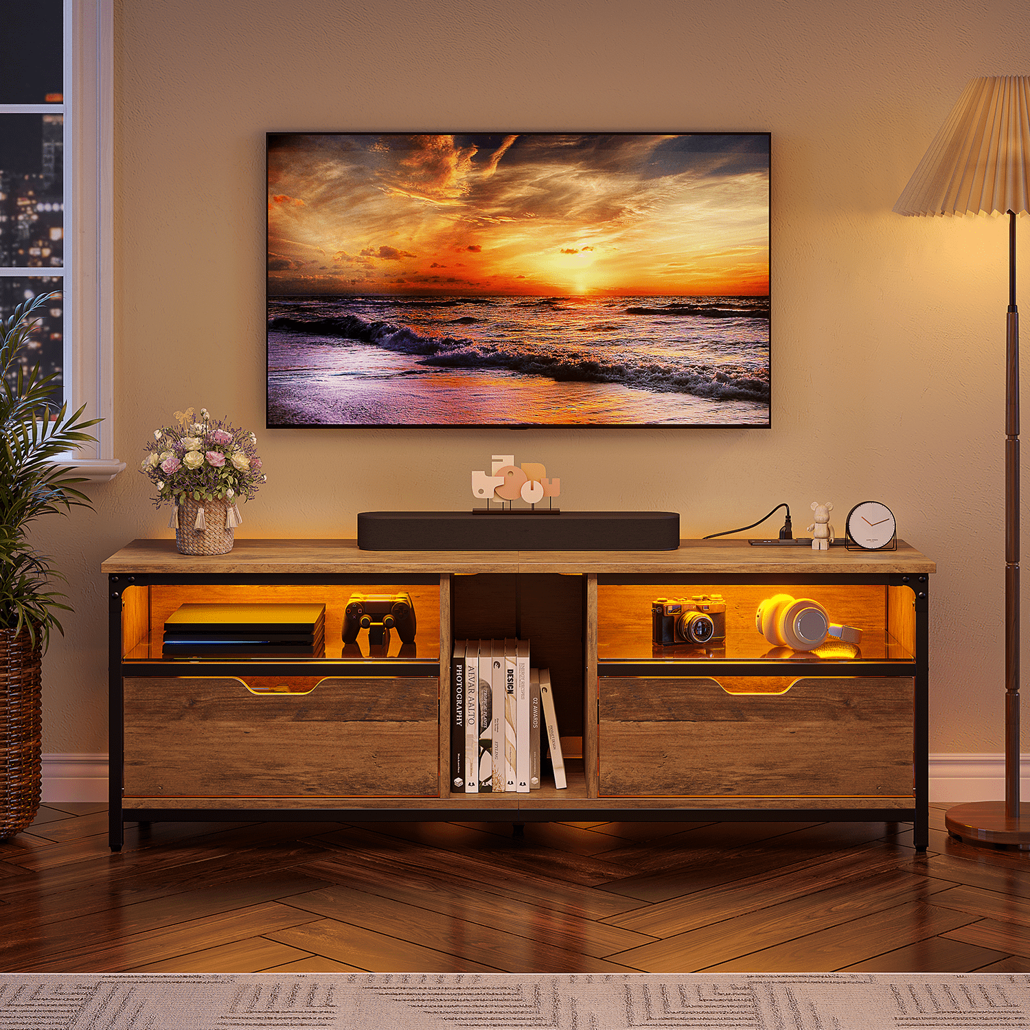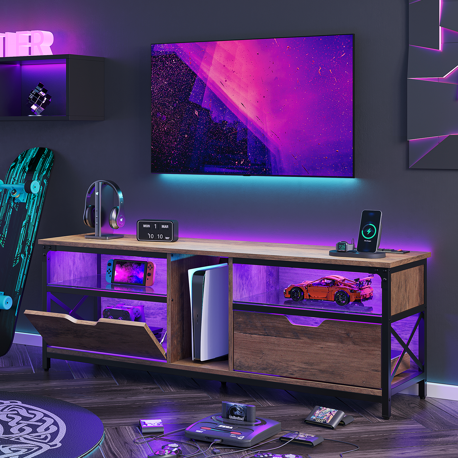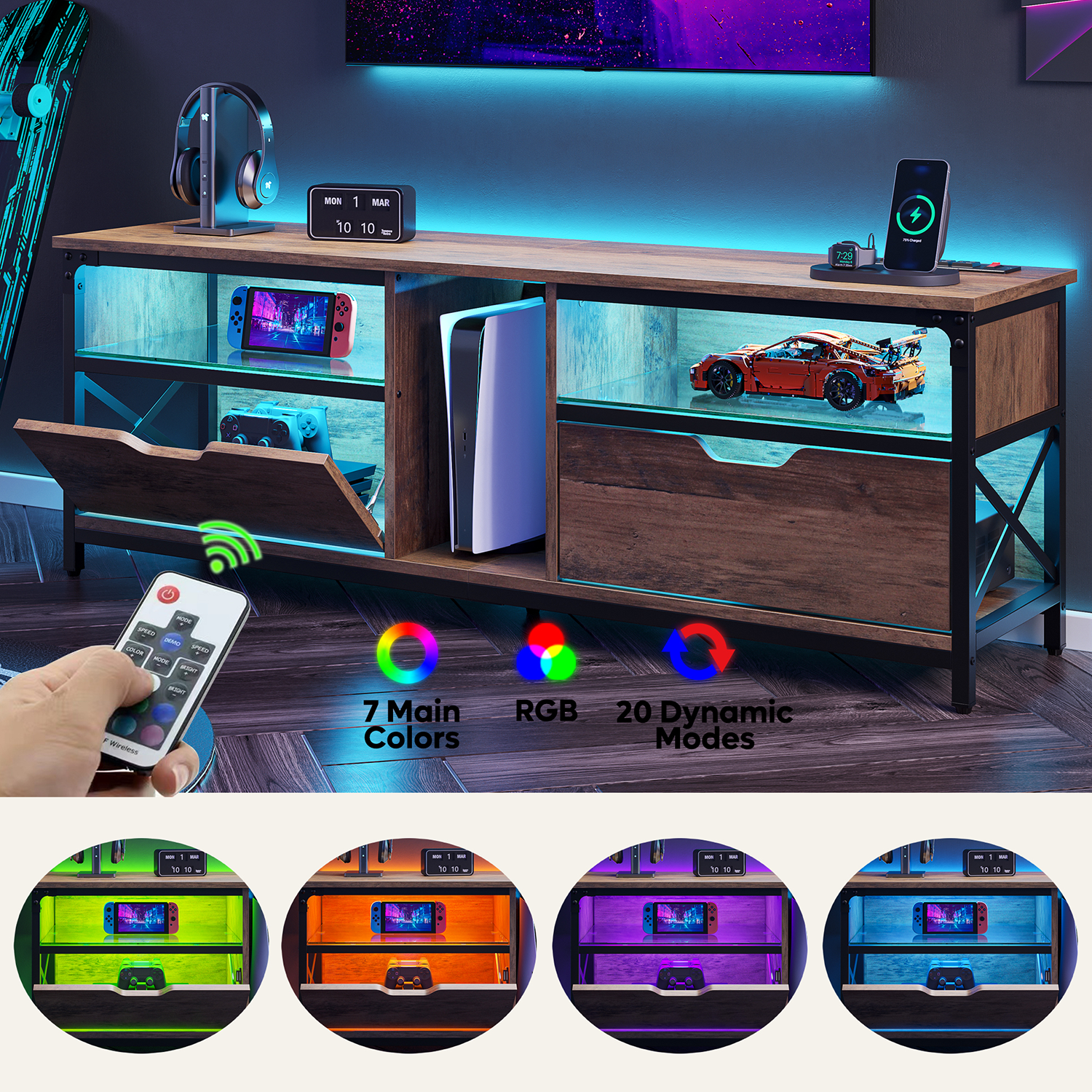 Pinmoco LED TV Stand for 30-70″ TVs, Media Console with Glass Shelves, Rustic Oak Gaming LED TV Stand: Pinmoco TV stand is equipped with 20 colors of RGB LED lights, suitable for 30-70 inch TVs, creating a cool and casual atmosphere for you to satisfy your gaming experience. Stylish Design: LED lights are decorated with glass to achieve the ultimate lighting display effect. In addition, you don’t need to worry about its quality. The 5mm glass is enough to place entertainment equipment such as XBOX and is easy to clean. Super Storage Space: The gaming entertainment center with multiple large storage compartments fits for you to store your PS5, XBOX and other game equipment, magazines, DVDs, etc. Extremely Environmentally Friendly and Durable: The LED TV stand is made of high-performance P2-grade wooden boards. The stable material is combined with the iron frame at the bottom to create a safe TV stand for living room or bedroom. Convenient Assembly and High-quality Experience: It is easy to assemble the Pinmoco TV cabinet in a short time, and Pinmoco always provides excellent customer service.
