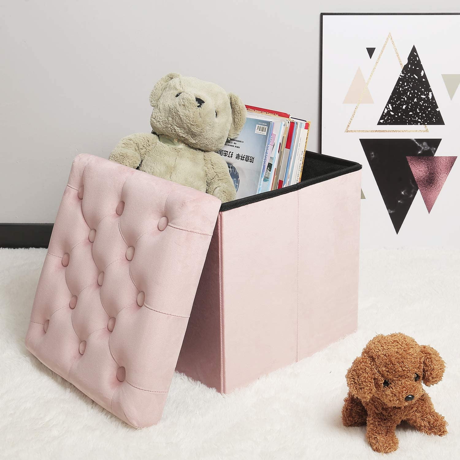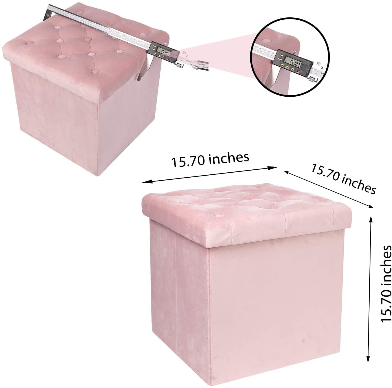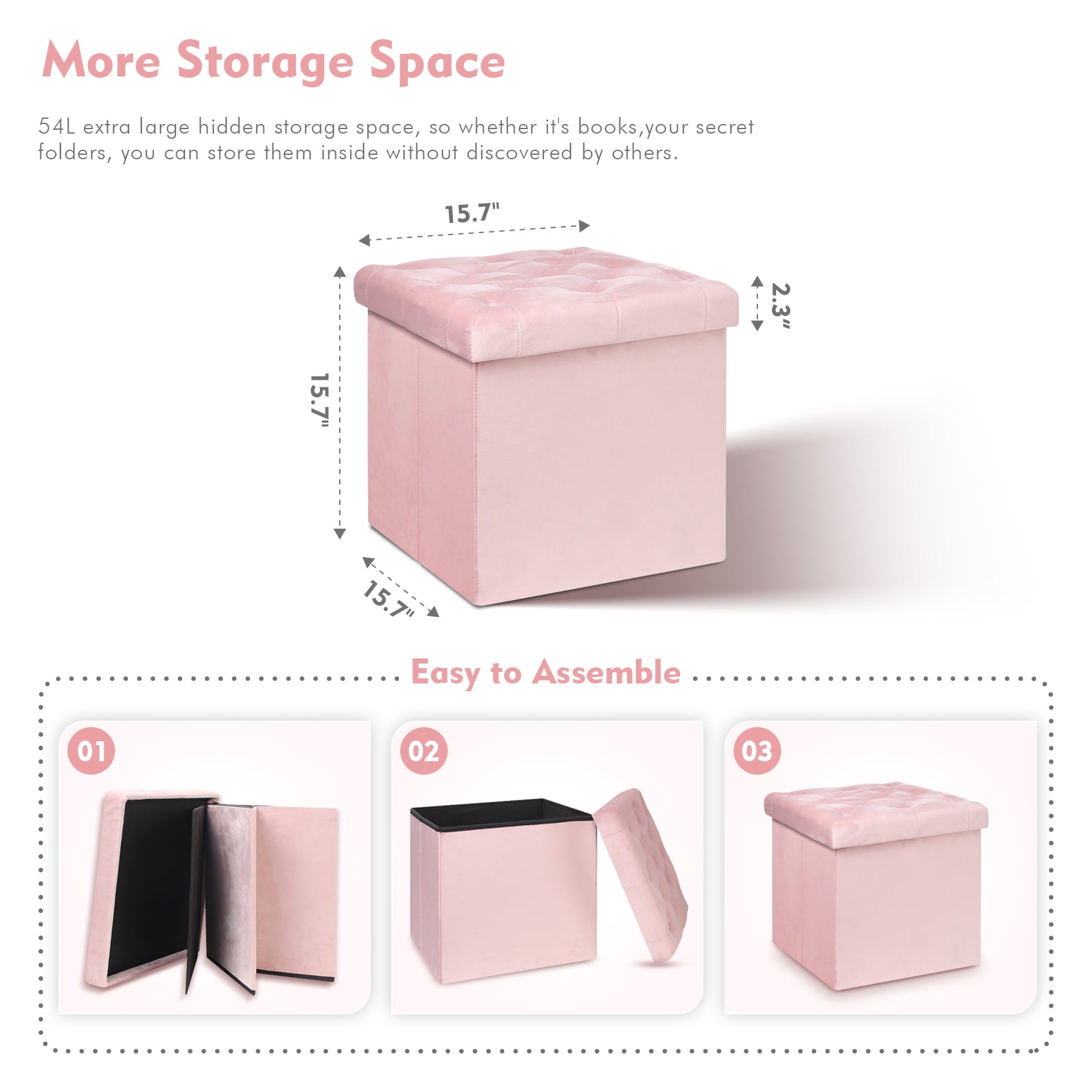 About: Fuzhou Bailey Furniture Co.LTD.The main folding storage stool. Our folding ottoman can be used as storage organizer, resting bench, shoe bench, footrest stool, Coffee table etc. They are suitable for various places, like home, store, office and also recreational vehicle. Description: Color :Pink Material :P2 (MDF),Velvet Seating Board Thickness : 0.24?(6mm) Bottom and Side Board Thickness:0.12??3mm? Seat Filling Material: 0.12??3mm? Dimension:(LxWxH):15.7?x15.7?x15.7?(40x40x40cm) Weight:15.6Lbs (7.07kg) Shipping List: 2xFolding Storage Ottoman