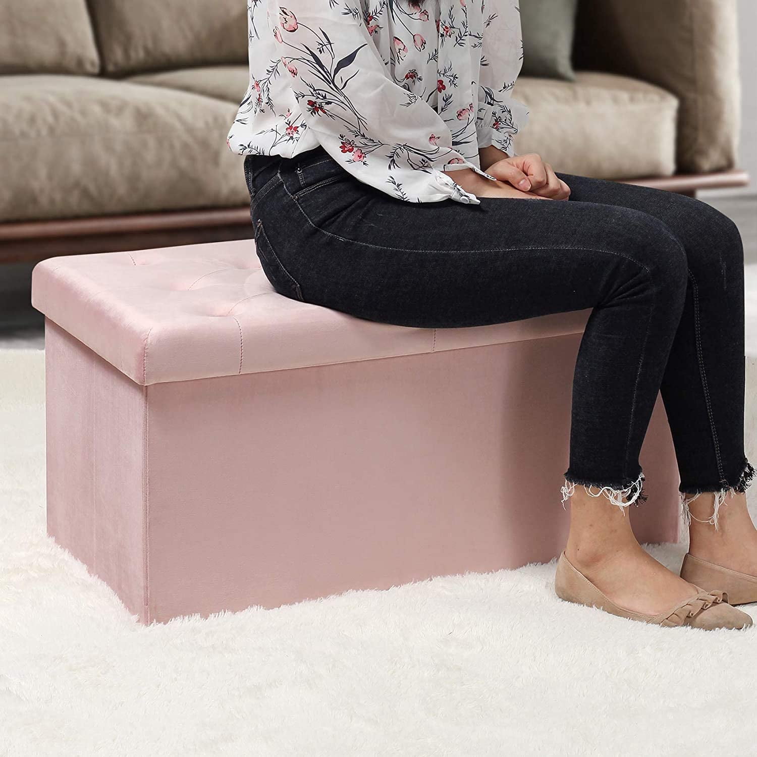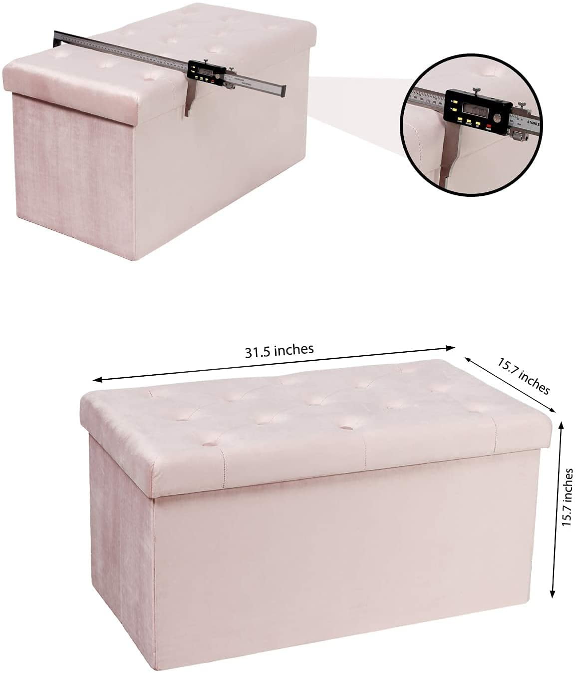 【DESIGN】 The luxurious feel of the velvet upholstery is comfortable and inviting. This ottoman is both soft and stylish, for luxurious look and feel. 【FOLDABLE & EASY TO ASSEMBLE】 it’s easy to assemble,set up only takes seconds. Unfolding, position base piece and cover. It’s lightweight folding design allows you to store this ottoman away when not in use. 【SUPER STURDY】 It’s sturdy, Constructed by MDF, static load-capacity up to 550Lbs (250KG) (static load capacity). 【STORAGE SPACE & Multifunction】 Extra large volume is sufficient to meet various needs; you can place it in your bedroom, living room, hallway or utility room to organize books, clothes, blankets, shoes and many other sundries. 【FSC-Certified】The frame of the lid, barrel body, and bottom plate is made of FSC-certified wood. Open Size:31.5″L x 15.7″W x 15.7″H (80 x 40 x 40 cm) Folding size:31.8″L x 3″W x 16.5″H (81 x 7.5 x 42 cm) Product Weight:12.5 Pounds Material:Velvet、MDF Color:Pink Please make sure the lid is properly closed before you sit on it. Please do not stand on this product to avoid accidents. This product is not a toy, please do not let children play, so as to avoid accidents.