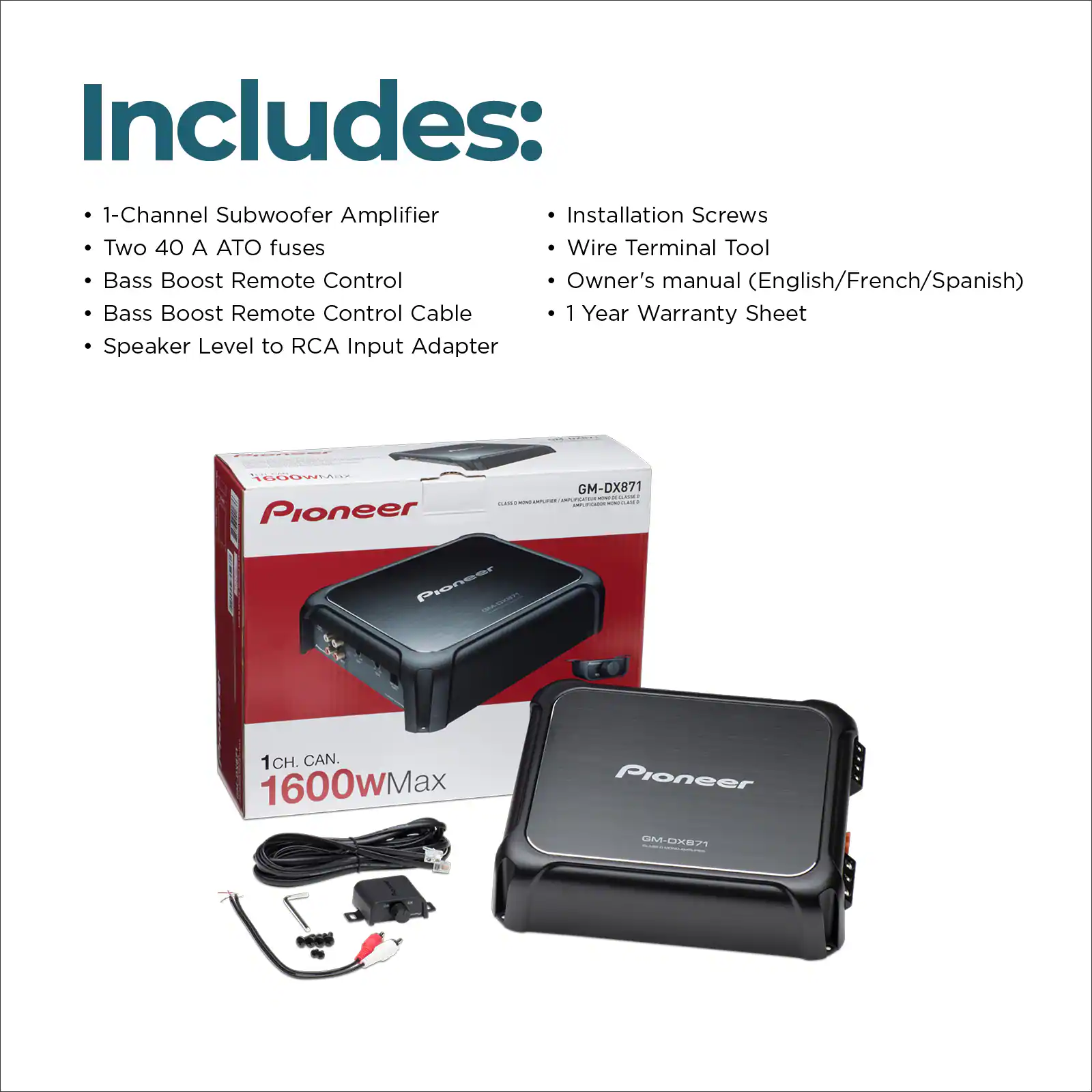 The GM-DX871 mono subwoofer amplifier can deliver up to 800 watts RMS to your subwoofer, for powerful bass that will give every song a strong and heavy beat. Highly efficient Class D technology keeps this powerful amp running as cool as it looks, and allows for a small chassis that fits in a lot of out of the way spaces.