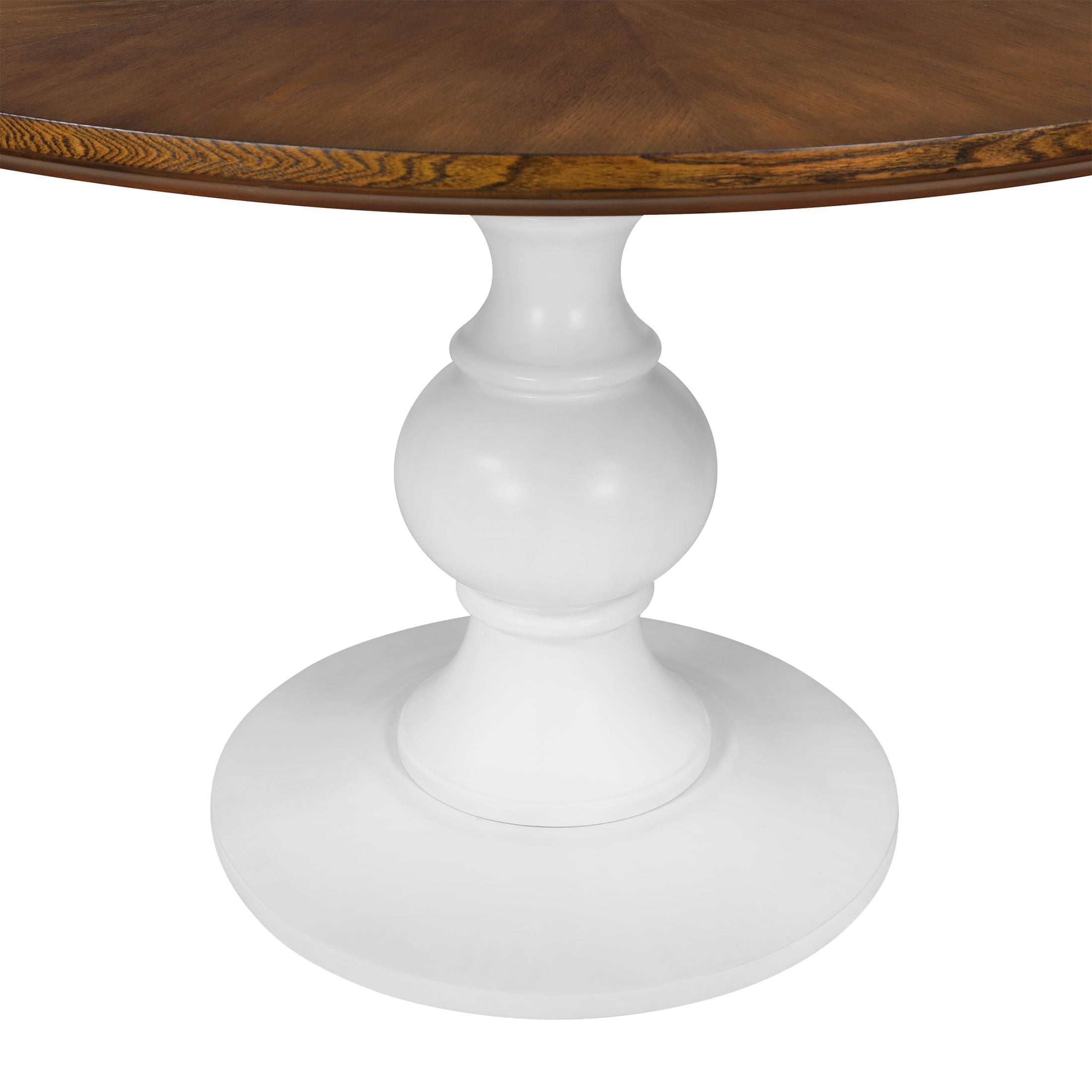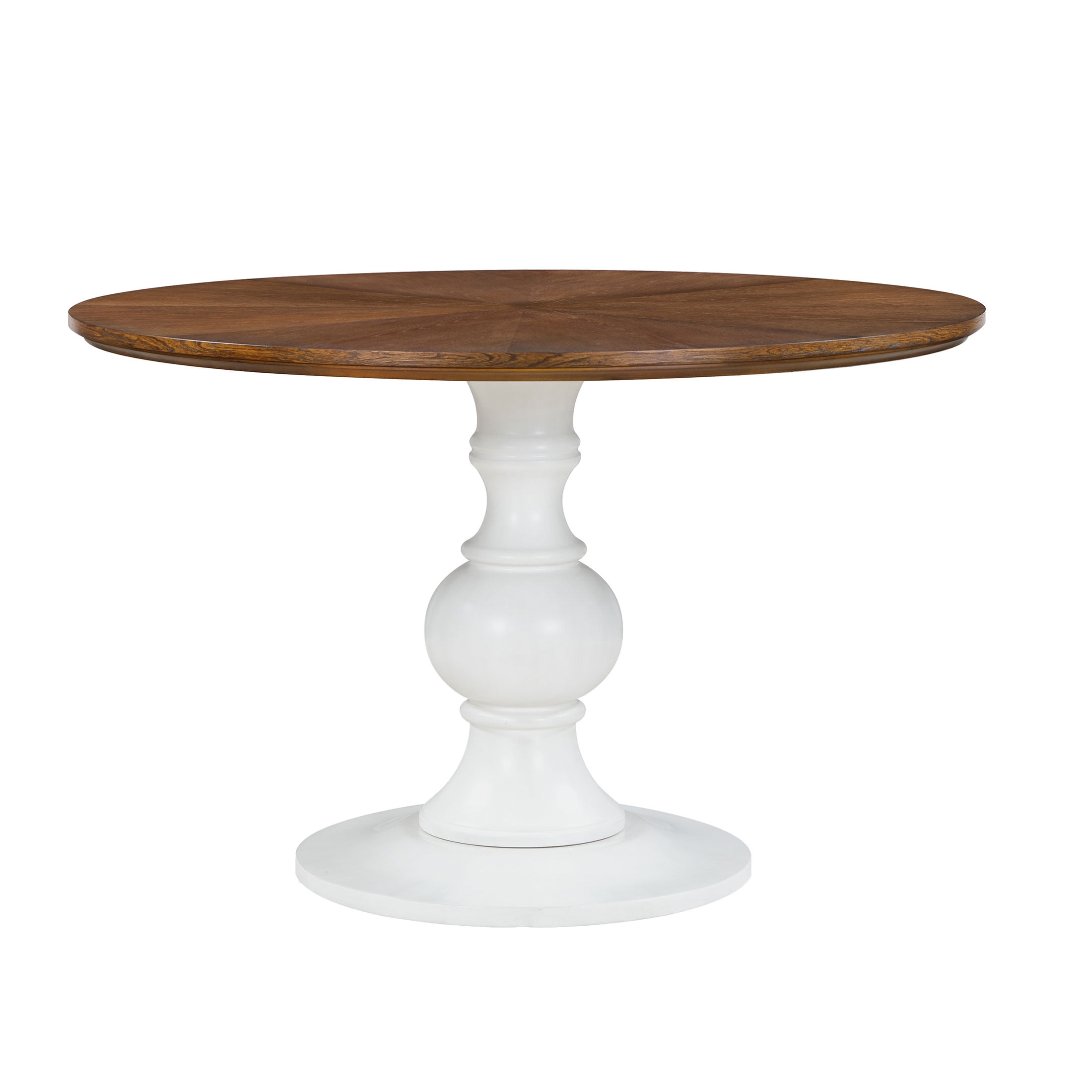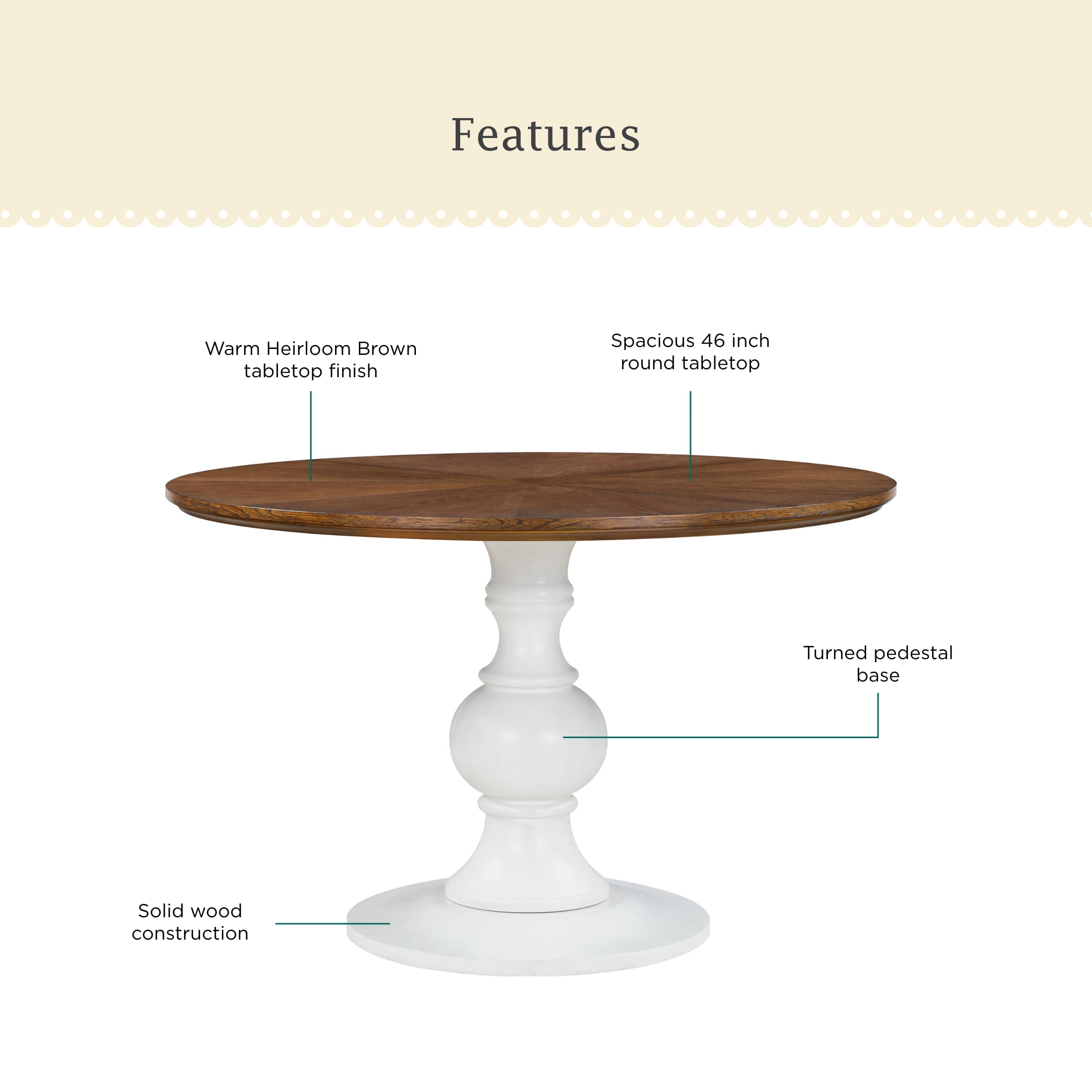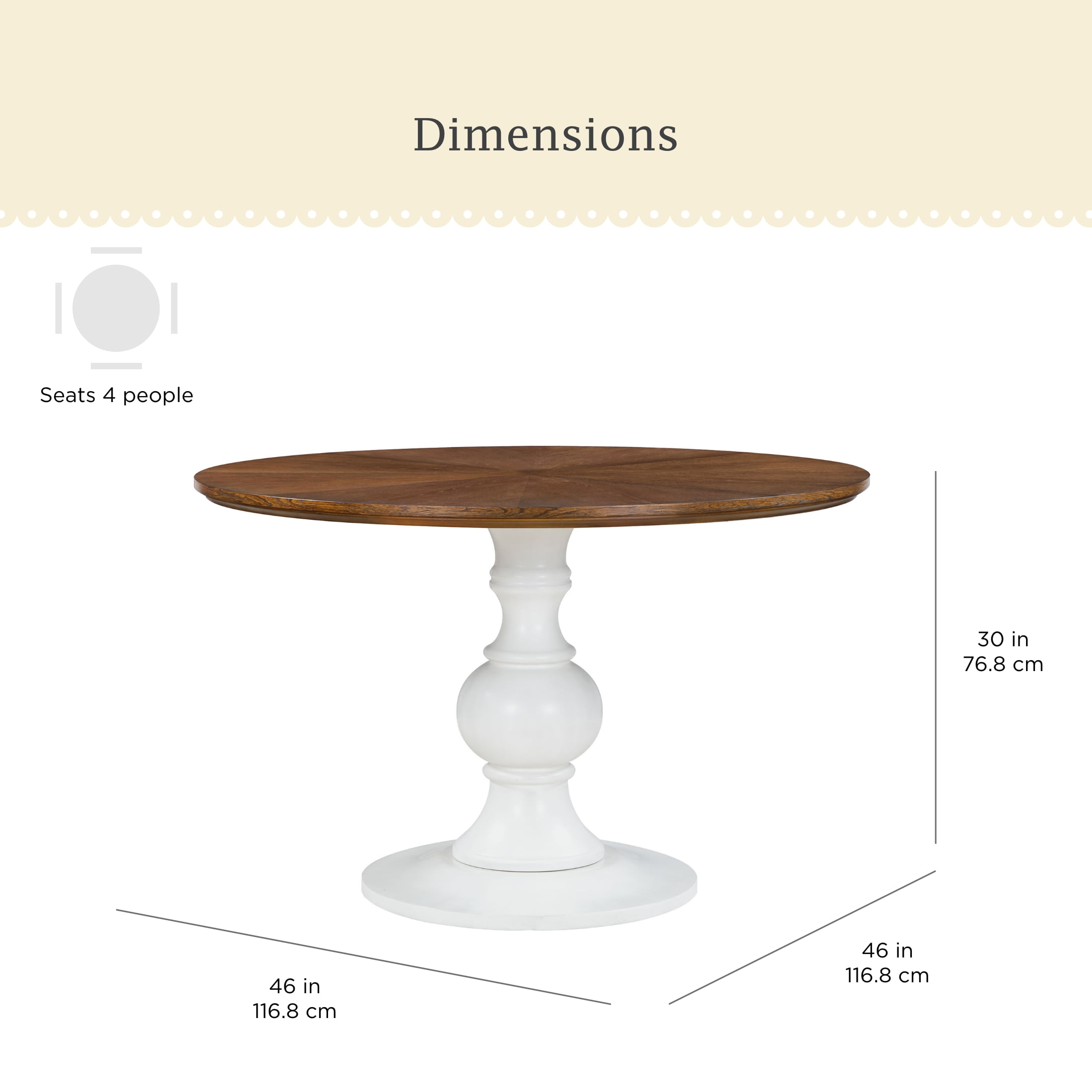 Solid Wood Construction: Durable and long-lasting Spacious Tabletop: Perfect for dining, working, and entertaining Comfortably Seats 4: Ideal for family meals and gatherings Turned Pedestal Base: Adds a touch of elegance and stability Available in Two Finishes: Choose from white or homestead brown to match your decor Product Dimensions: 46 IN W x 46 IN x 30 IN (116.8 CM x 116.8 CM x 76.8 CM) Product Weight: 88.2 lb Box 1 Dimensions: 51 IN x 50.625 IN x 6 IN Box 1 Weight: 85.5 lb (38.8 kg) Box 2 Dimensions: 14 IN x 13.75 IN x 29.25 IN Box 2 Weight: 30.6 lb (13.9 kg) Model# PW1425004710036, PW1425004710074