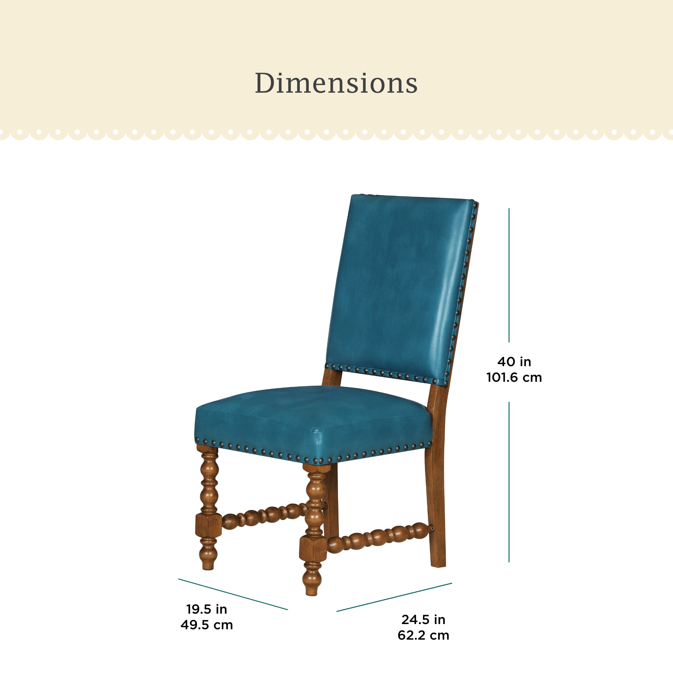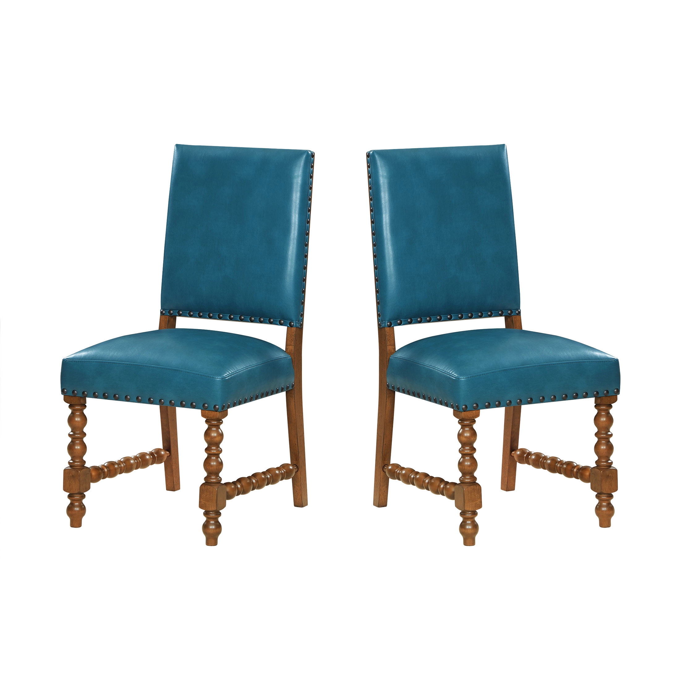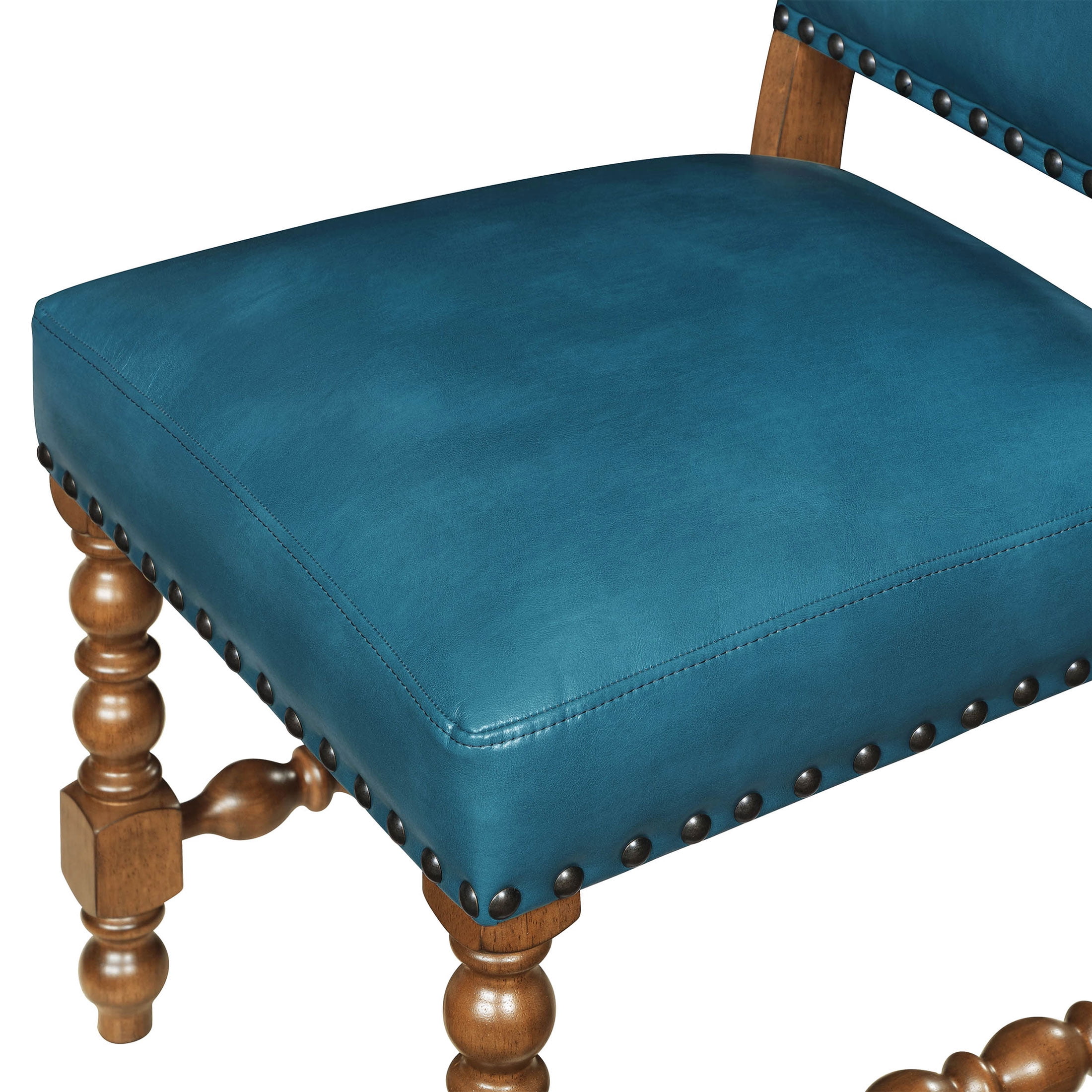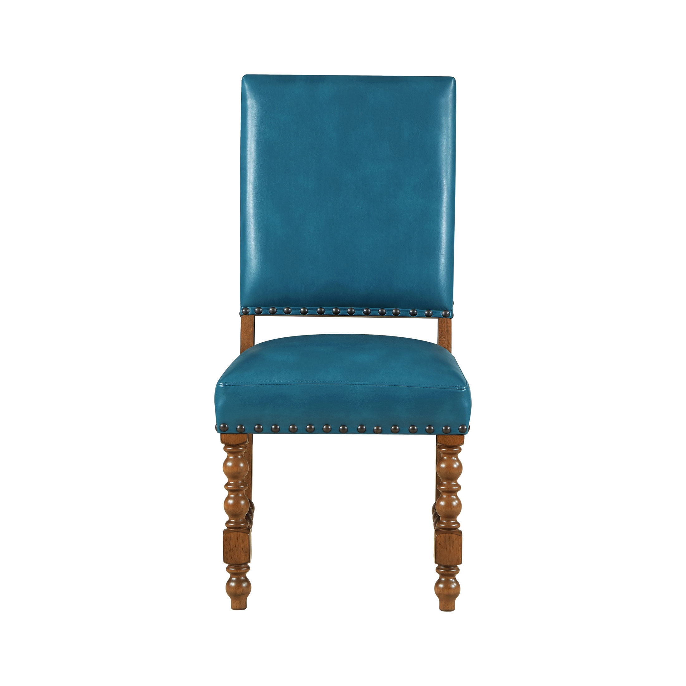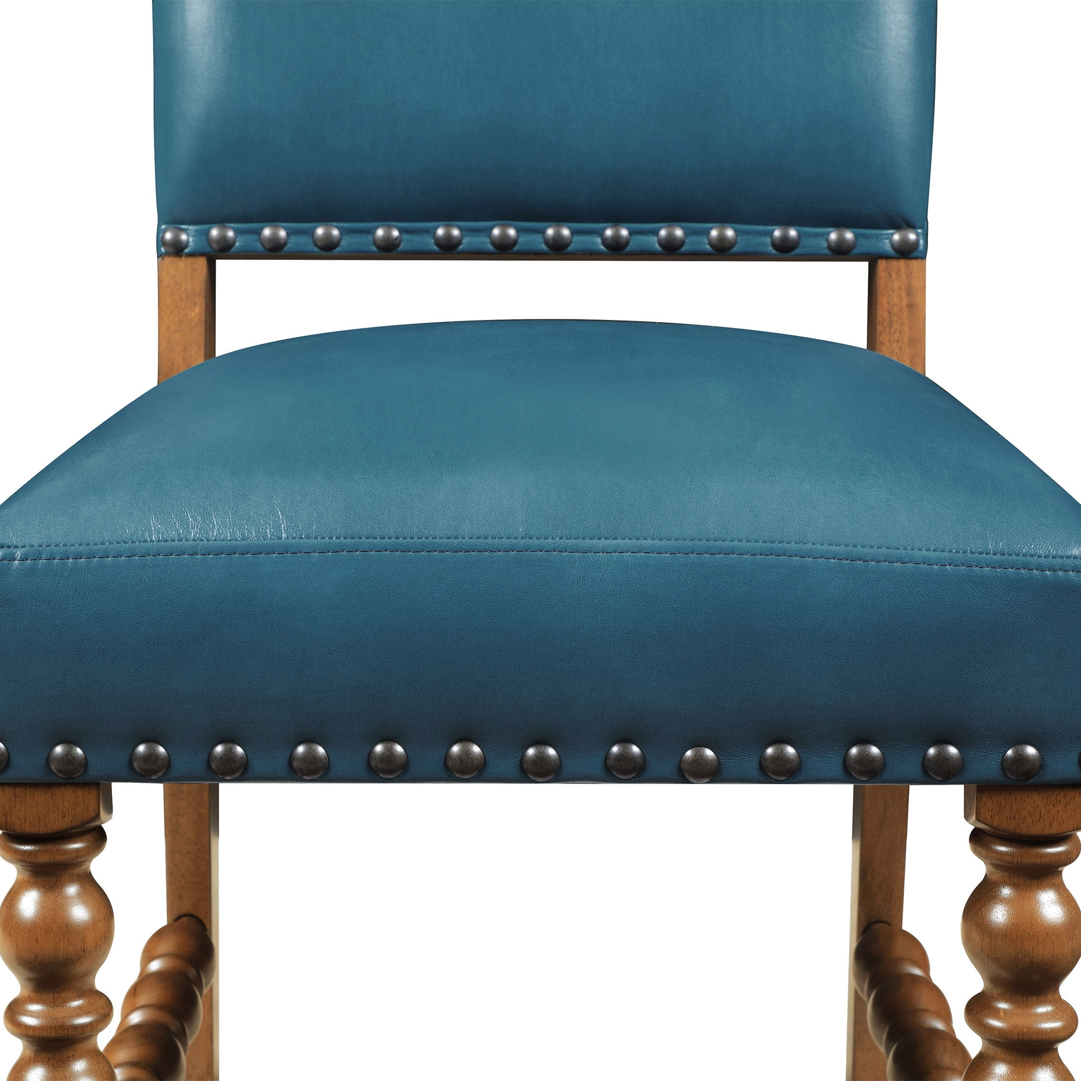 Set of 2 Chairs: Ideal for dining rooms or kitchen dining areas Deep Turquoise Faux Leather Upholstery: Adds a vibrant, stylish touch to any dining space Solid Wood Construction: Ensures lasting durability and stability Spindle Style Front Legs: Enhances the traditional farmhouse aesthetic Nailhead Trim: Offers a sophisticated, polished look Comfortable Seating: Perfect for family meals and entertaining guests Easy to Assemble: Hassle-free setup so you can enjoy your new stools quickly Product Dimensions: 19.5 IN W x 24.5 IN D x 40 IN H (49.5 CM x 62.2 CM x 101.6 CM) Product Weight: 52.9 lb (23.9 kg) Packaging Dimensions: 42.25 IN x 21.25 IN x 14.375 IN Packaging Weight: 48.9 lb (22.1 kg) Model# PW1425004710042