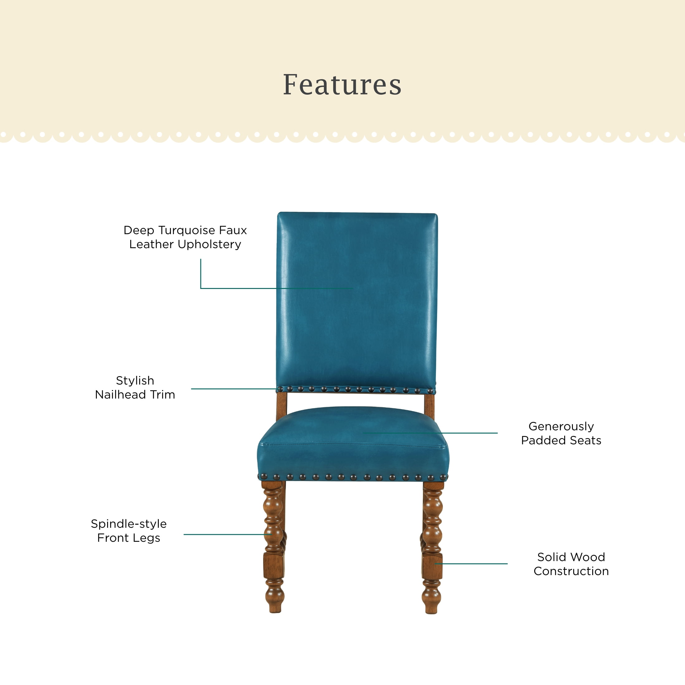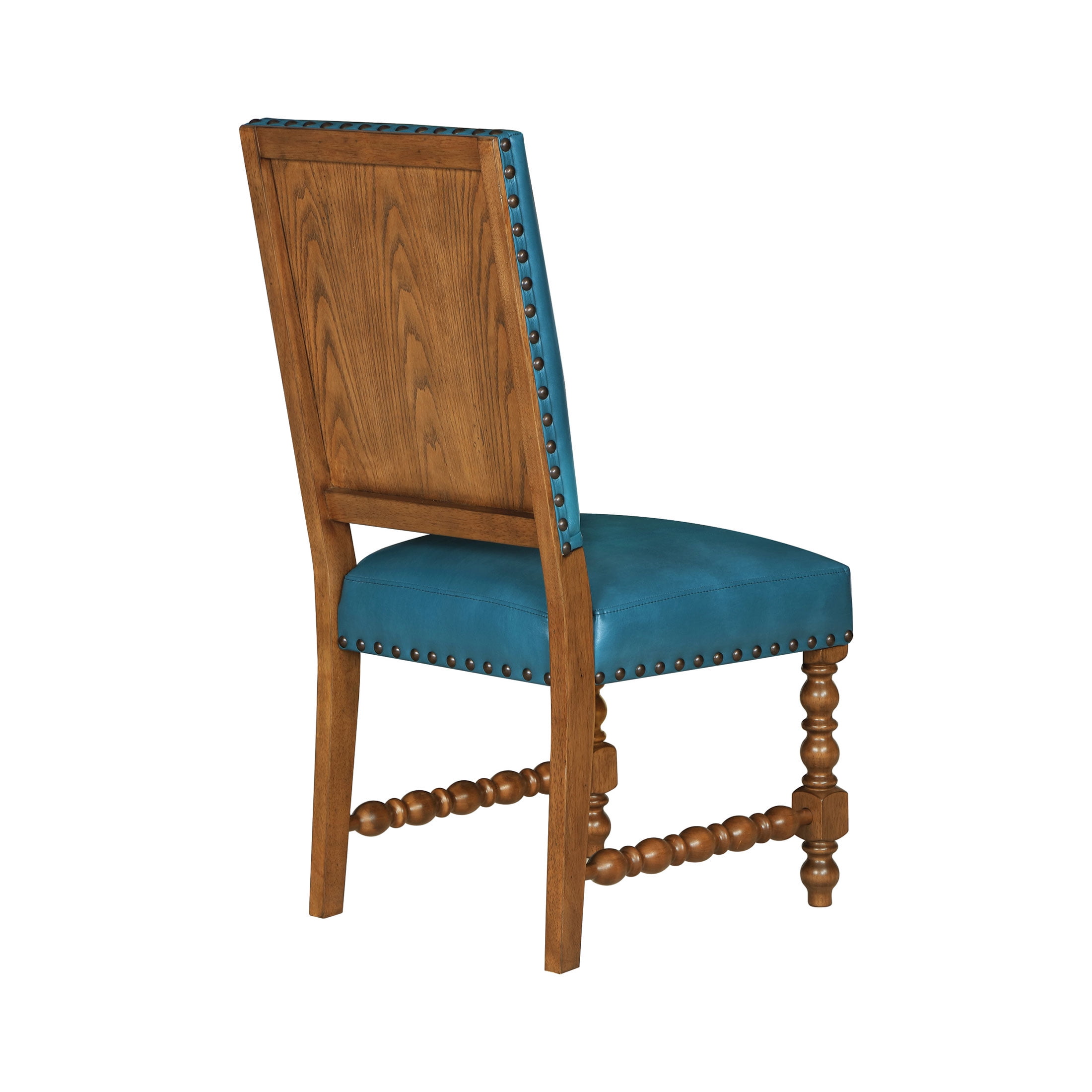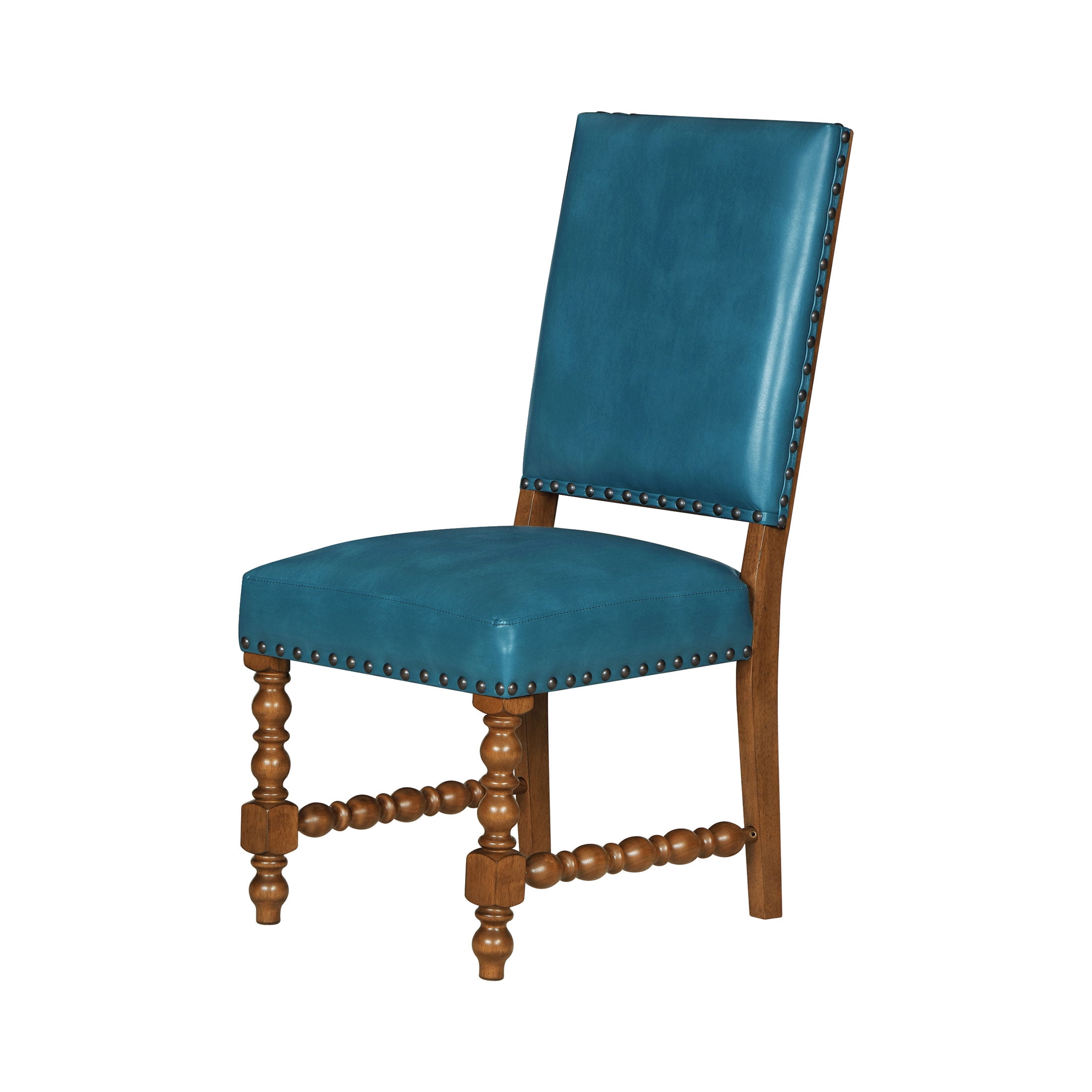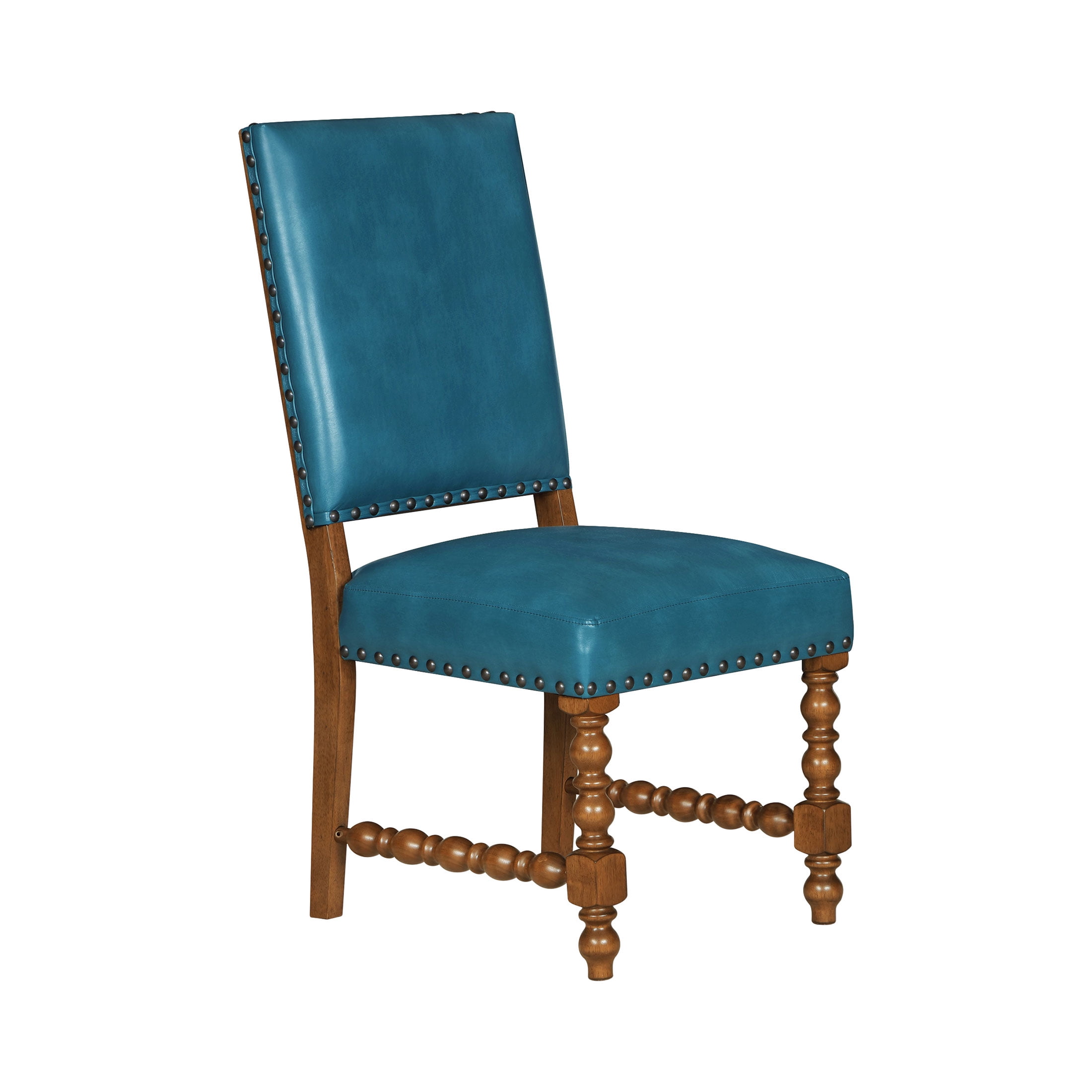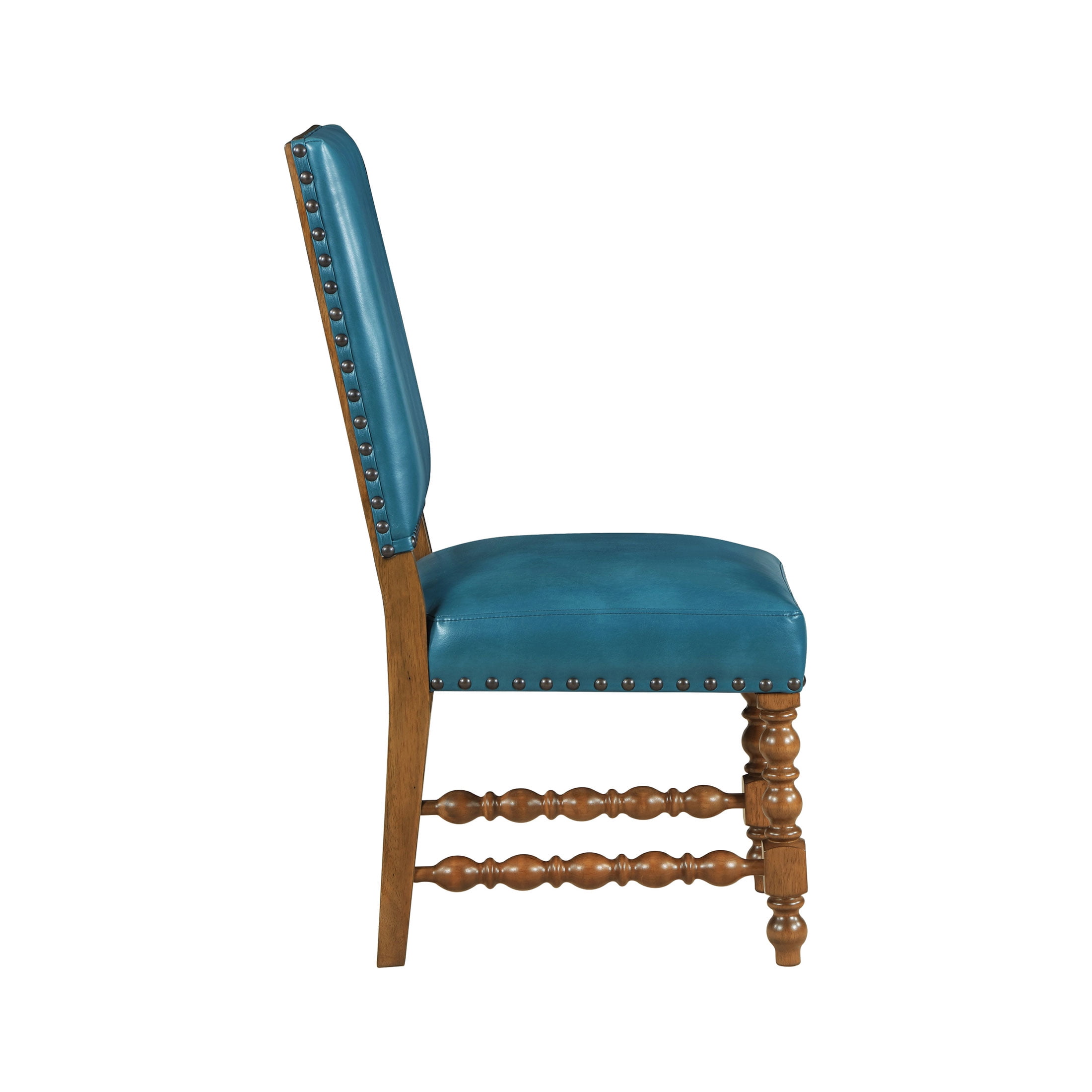 Set of 2 Chairs: Ideal for dining rooms or kitchen dining areas Deep Turquoise Faux Leather Upholstery: Adds a vibrant, stylish touch to any dining space Solid Wood Construction: Ensures lasting durability and stability Spindle Style Front Legs: Enhances the traditional farmhouse aesthetic Nailhead Trim: Offers a sophisticated, polished look Comfortable Seating: Perfect for family meals and entertaining guests Easy to Assemble: Hassle-free setup so you can enjoy your new stools quickly Product Dimensions: 19.5 IN W x 24.5 IN D x 40 IN H (49.5 CM x 62.2 CM x 101.6 CM) Product Weight: 52.9 lb (23.9 kg) Packaging Dimensions: 42.25 IN x 21.25 IN x 14.375 IN Packaging Weight: 48.9 lb (22.1 kg) Model# PW1425004710042