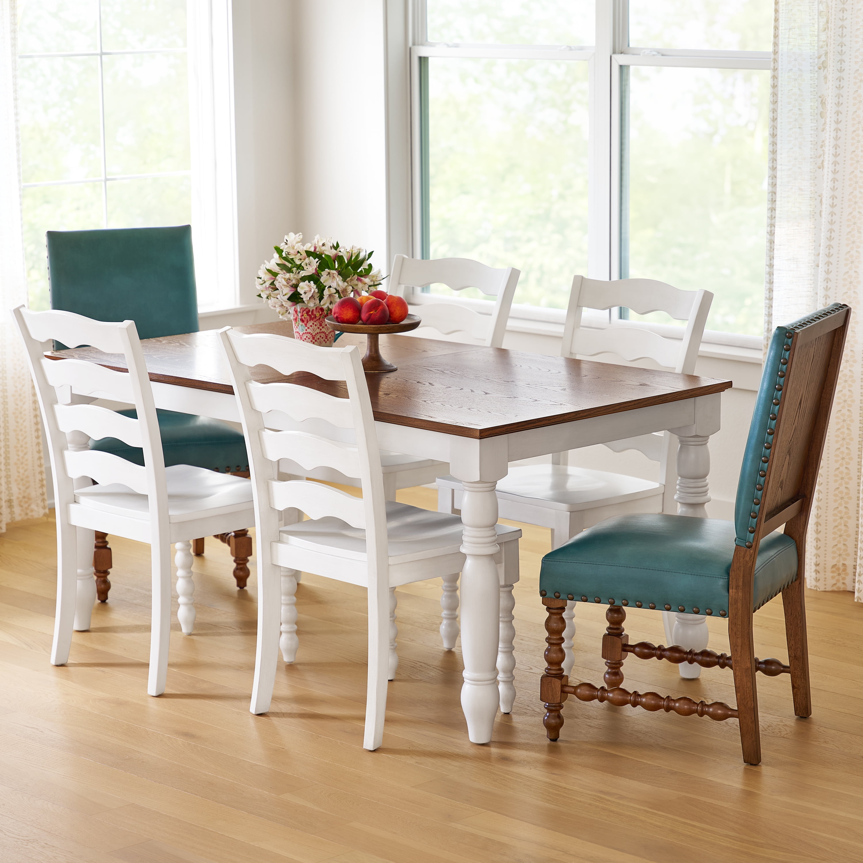 Bring a splash of color and a touch of elegance to your dining area with the Pioneer Woman Harper Faux Leather Dining Chairs. These charming chairs come in a set of two, featuring deep turquoise faux leather upholstery that instantly elevates any dining room or kitchen dining space. The solid wood construction ensures durability, making them a perfect choice for those who value both style and substance. The traditional farmhouse design, highlighted by spindle-style front legs and sophisticated nailhead trim, adds a timeless appeal to your home decor. Whether you’re hosting a dinner party or enjoying a cozy family meal, these chairs provide the comfort and support you need while making a stunning statement. Fans of the Pioneer Woman will appreciate the blend of classic design with a modern twist, perfect for creating a warm and inviting atmosphere. Meet Ree: Ree Drummond is an author, TV personality, social media phenom, and the woman behind the popular Pioneer Woman lifestyle blog that started it all. She’s also a lover of butter, basset hounds, Ethel Merman, her hunky, cowboy husband Ladd, and their four kids. Her casual country style and delicious recipes have made her a go-to for all things cooking and entertaining.